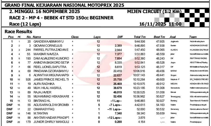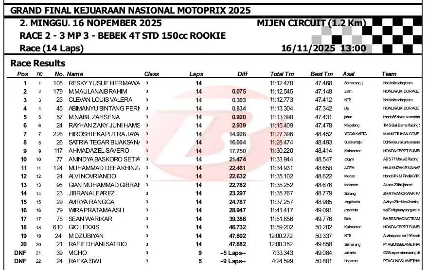 BalapMotor.Net – Berikut merupakan hasil Race 2 Grand Final Kejurnas Motoprix yang berlangsung di sirkuit Mijen, Semarang, Jawa Tengah pada Minggu 16 November 2025. (**)