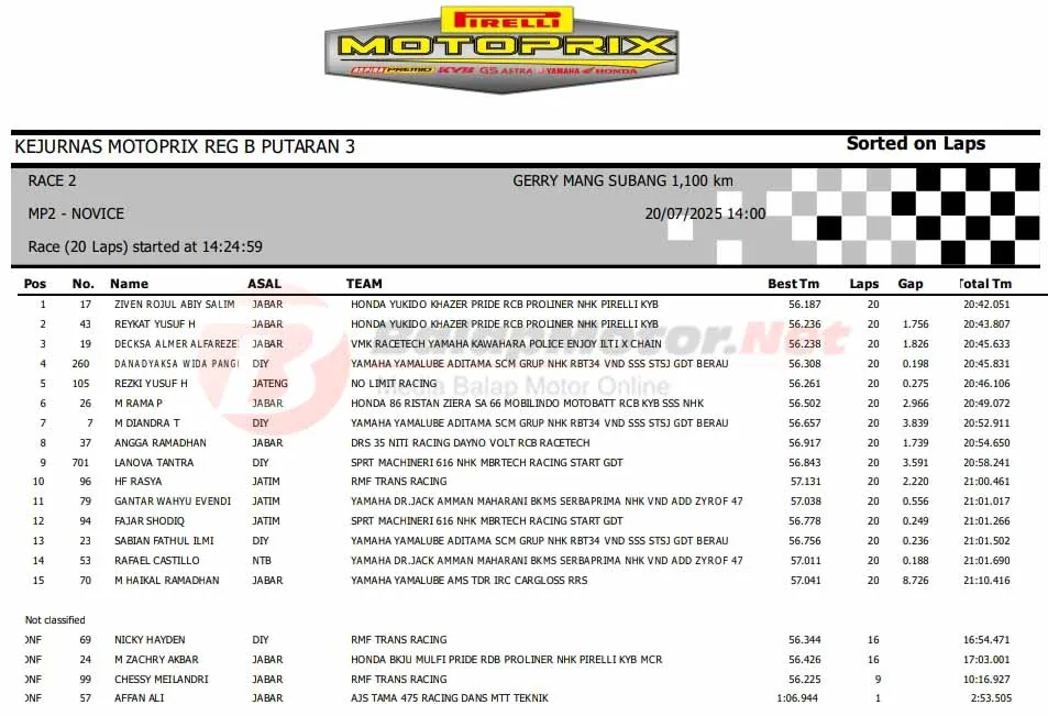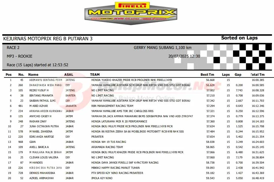 BalapMotor.Net – Berikut merupakan hasil Race 2 Kejurnas Motoprix Region B Seri 3 yang berlangsung di sirkuit Gery Mang, Subang, Jawa Barat pada Minggu 20 Juli 2025. (**)