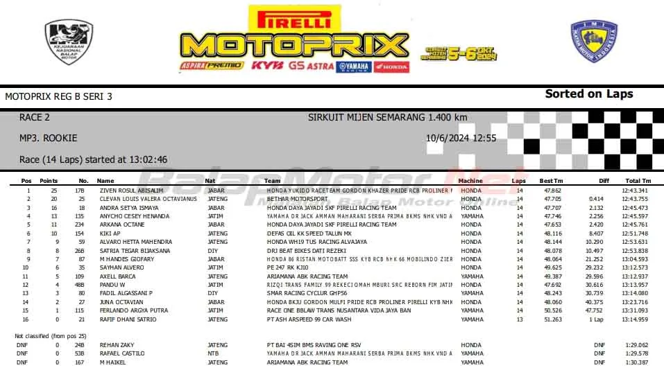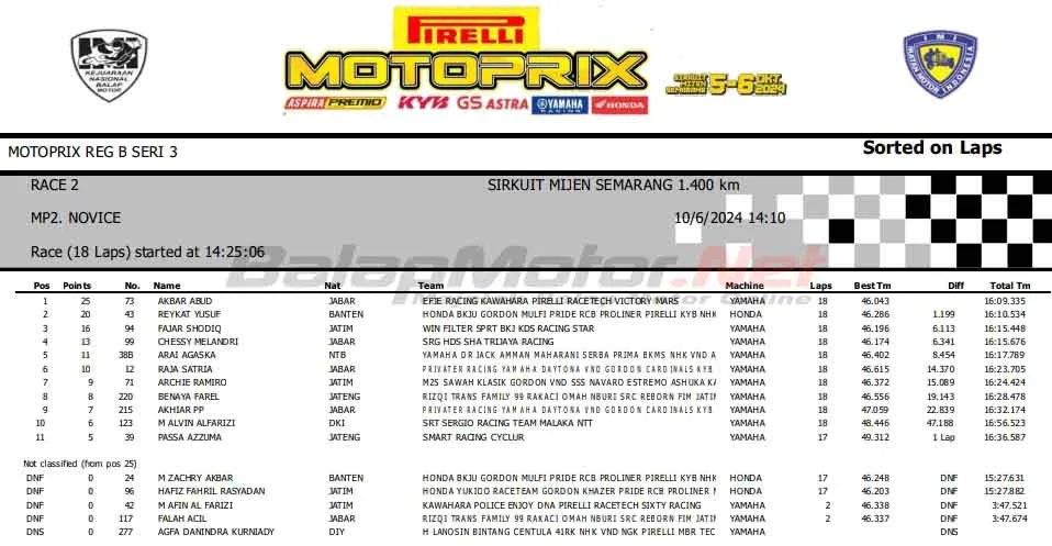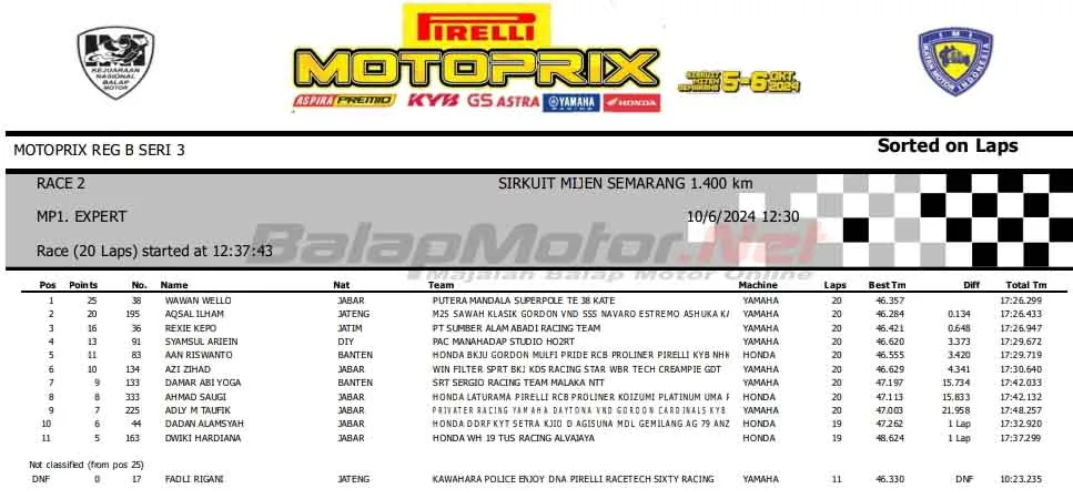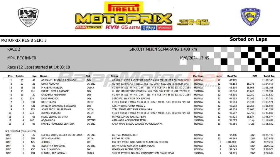 BalapMotor.Net – Berikut merupakan hasil race kedua ketegori kelas Kejurnas Motoprix Region B putaran ketiga yang berlangsung di sirkuit Mijen, Semarang, Jawa Tengah pada Minggu 6 Oktober 2024. (***)