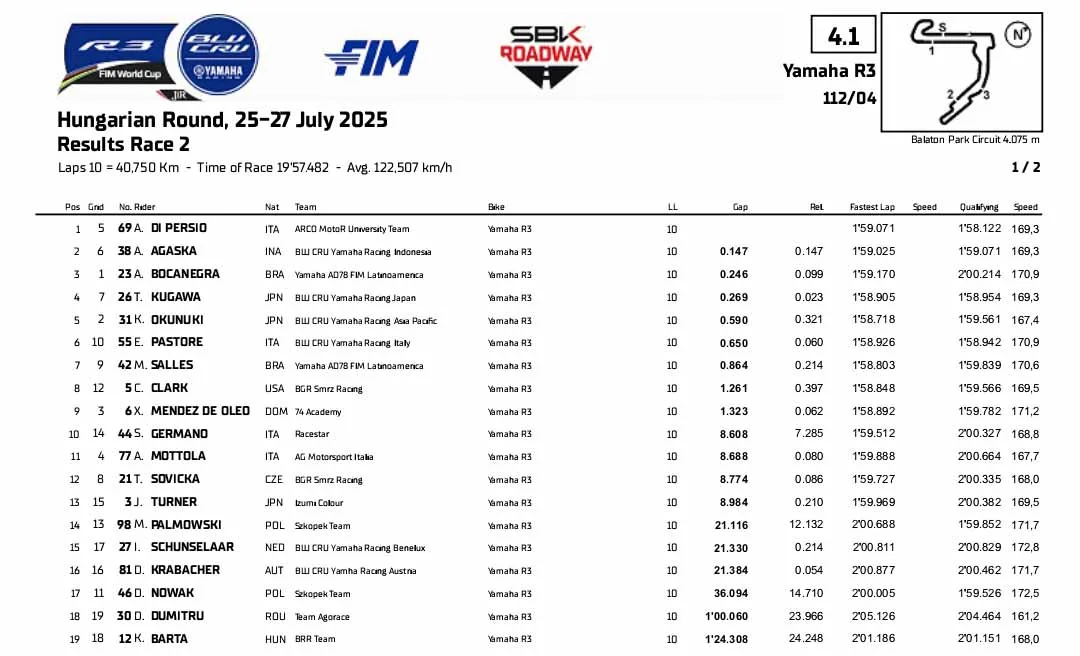 BalapMotor.Net – Berikut merupakan hasil Race 2 Kejuaraan Dunia Superbike, Supersport dan R3 bLU cRU World Cup yang berlangsung di sirkuit Balaton Park, Hongaria pada Minggu 27 Juli 2025. (**)