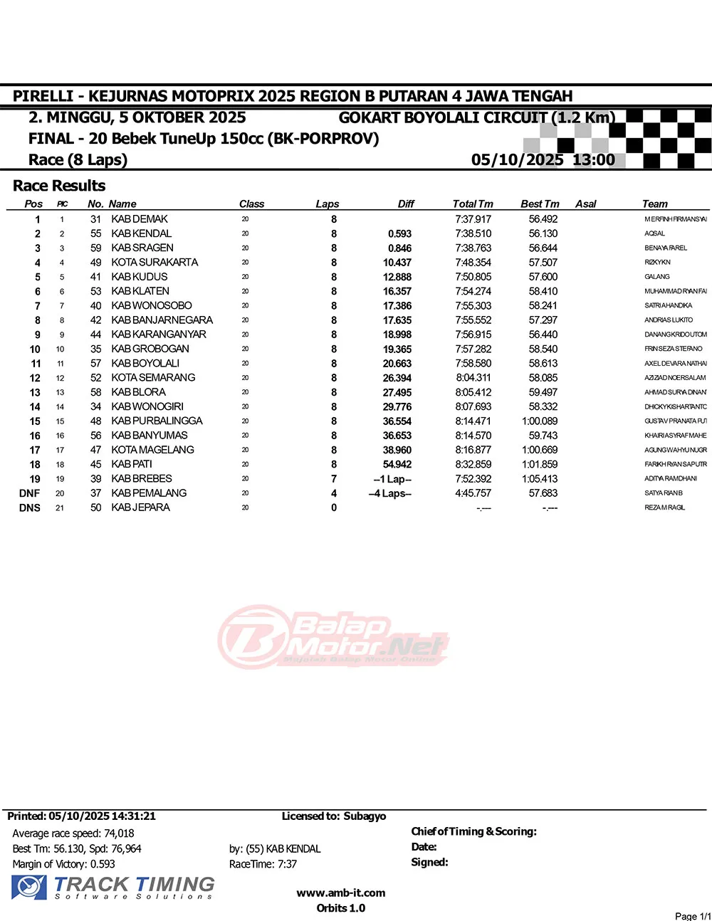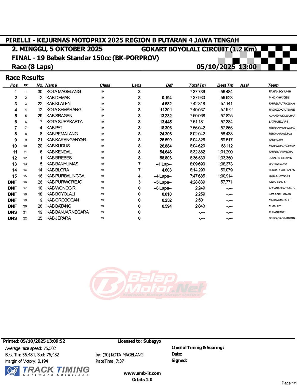 BalapMotor.Net – Berikut merupakan hasil race dari gelaran Babak Kualifikasi Porprov Jawa Tengah 2025 Cabor Balap Motor yang berlangsung bersamaan dengan gelaran Final Kejurnas Motoprix Jawa 2025 di Sirkuit Gokart Boyolali, Jawa Tengah 4-5 Oktober 2025. (**)