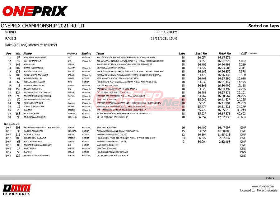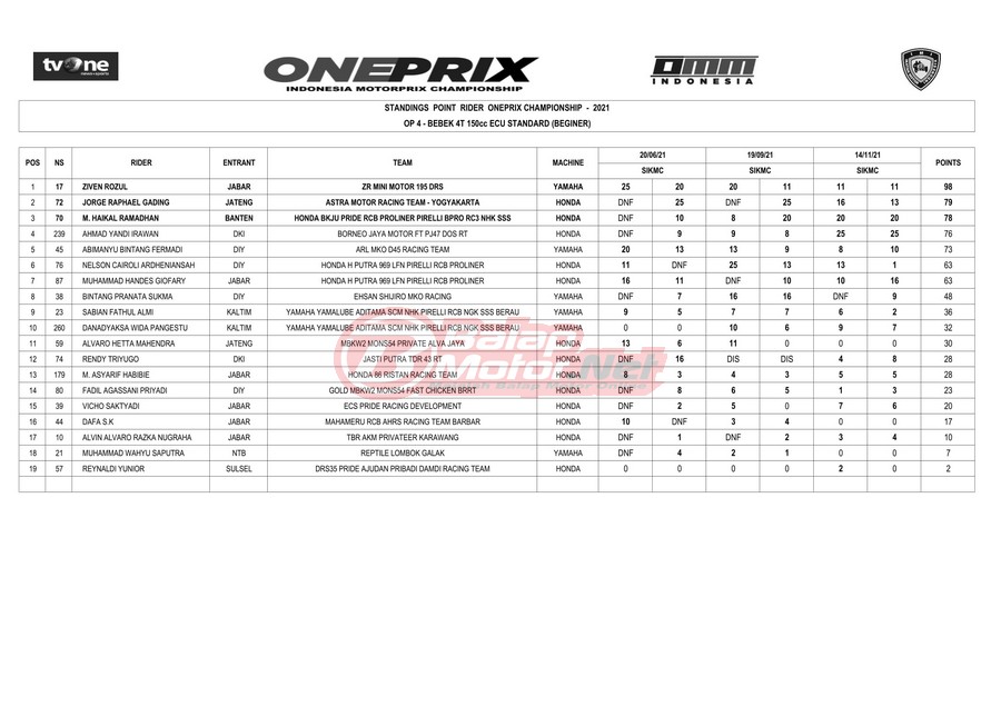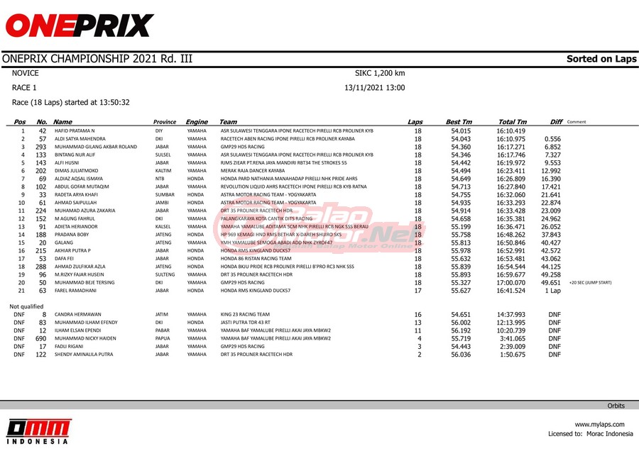 BalapMotor.Net – Berikut merupakan hasil race dari gelaran Final Oneprix musim 2021 yang berlangsung di sirkuit Sentul Karting, Bogor pada 13-14 November 2021.