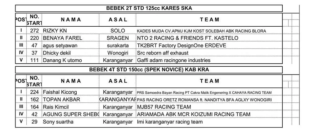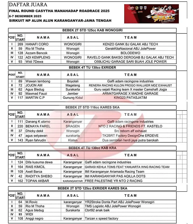 BalapMotor.Net – Berikut merupakan hasil race di hari pertama final Casytha Manahadap Road Race Championship yang berlangsung di sirkuit NP. Alun-alun Karanganyar, Jawa Tengah pada Sabtu 6 Desember 2025. (**)
