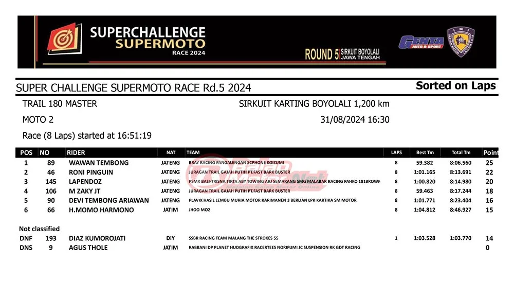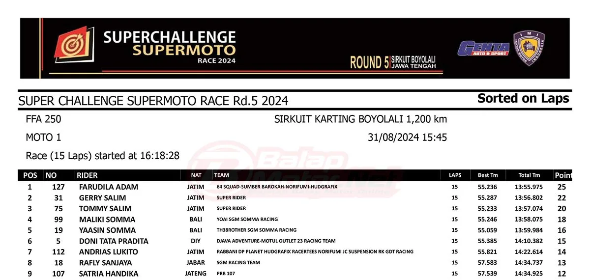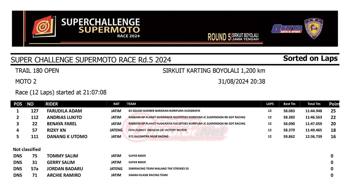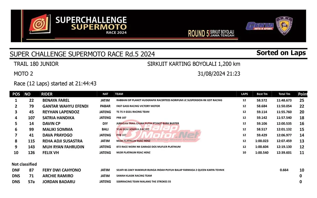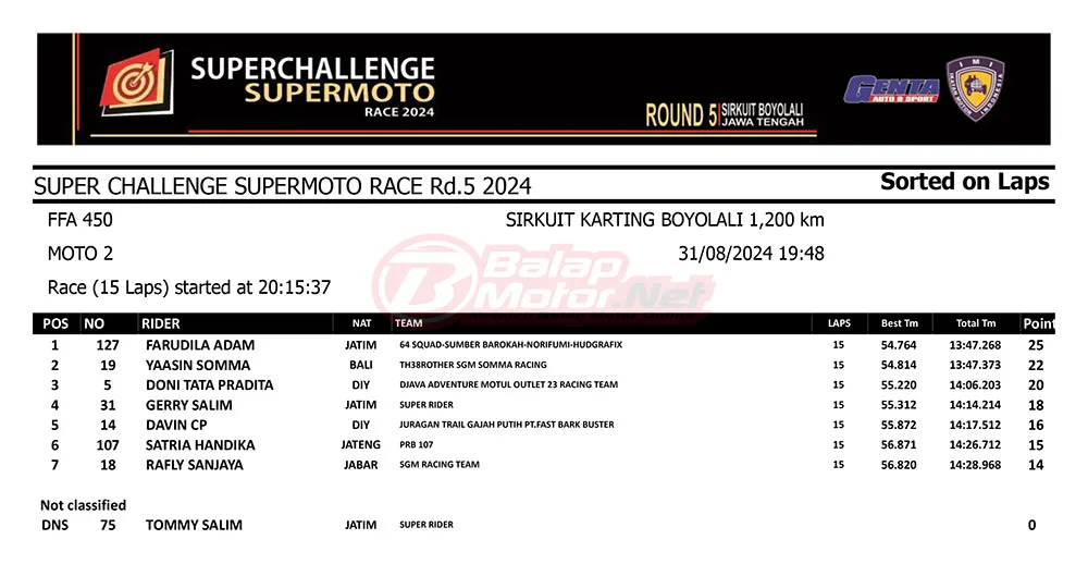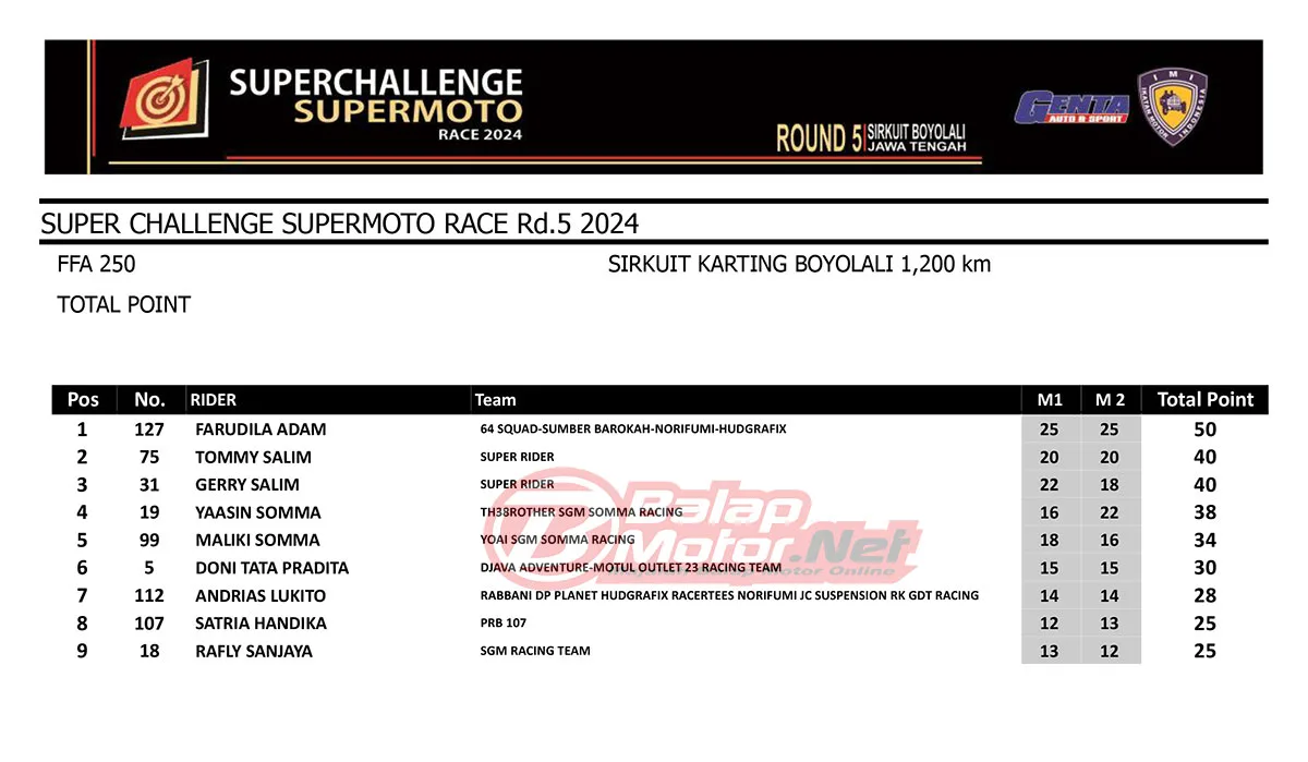 BalapMotor.Net – Berikut merupakan hasil race lengkap dari gelaran final Superchallenge Supermoto Race 2024 Seri Kejurnas yang digelar di sirkuit Gokart Boyolali, Boyolali, Jawa Tengah pada 30-31 Agustus 2024. (**)