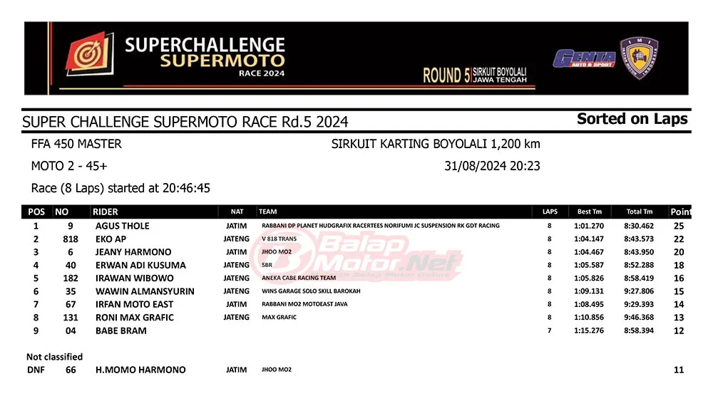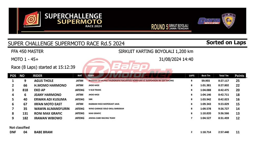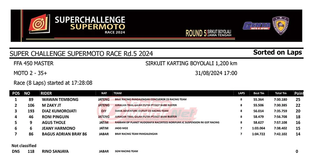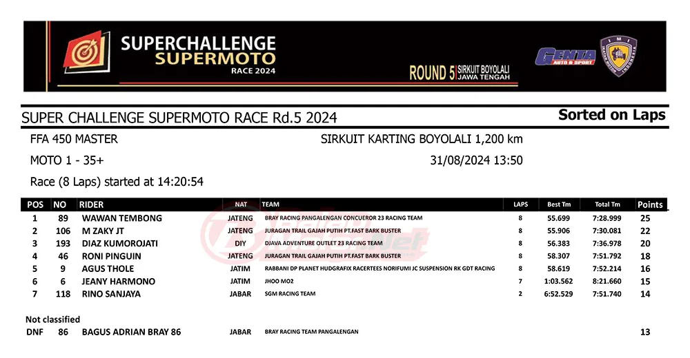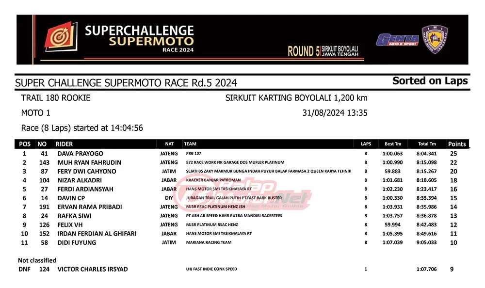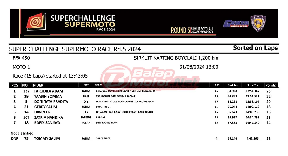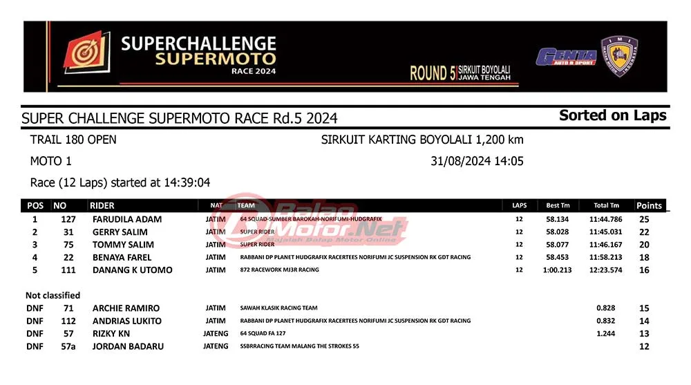BalapMotor.Net – Berikut merupakan hasil race lengkap dari gelaran final Superchallenge Supermoto Race 2024 Seri Kejurnas yang digelar di sirkuit Gokart Boyolali, Boyolali, Jawa Tengah pada 30-31 Agustus 2024. (**)