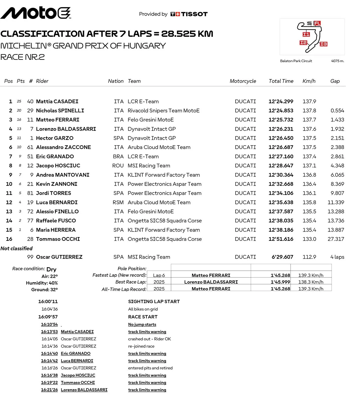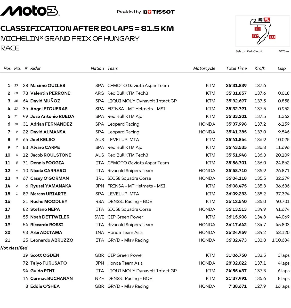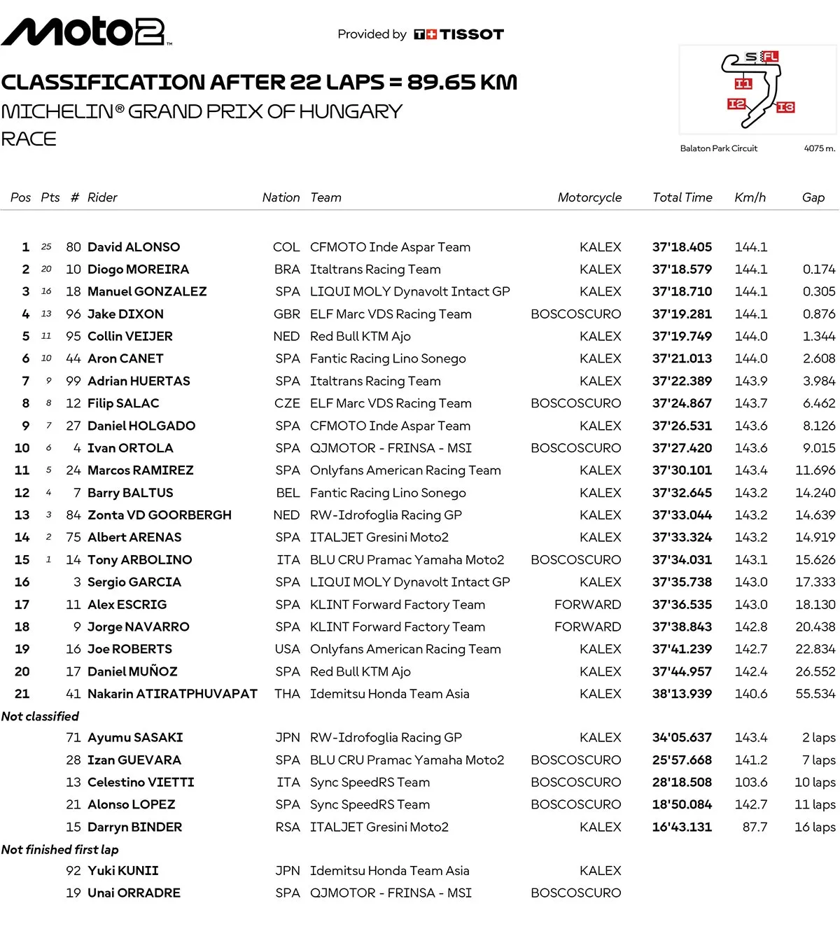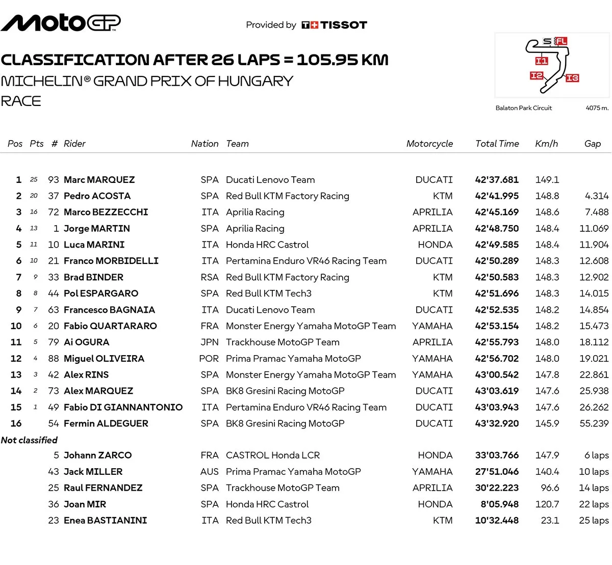 BalapMotor.Net – Berikut merupakan hasil race lengkap semua kelas dari gelaran Michelin Grand Prix Of Hungary atau MotoGP Hungaria 2025 yang berlangsung di sirkuit Balaton Park pada 24 Agustus 2025. (**)
