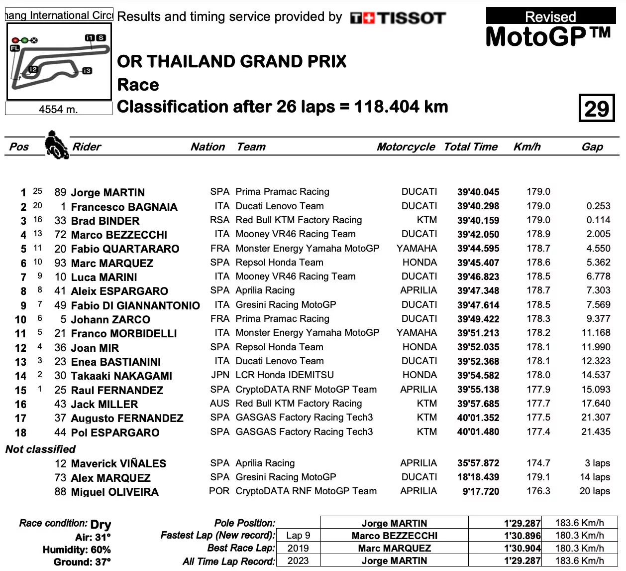 BalapMotor.Net – Berikut merupakan hasil race dari gelaran OR Thailand Grand Prix (MotoGP Thailand) 2023 yang berlangsung di sirkuit Chang, Buriram, Thailand pada 29 Oktober 2023. (**)