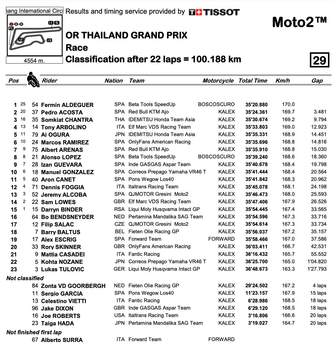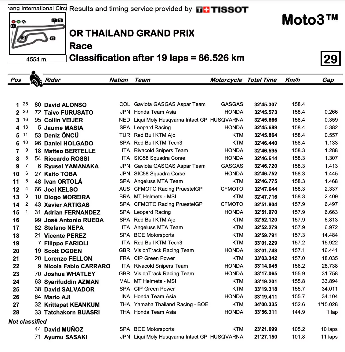 BalapMotor.Net – Berikut merupakan hasil race dari gelaran OR Thailand Grand Prix (MotoGP Thailand) 2023 yang berlangsung di sirkuit Chang, Buriram, Thailand pada 29 Oktober 2023. (**)