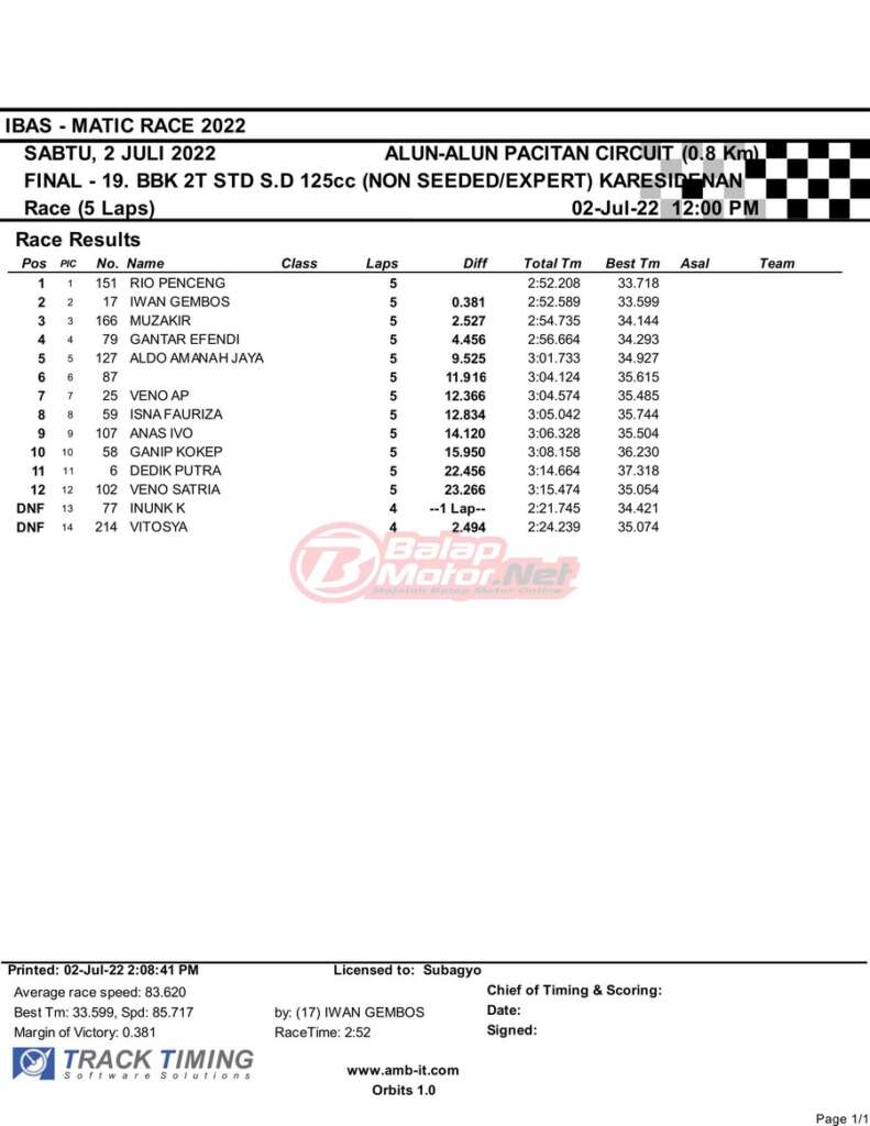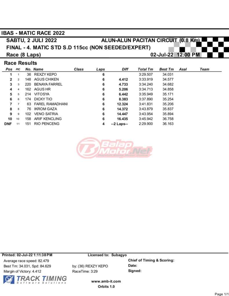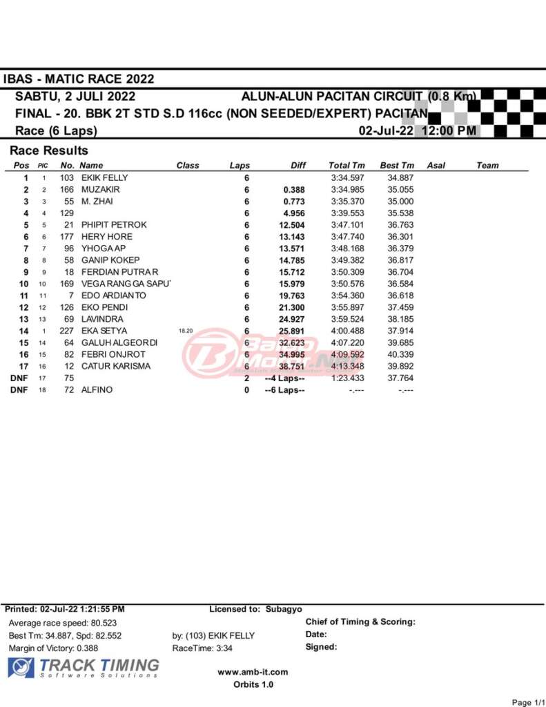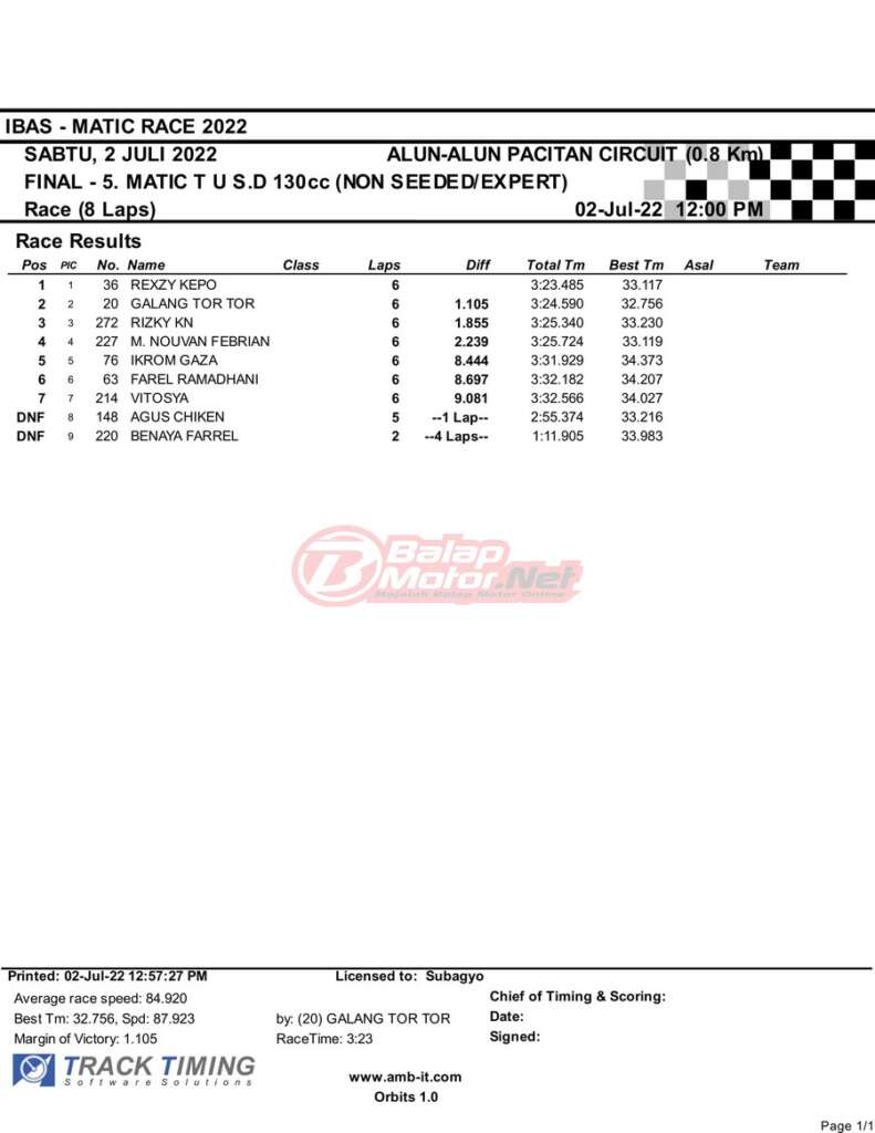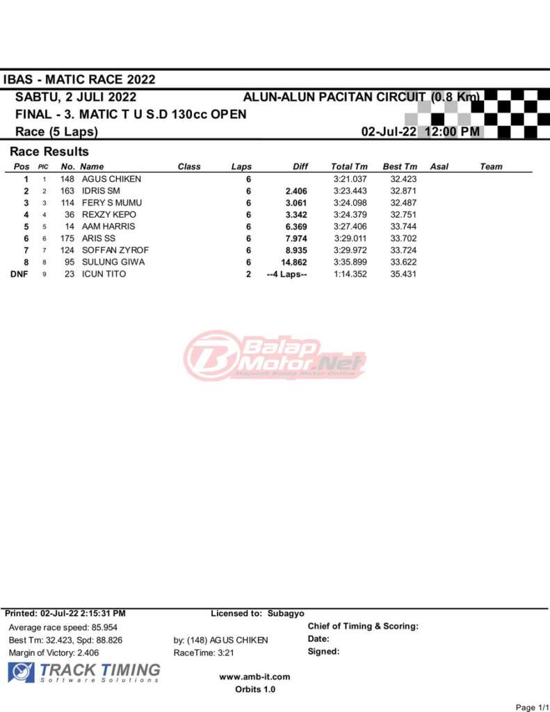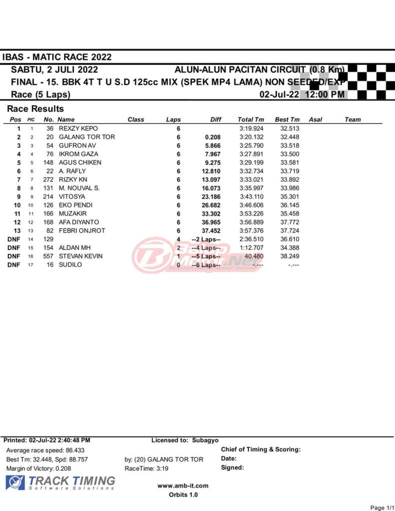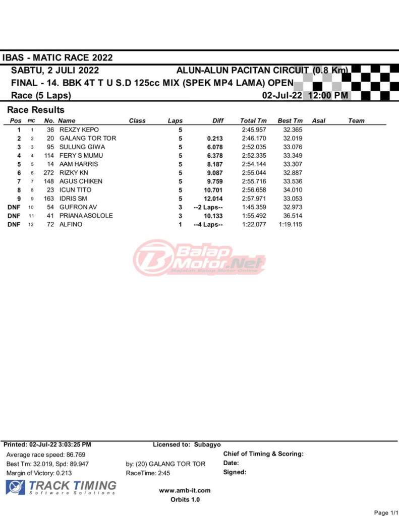 BalapMotor.Net – Berikut merupakan hasil race final semua kelas dari gelaran IBAS Matic Race 2022 yang digelar di sirkuit NP Alun-Alun Pacitan, Jawa Timur pada hari Sabtu 2 Juli 2022. | Heri Katrox