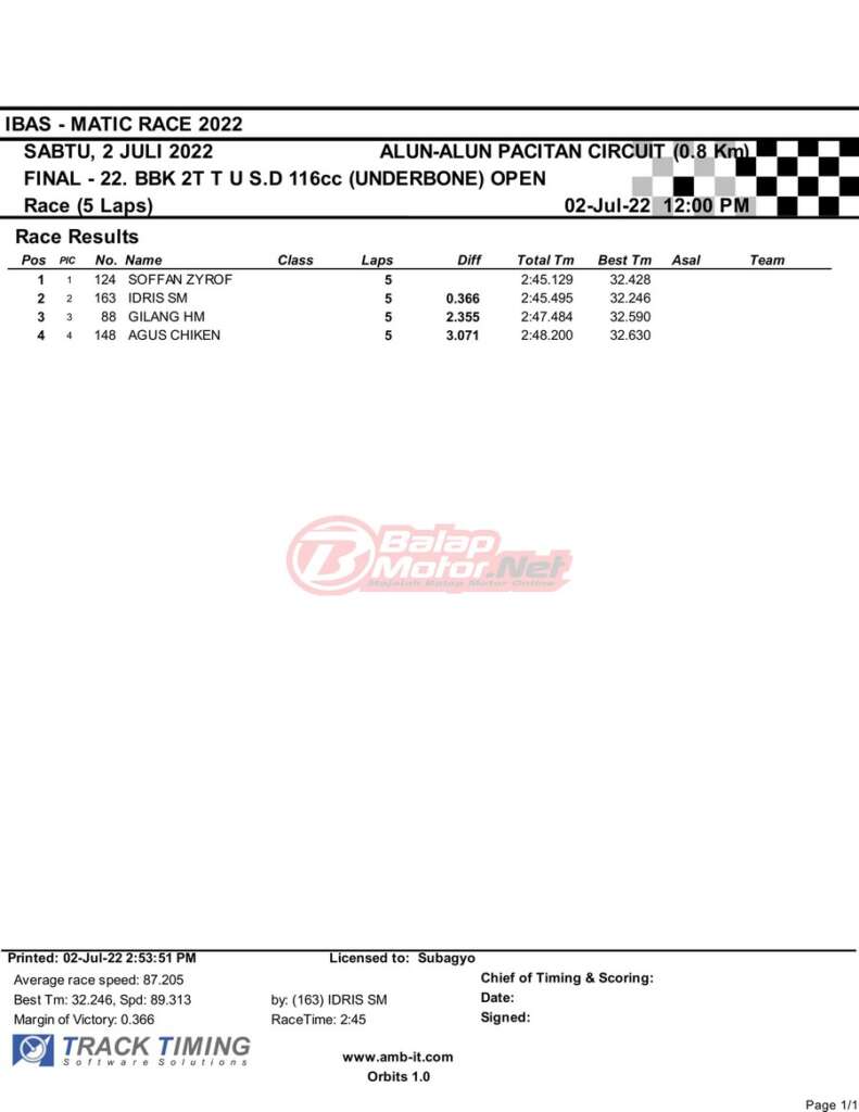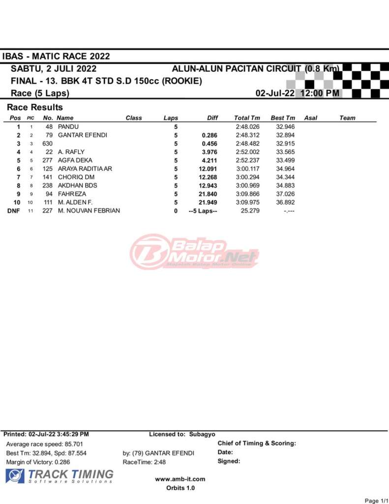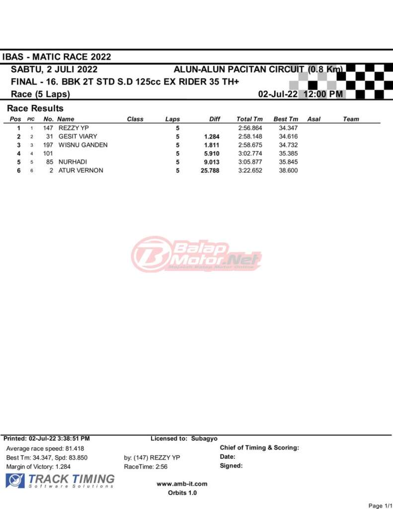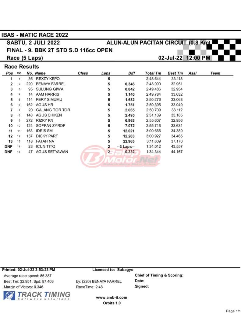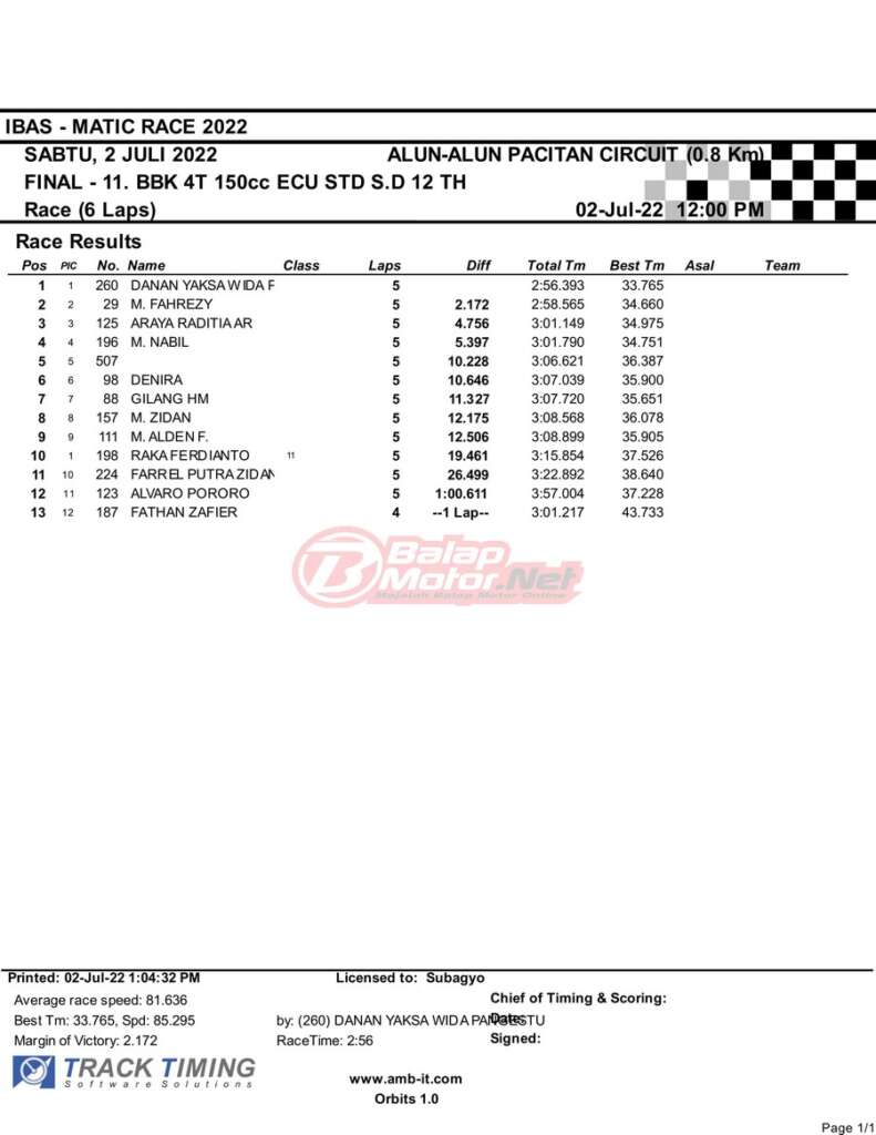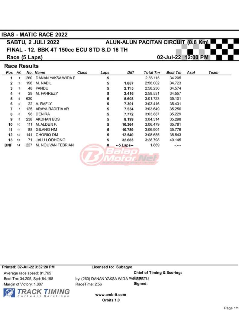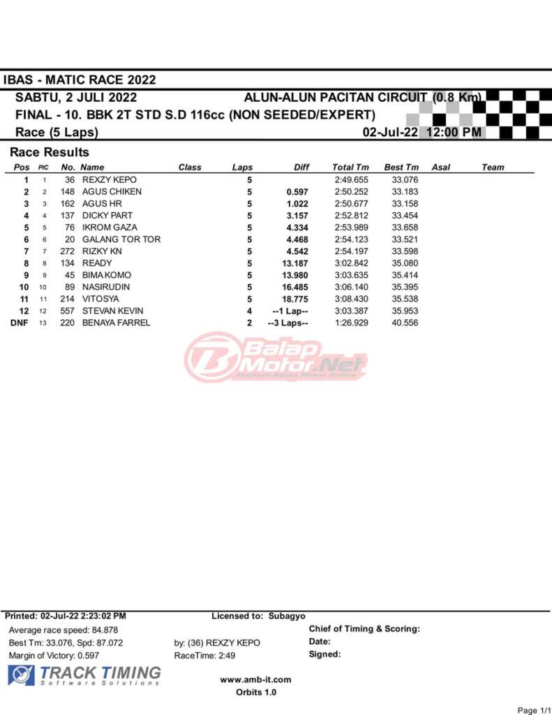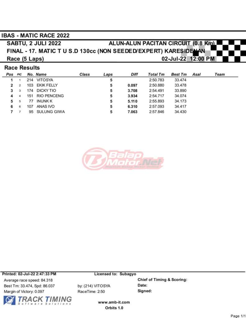 BalapMotor.Net – Berikut merupakan hasil race final semua kelas dari gelaran IBAS Matic Race 2022 yang digelar di sirkuit NP Alun-Alun Pacitan, Jawa Timur pada hari Sabtu 2 Juli 2022. | Heri Katrox