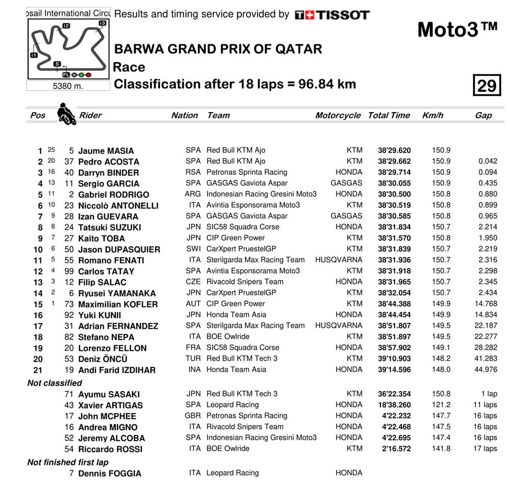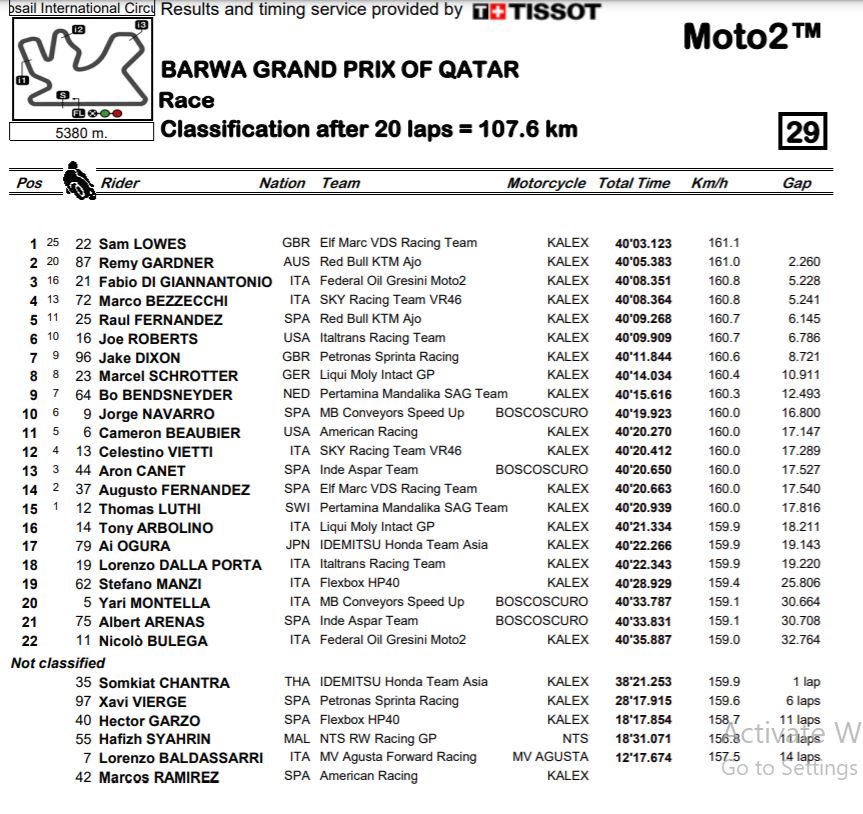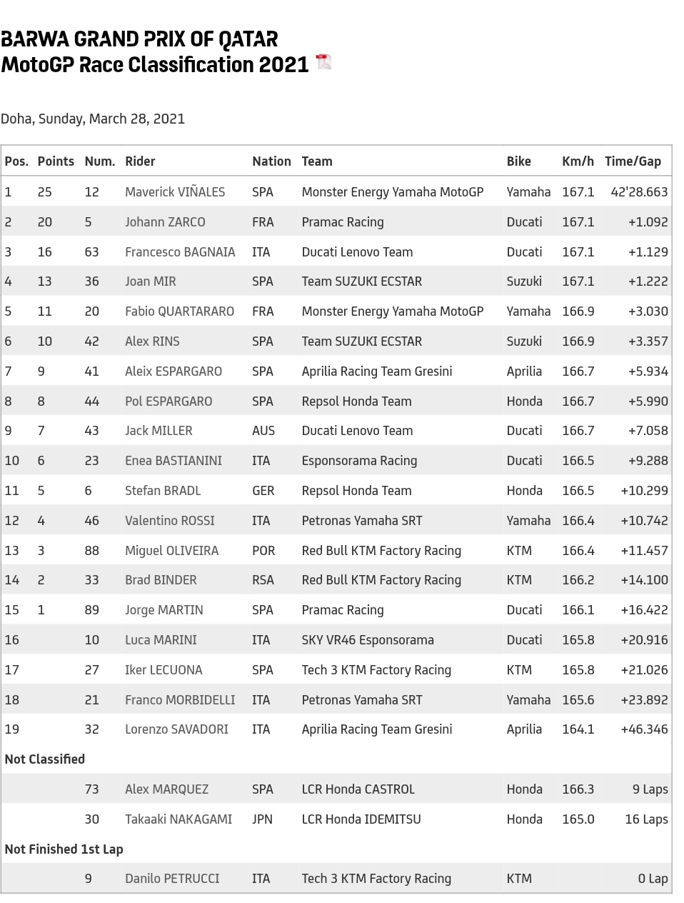 Hasil Race Semua Kelas MotoGP Qatar 2021Penulis BalapMotor.net - 29/03/2021 BalapMotor.Net – Berikut merupakan hasil race semua kelas dari gelaran Barwa Grand Prix ronde pertama MotoGP musim 2021 yang berlangsung di sirkuit Losaio, Qatar pada 28 Maret 2021. |