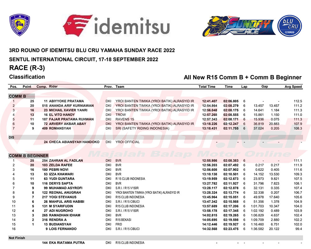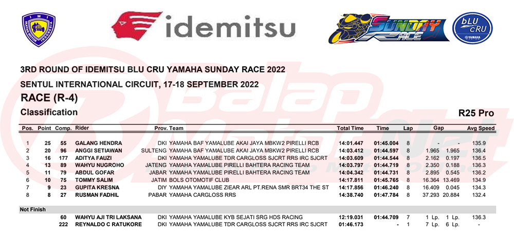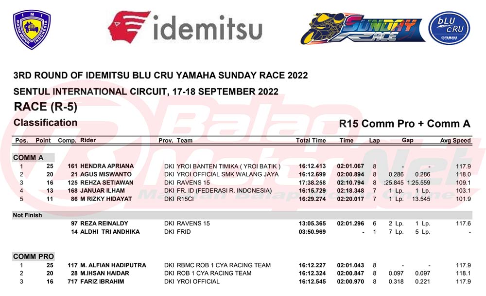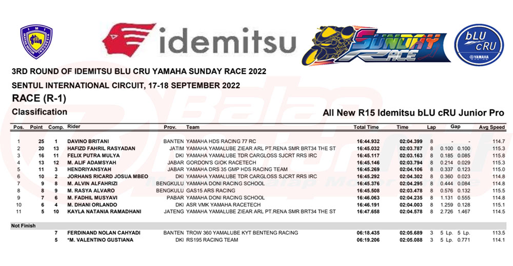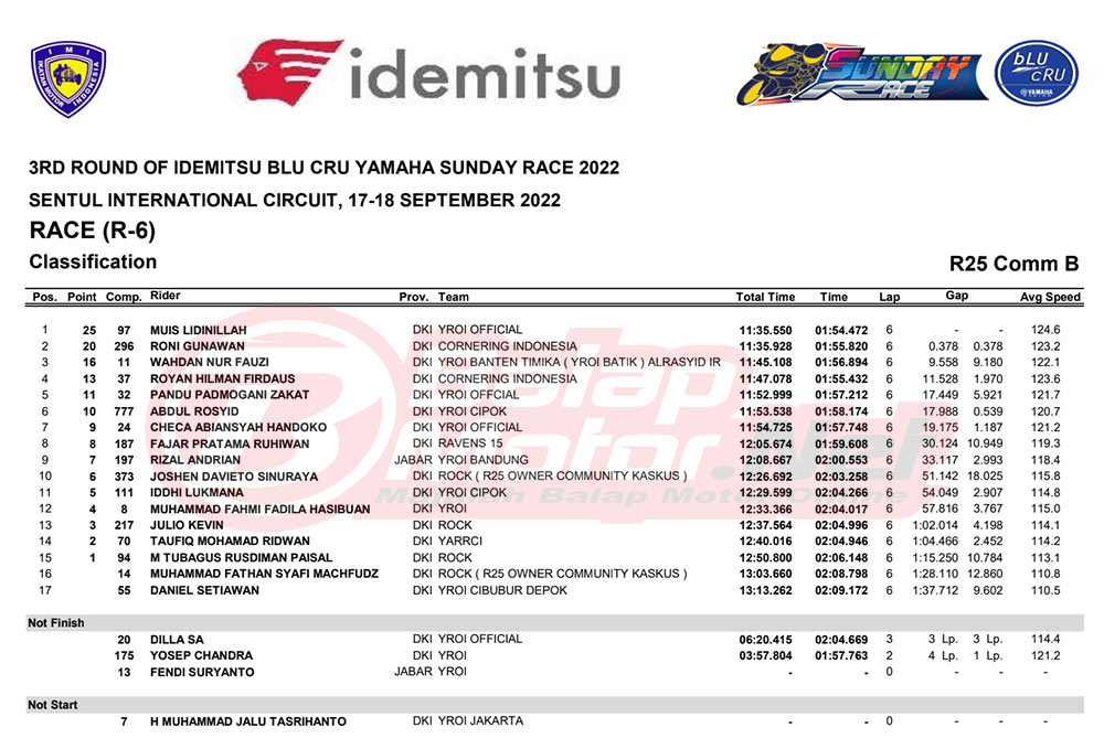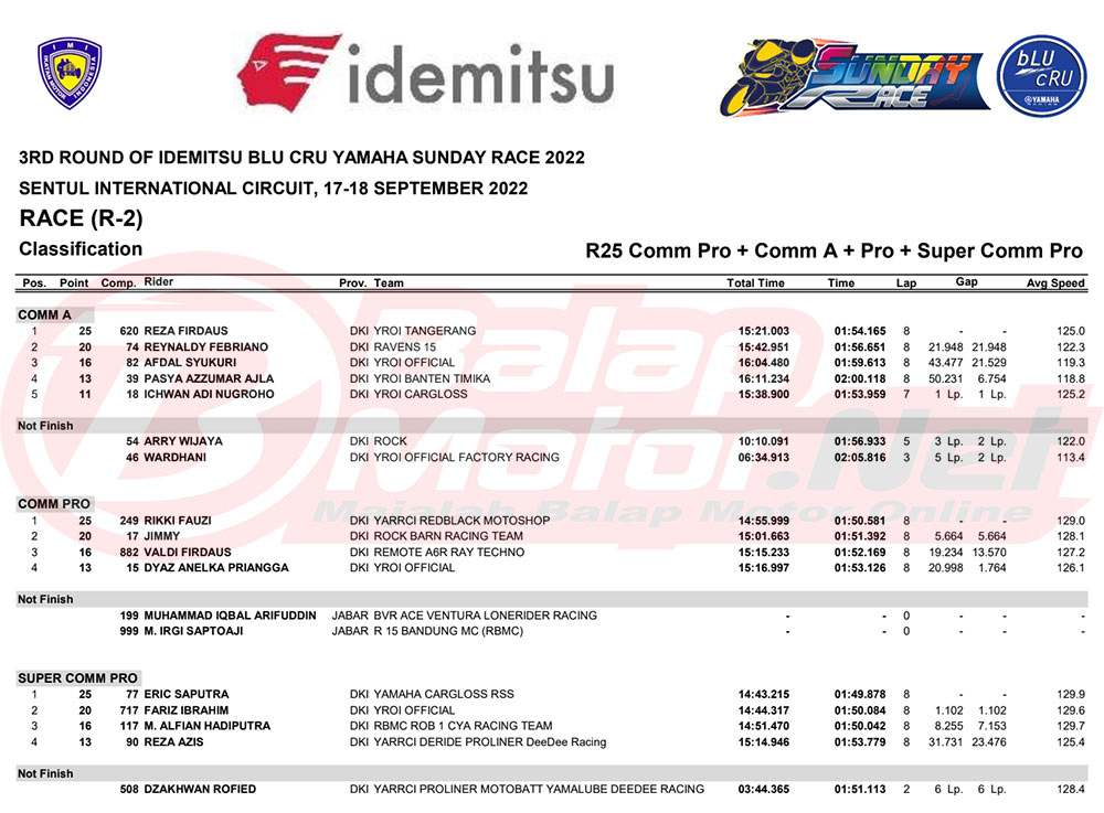 BalapMotor.Net – Berikut merupakan hasil dari seri final Idemitsu bLU cRU Yamaha Sunday Race 2022 yang digelar di sirkuit Sentul Internasional, Bogor pada hari Sabtu-Minggu 17-18 September 2022.