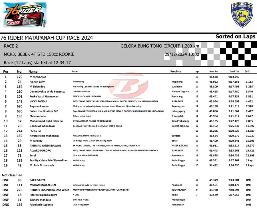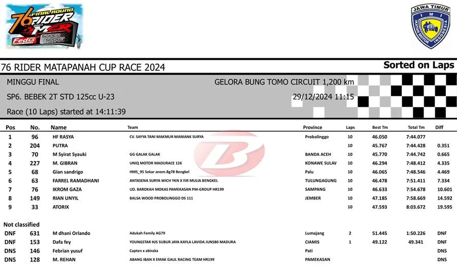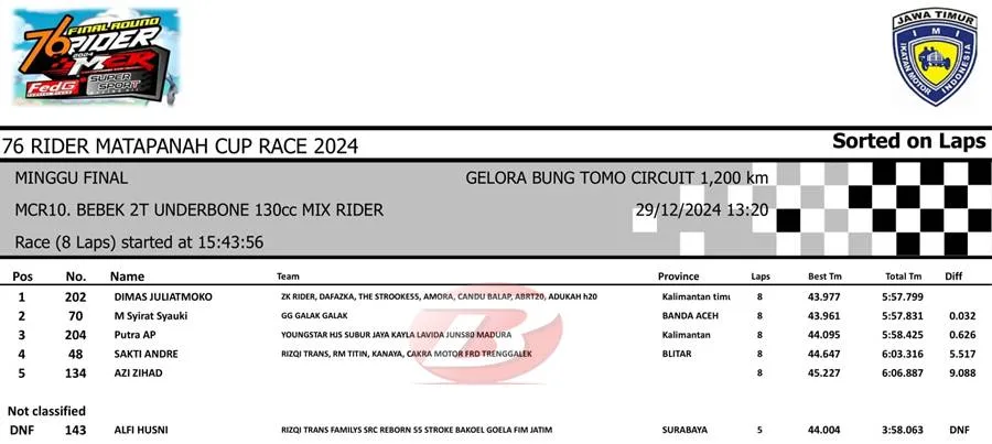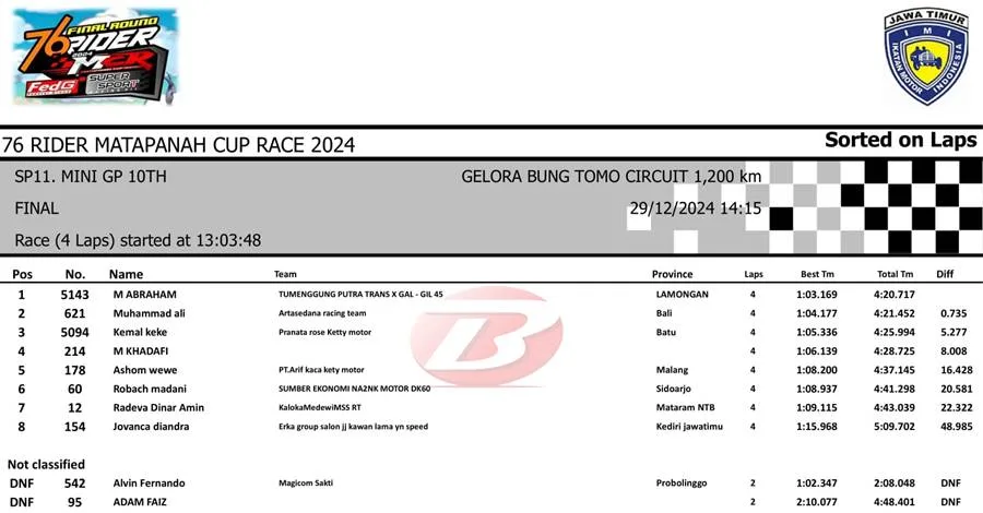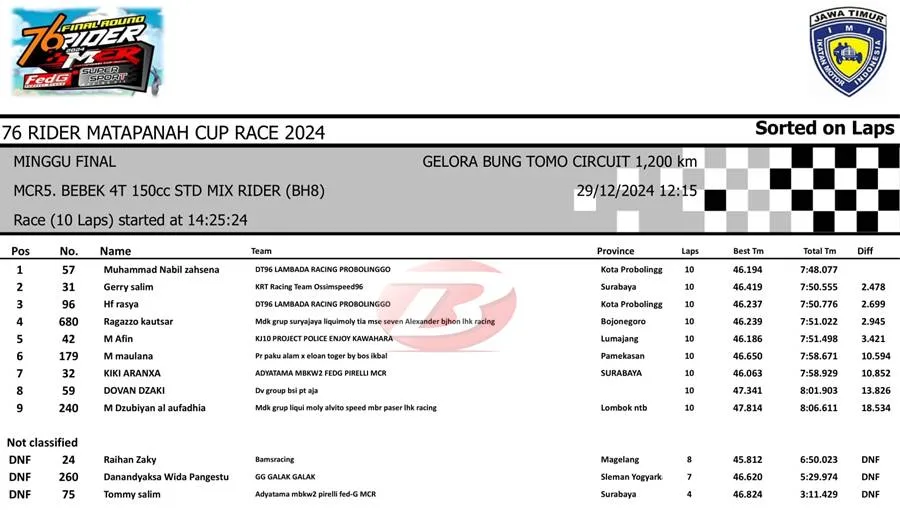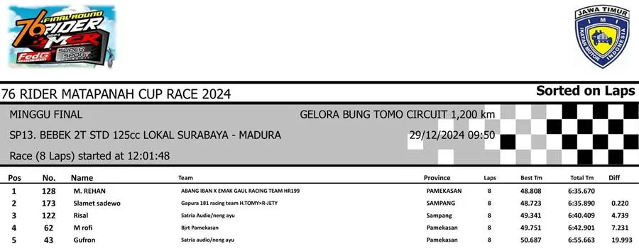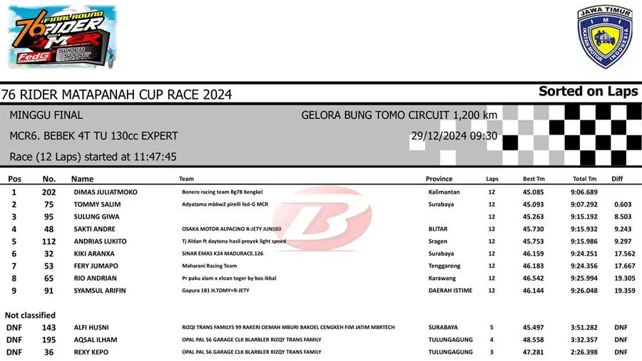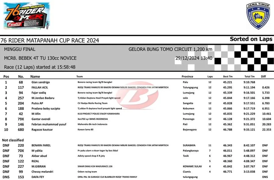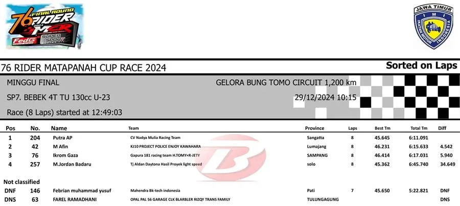 BalapMotor.Net – Berikut merupakan hasil lengkap seluruh race di putaran Final Matapanah Cup Race (MCR) 2024 yang berlangsung di sirkuit Gelora Bung Tomo (GBT), Surabaya pada 28-29 Desember 2024. (**)