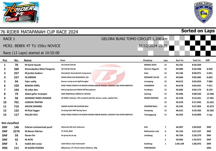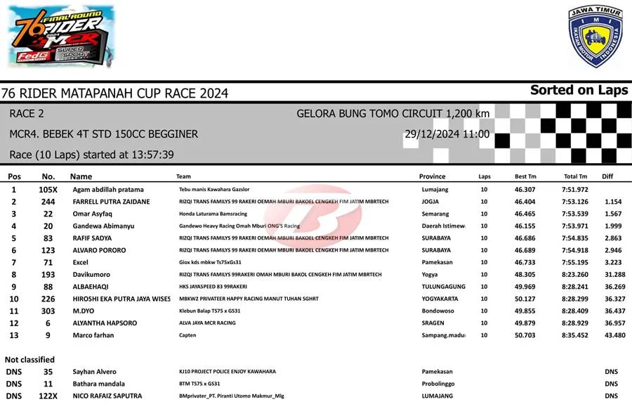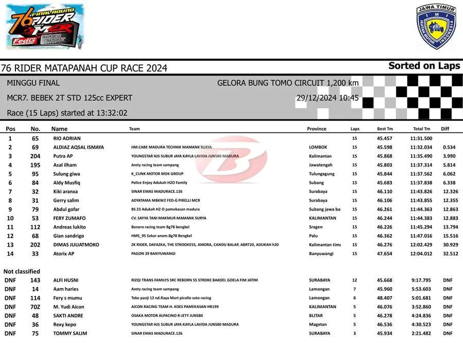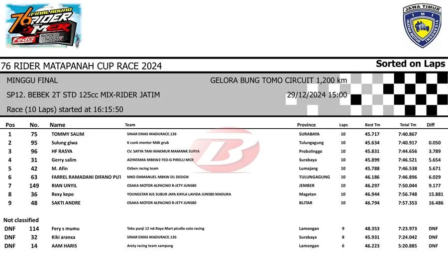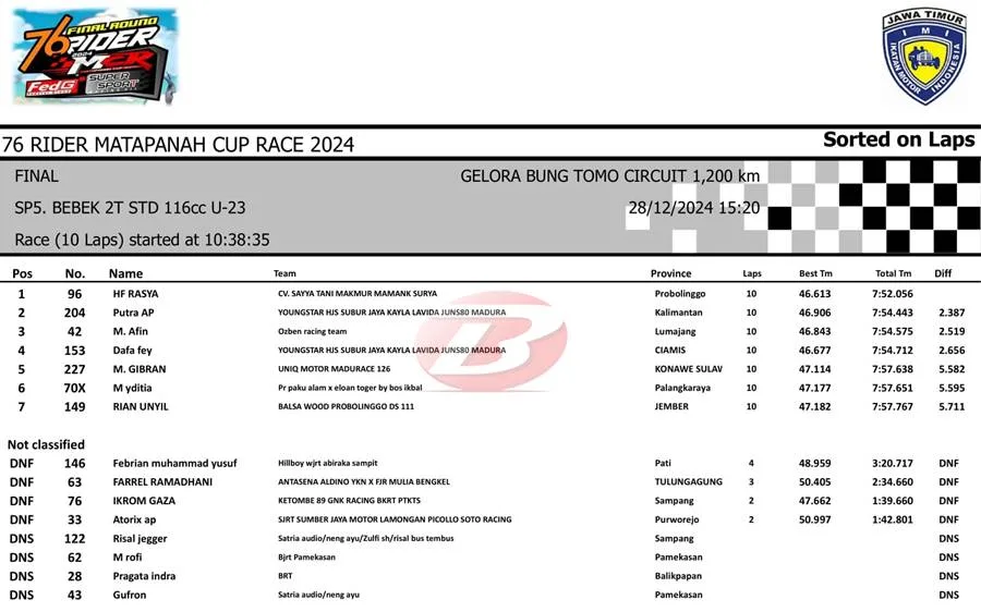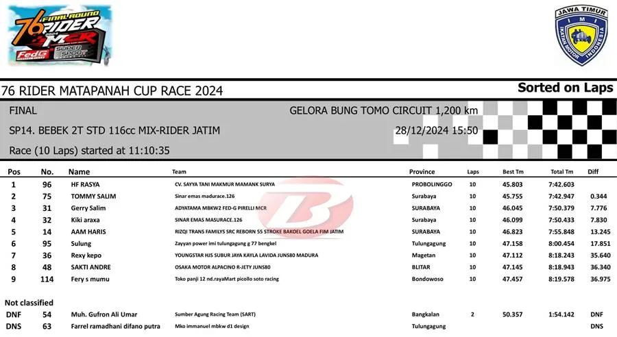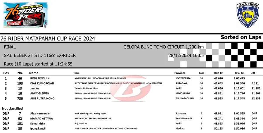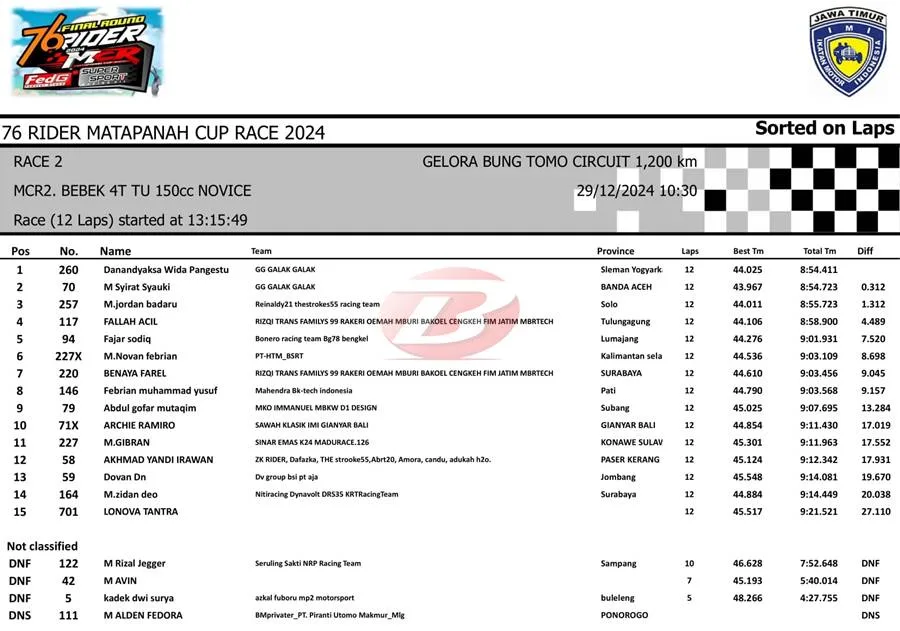 BalapMotor.Net – Berikut merupakan hasil lengkap seluruh race di putaran Final Matapanah Cup Race (MCR) 2024 yang berlangsung di sirkuit Gelora Bung Tomo (GBT), Surabaya pada 28-29 Desember 2024. (**)