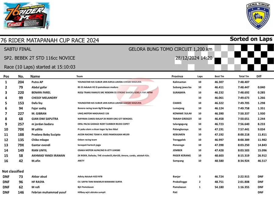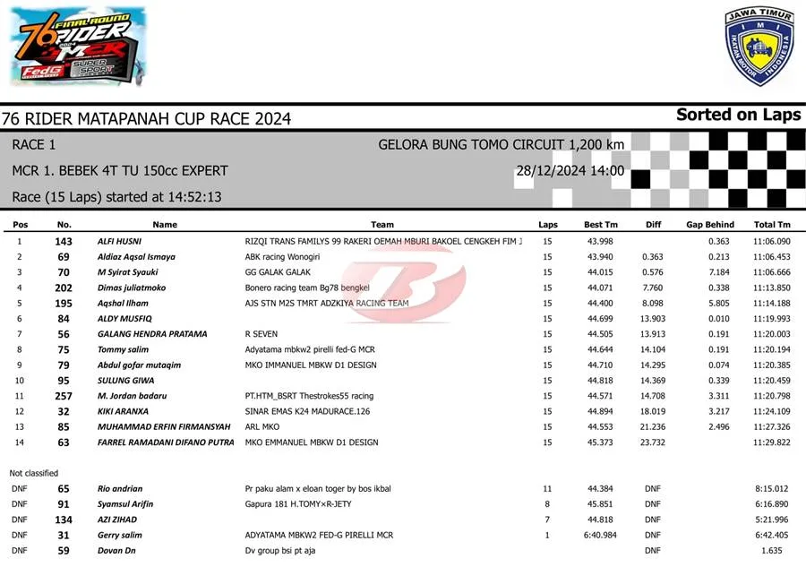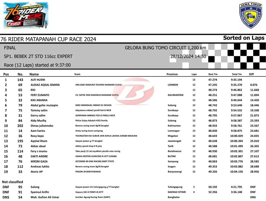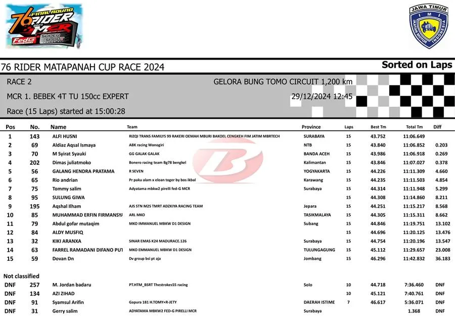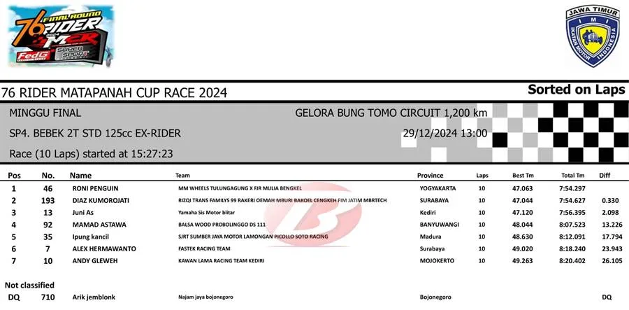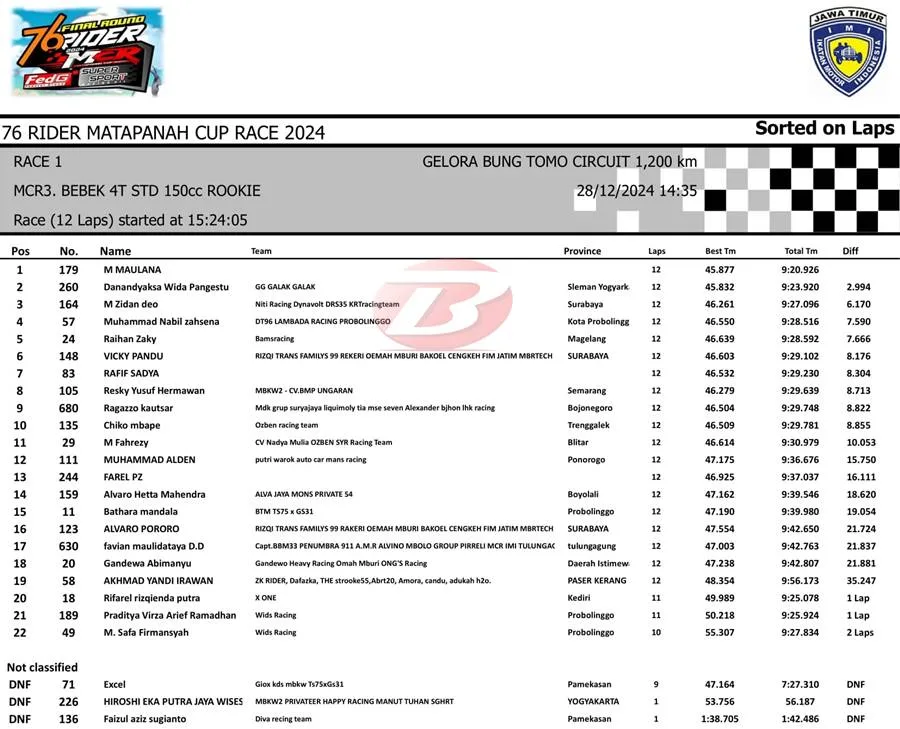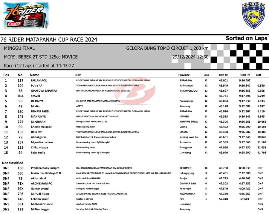 BalapMotor.Net – Berikut merupakan hasil lengkap seluruh race di putaran Final Matapanah Cup Race (MCR) 2024 yang berlangsung di sirkuit Gelora Bung Tomo (GBT), Surabaya pada 28-29 Desember 2024. (**)