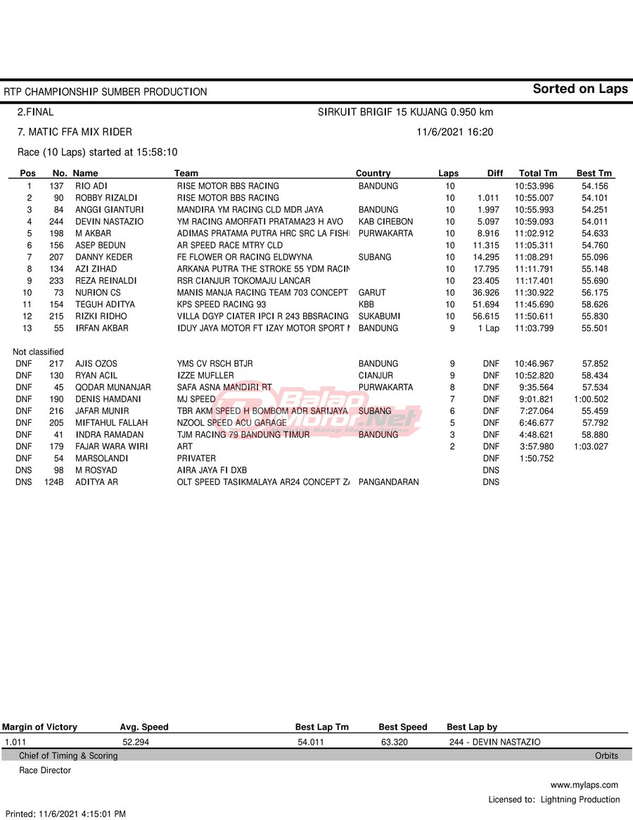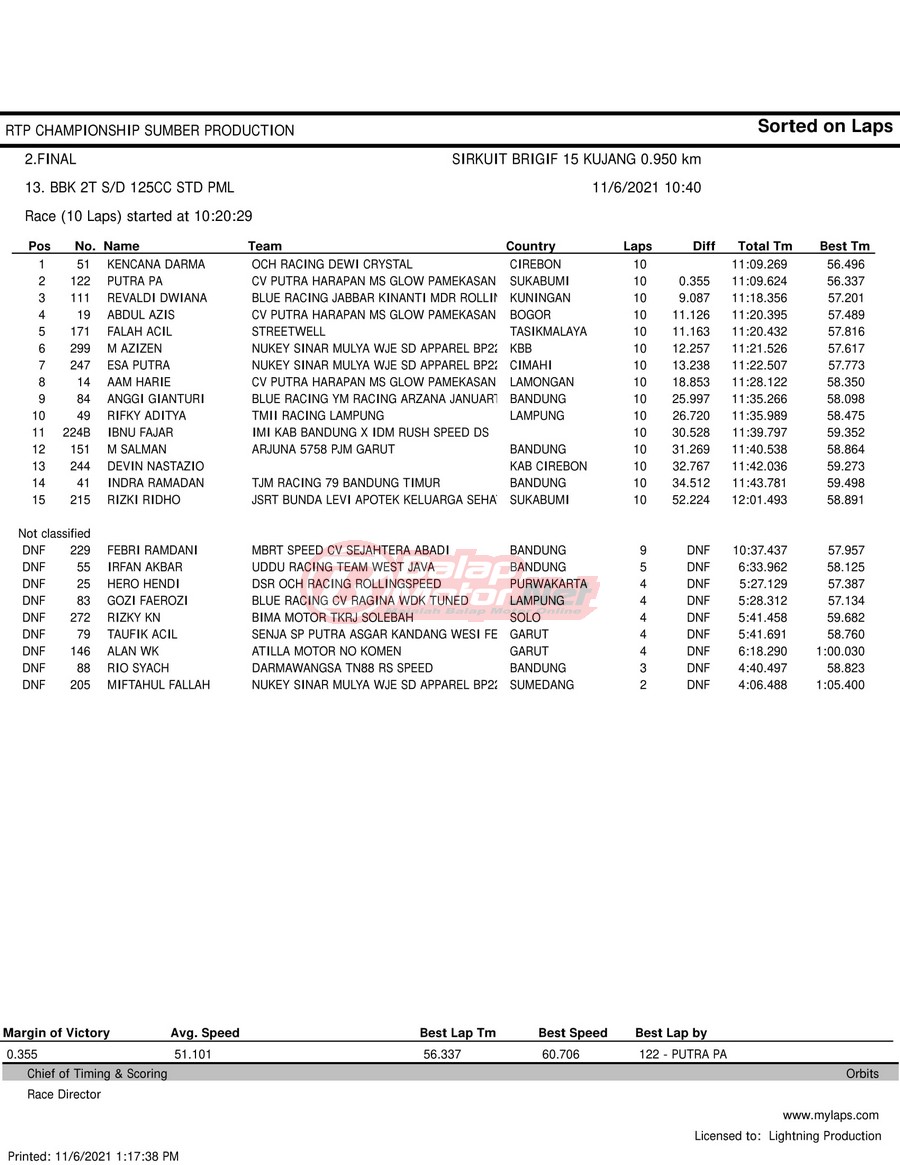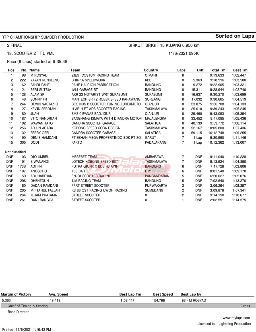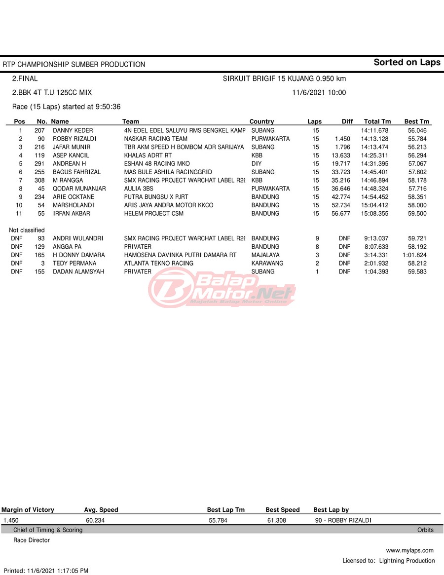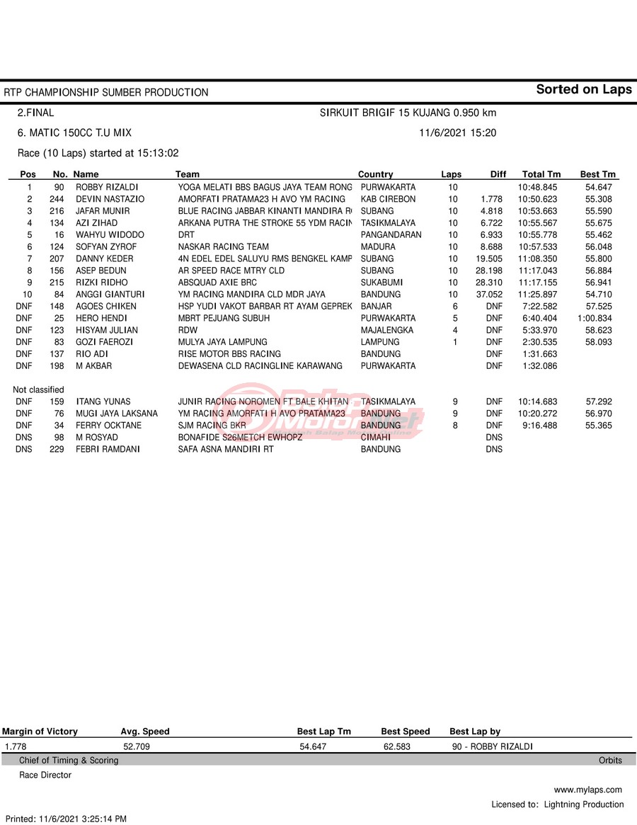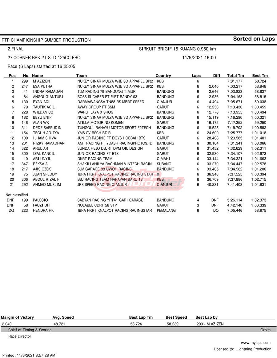 BalapMotor.Net – Berikut hasil race tiap kelas pada gelaran RTP Sumber Production Championship Road Race yang berlangsung di sirkuit NP Brigif 15 Kujang II Cimahi, Jawa Barat pada 6 November 2021.
