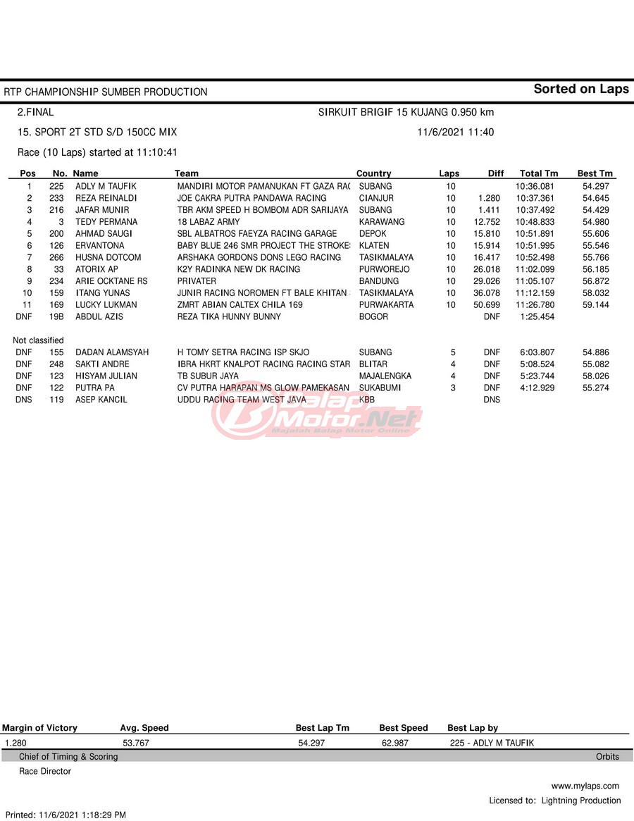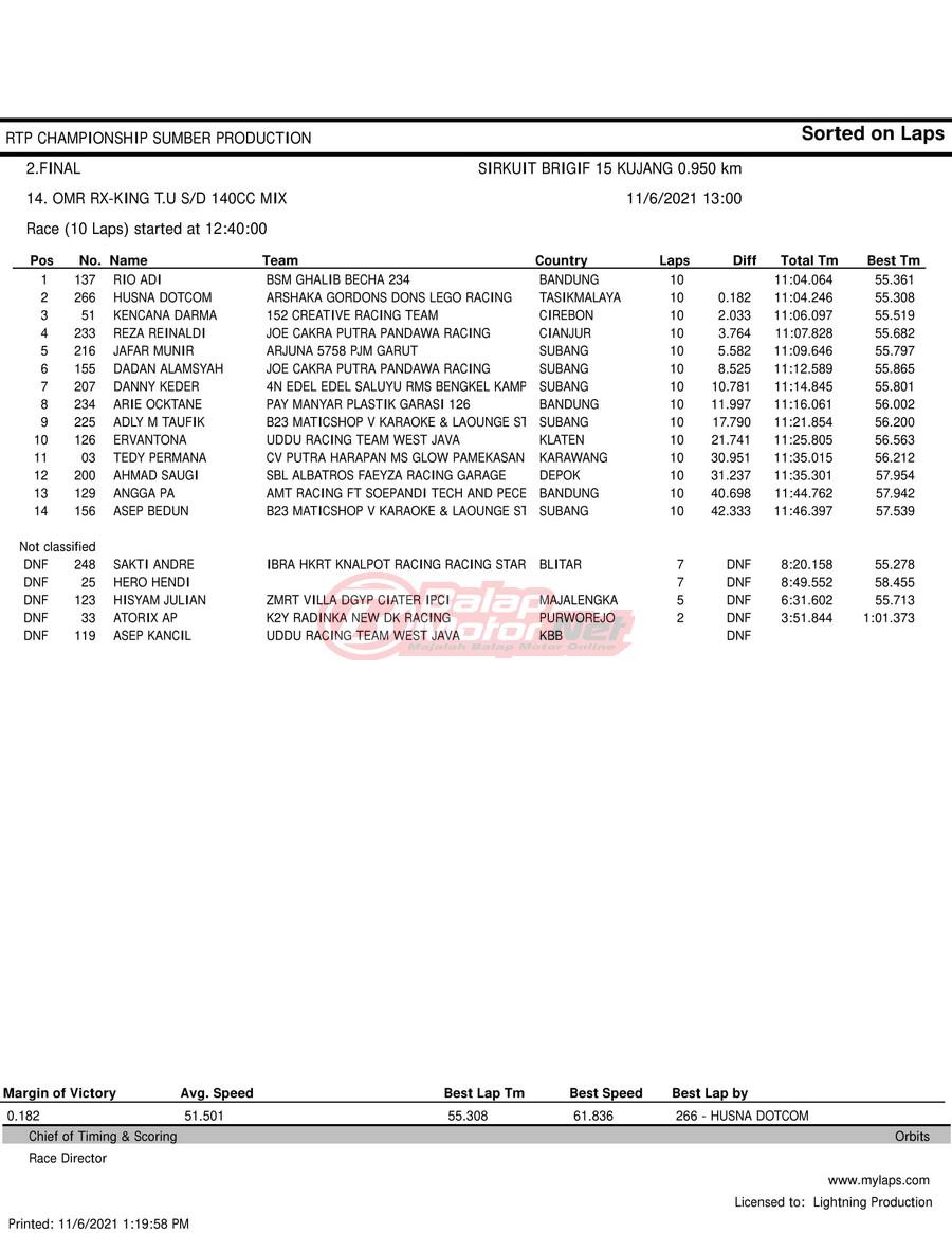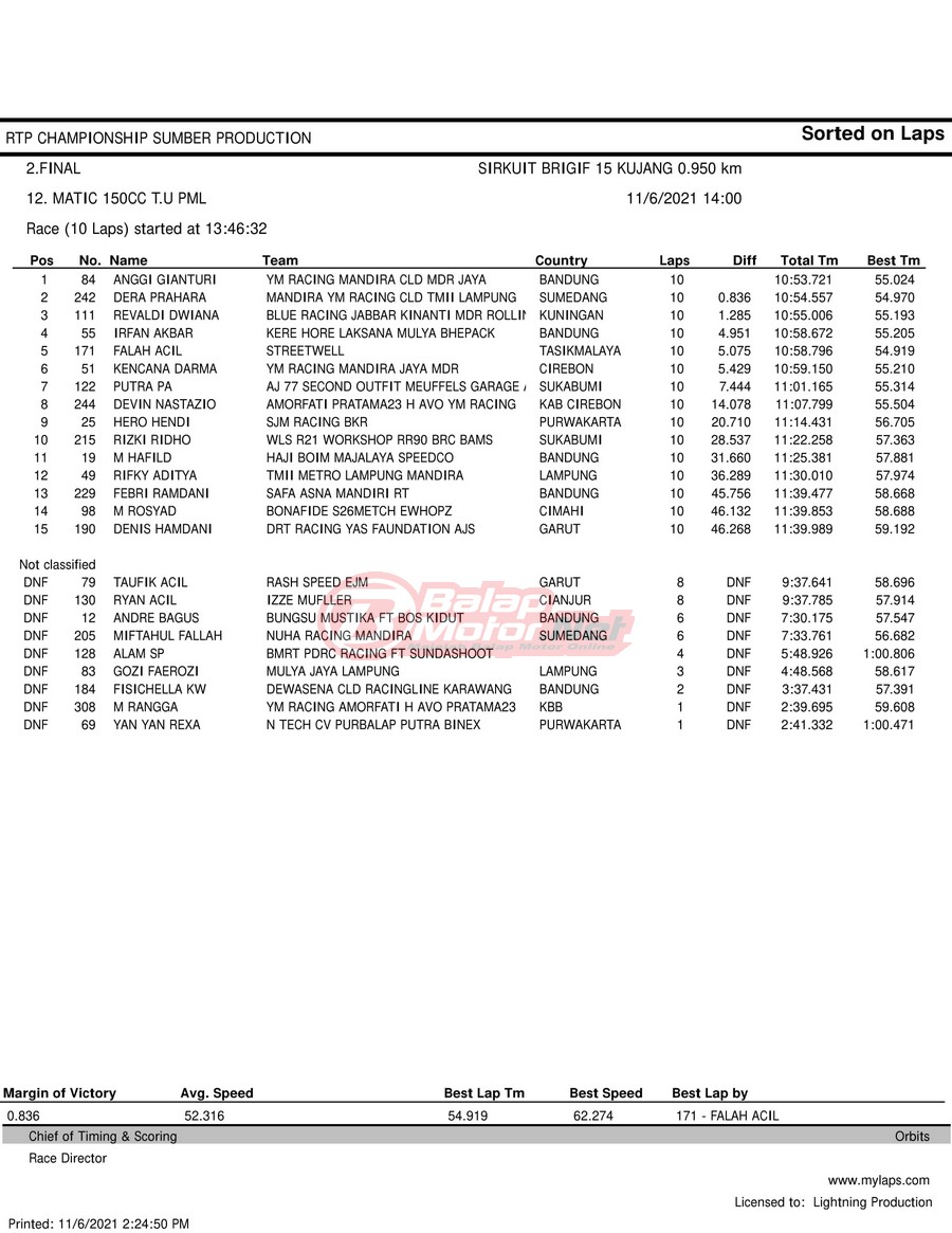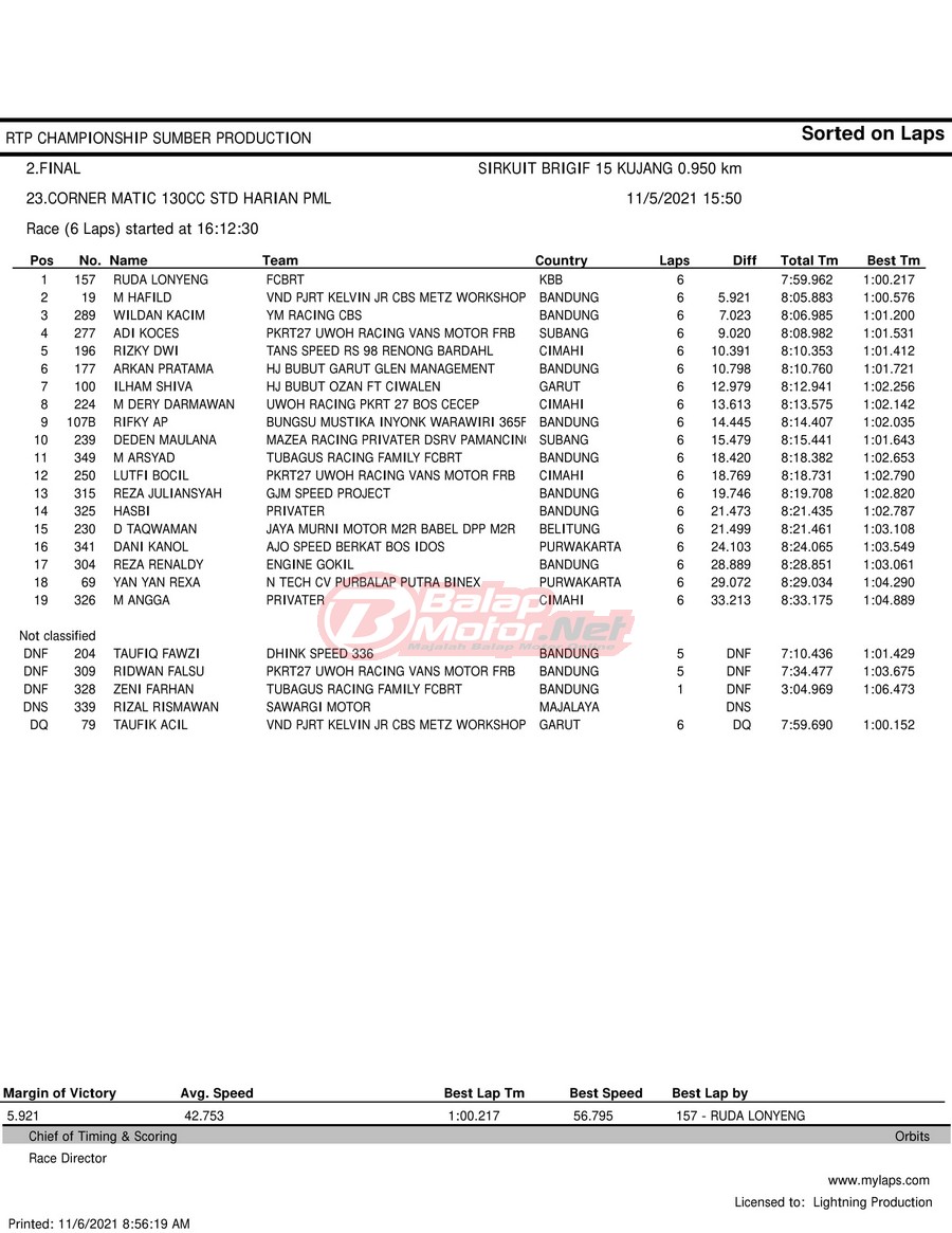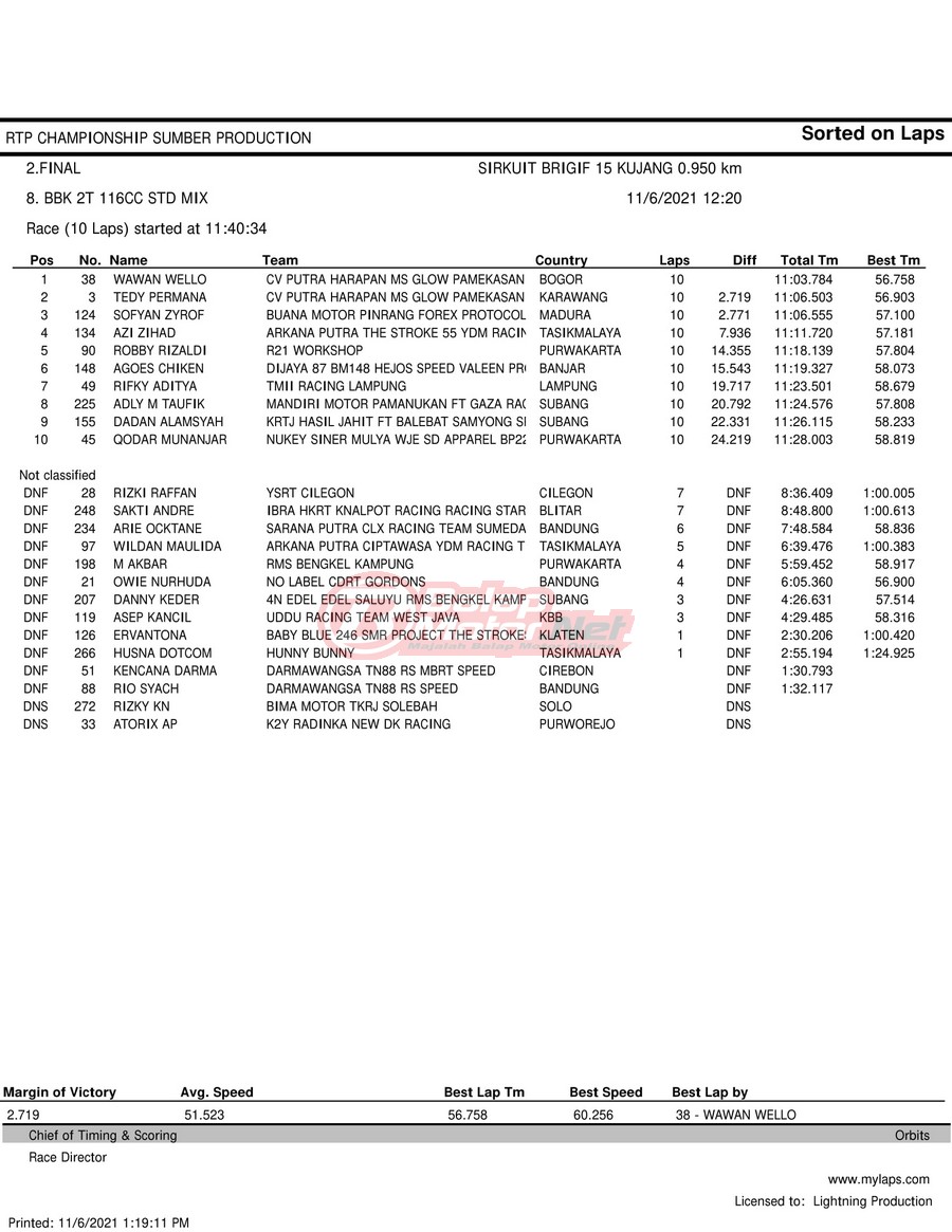 BalapMotor.Net – Berikut hasil race tiap kelas pada gelaran RTP Sumber Production Championship Road Race yang berlangsung di sirkuit NP Brigif 15 Kujang II Cimahi, Jawa Barat pada 6 November 2021.