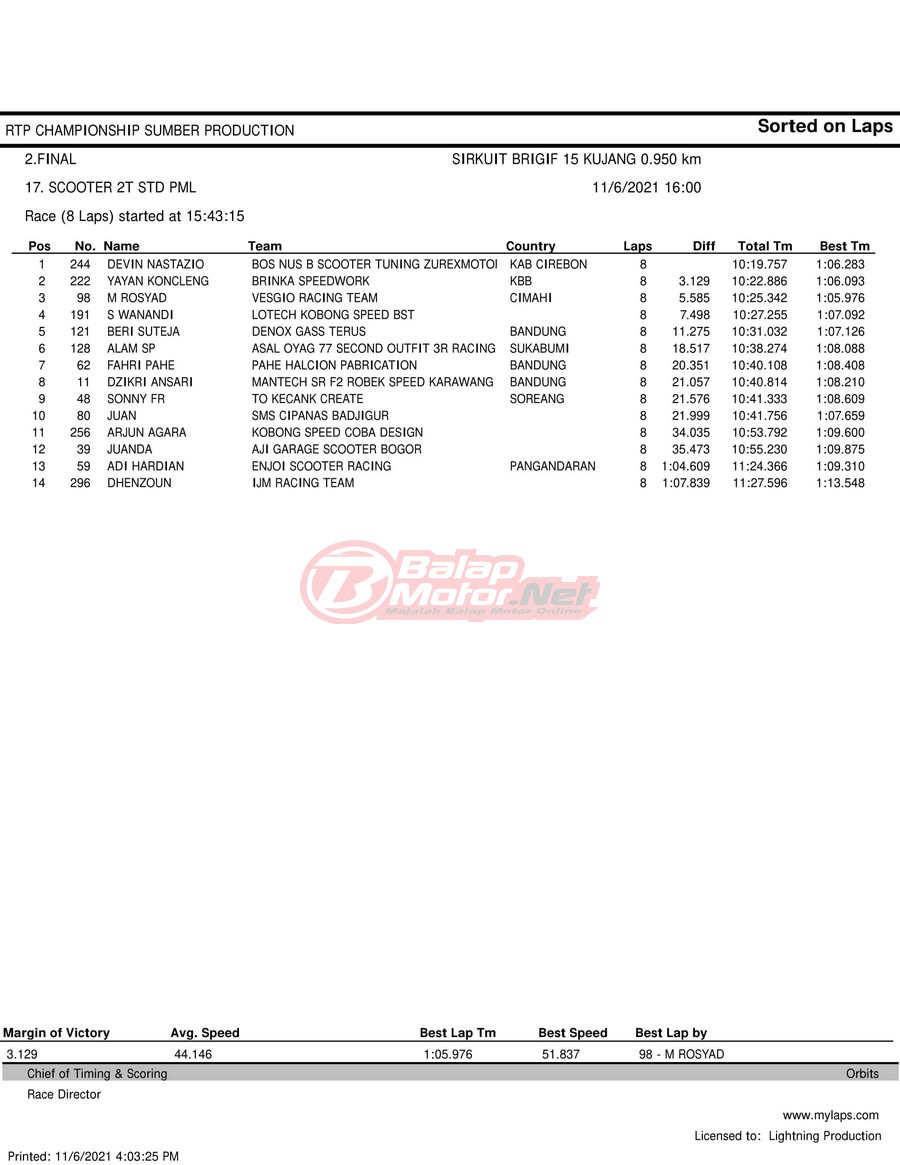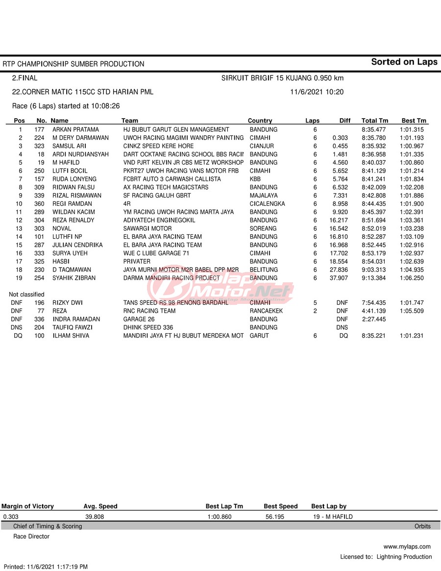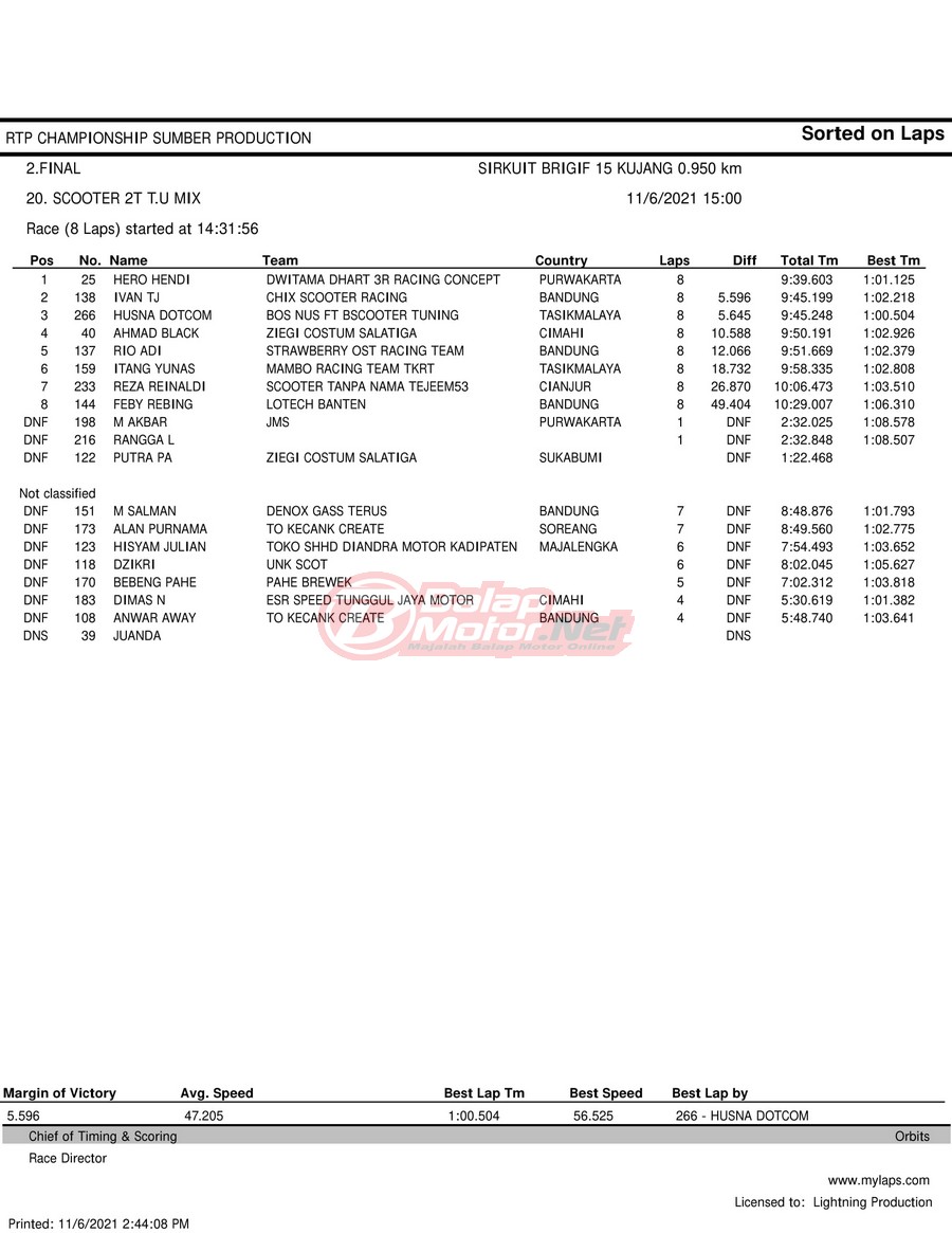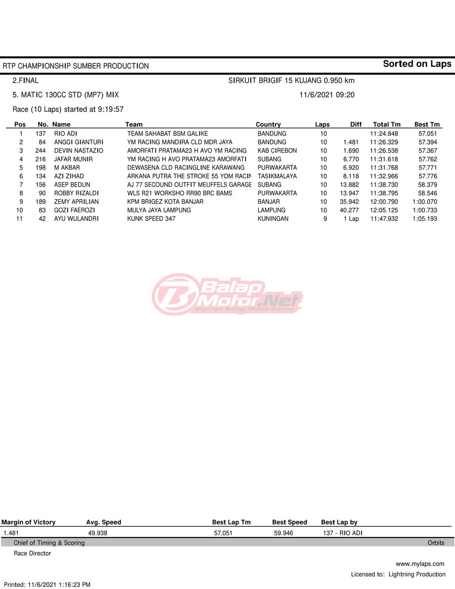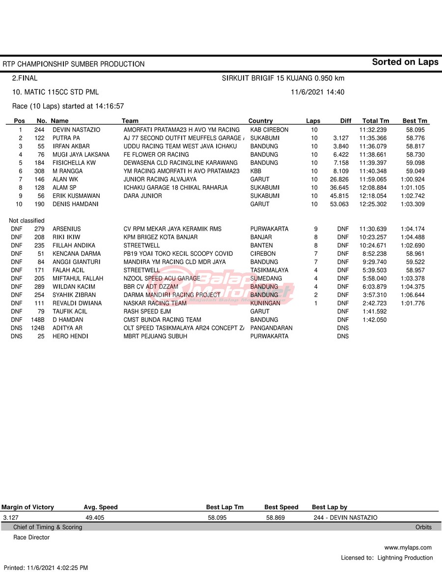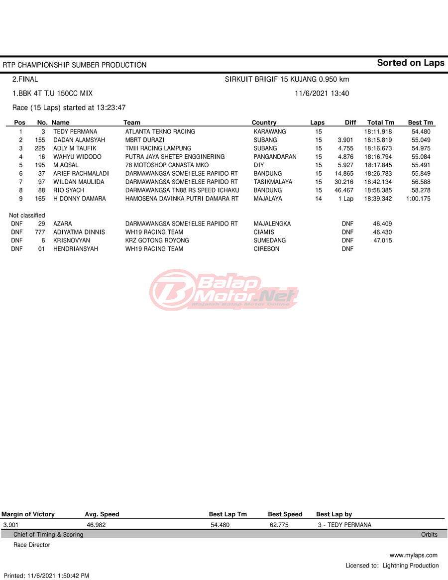 BalapMotor.Net – Berikut hasil race tiap kelas pada gelaran RTP Sumber Production Championship Road Race yang berlangsung di sirkuit NP Brigif 15 Kujang II Cimahi, Jawa Barat pada 6 November 2021.