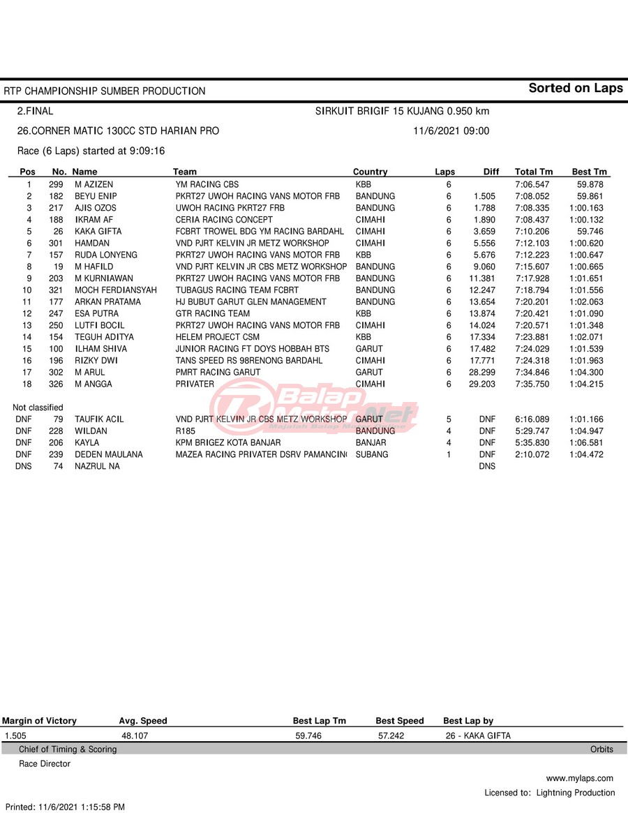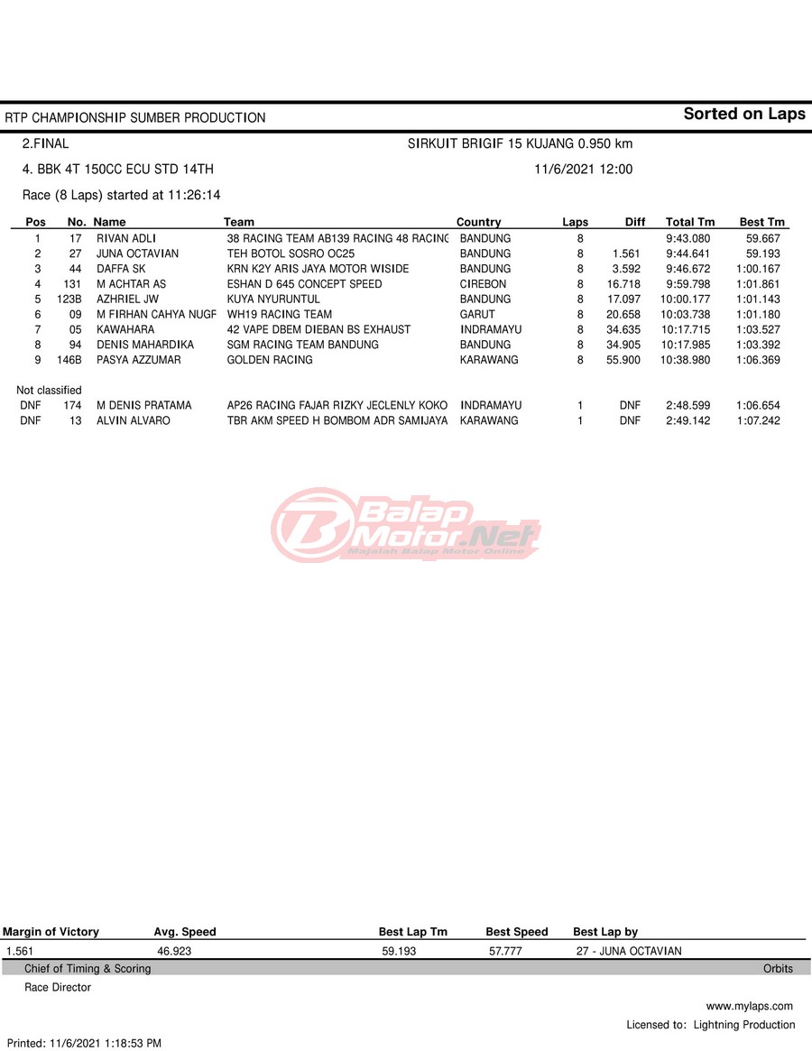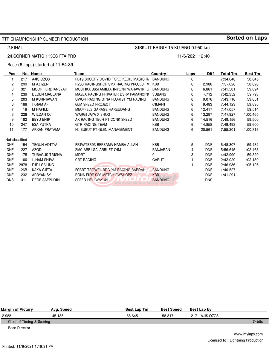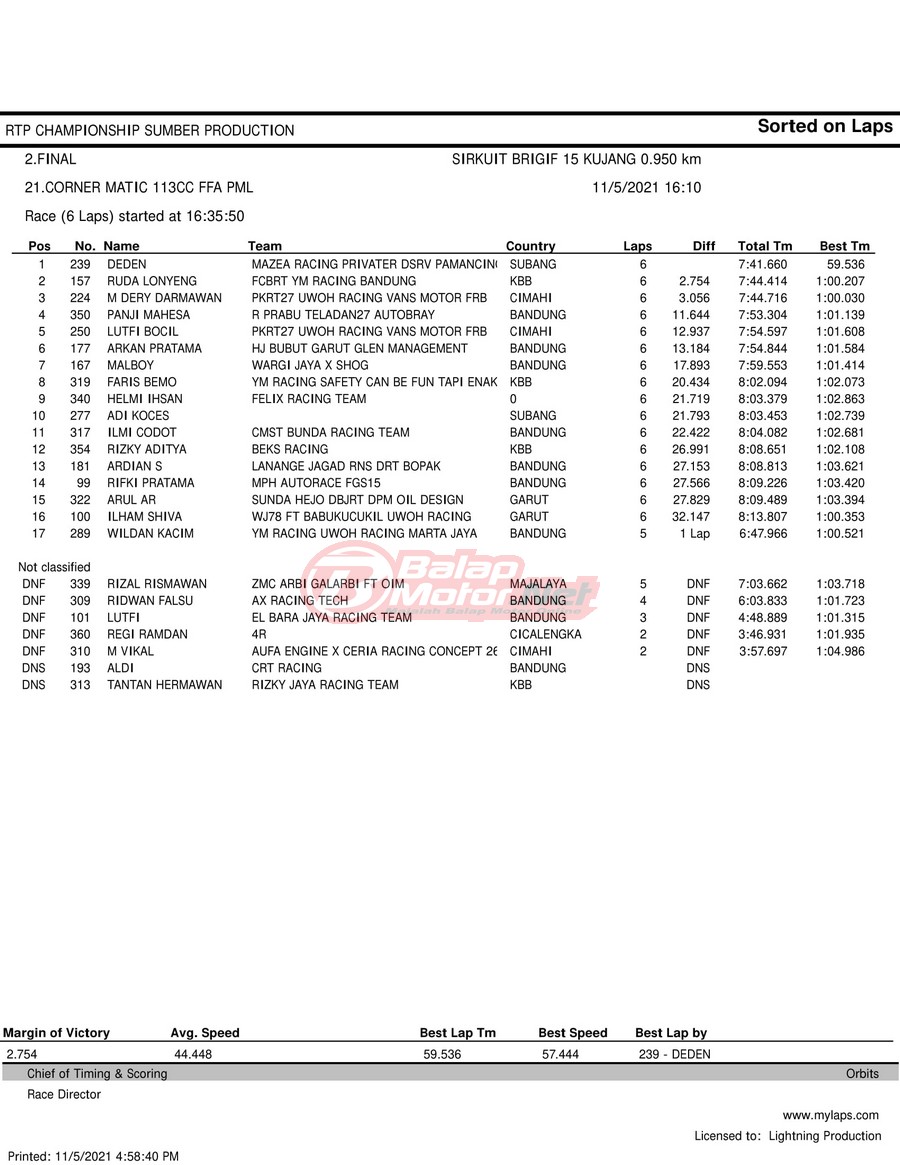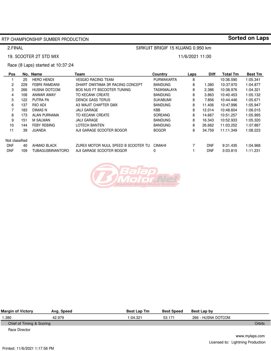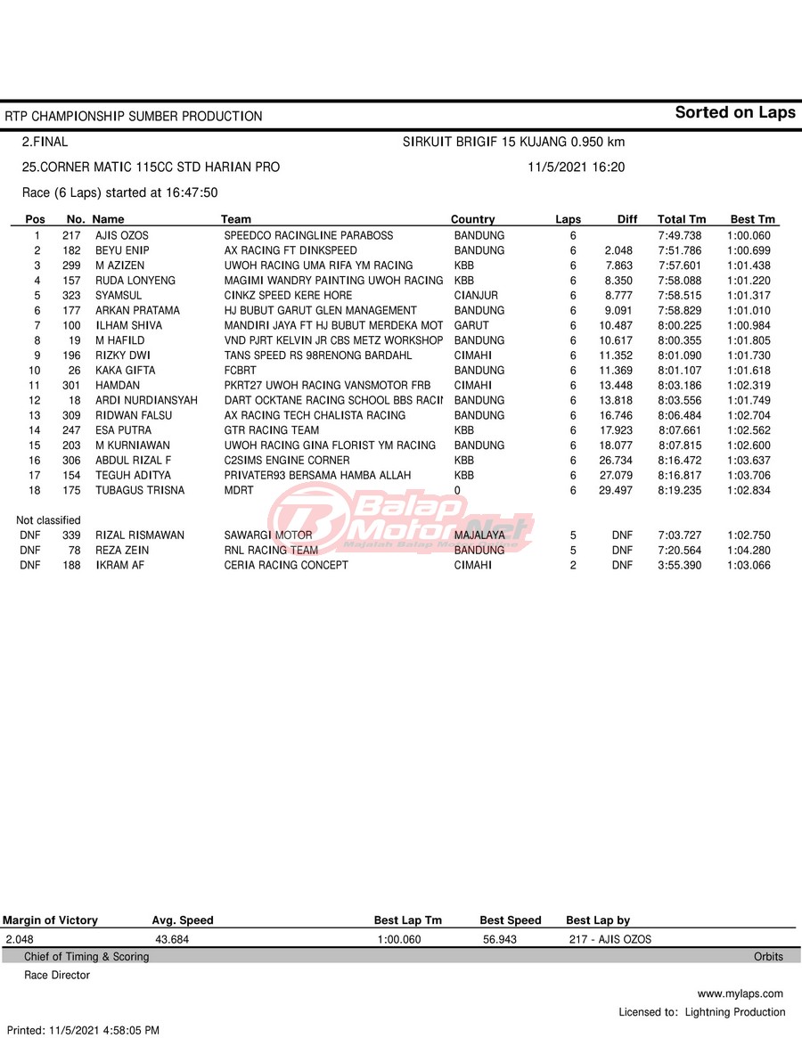 BalapMotor.Net – Berikut hasil race tiap kelas pada gelaran RTP Sumber Production Championship Road Race yang berlangsung di sirkuit NP Brigif 15 Kujang II Cimahi, Jawa Barat pada 6 November 2021.