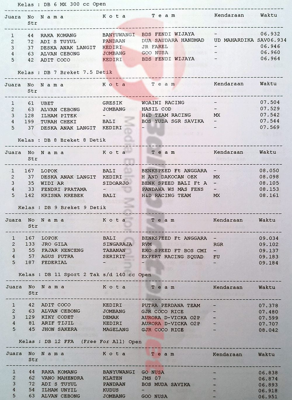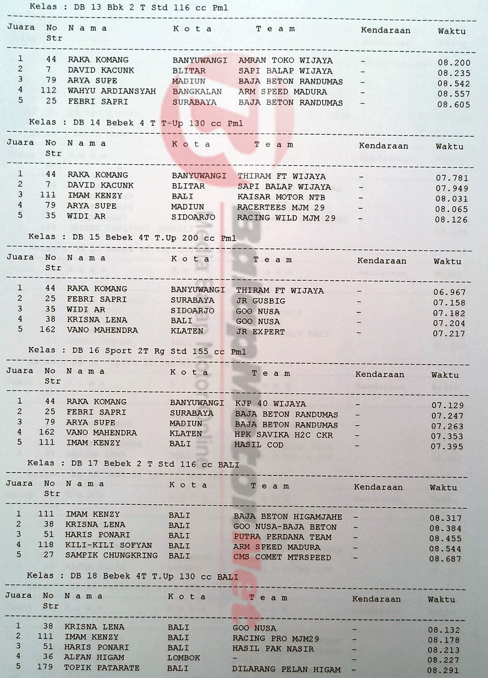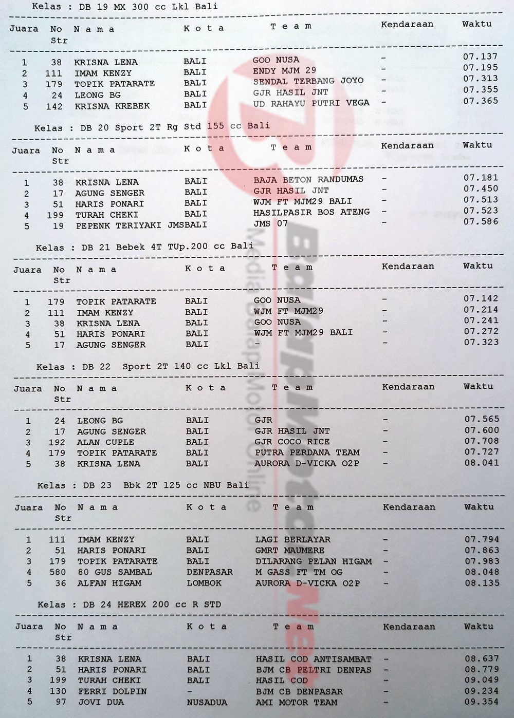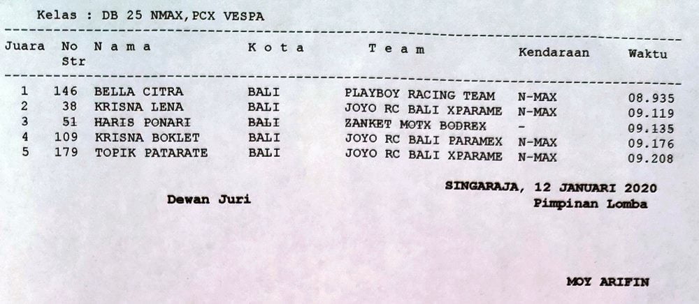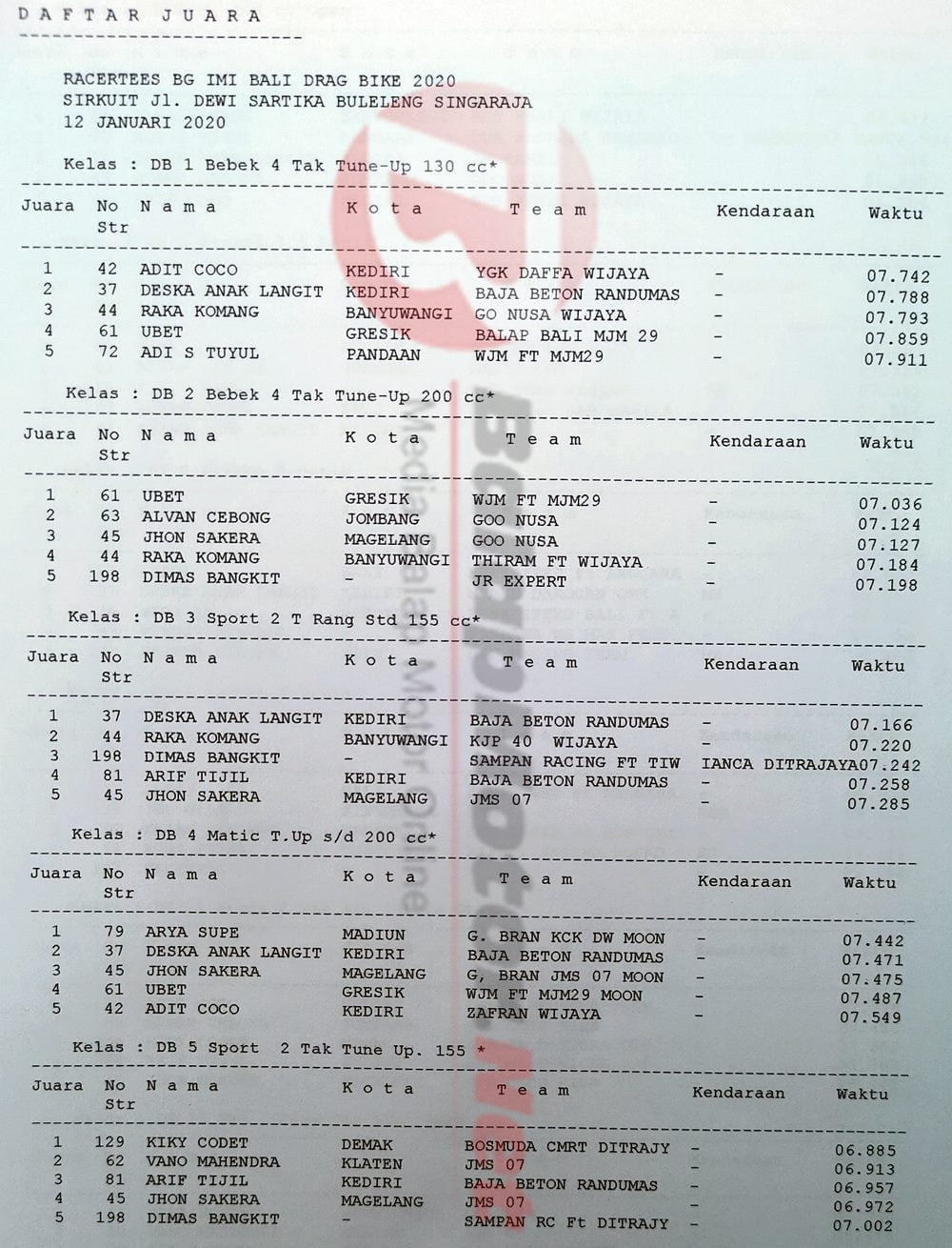 BalapMotor.Net – Berikut kami paparkan hasil kejuaraan balap motor Racertees BG IMI Bali Drag Bike 2020 yang berlangsung di sirkuit NP. Jl. Dewi Sartika, Buleleng, Singaraja, Bali pada Minggu 12 Januari 2020. | Yugo