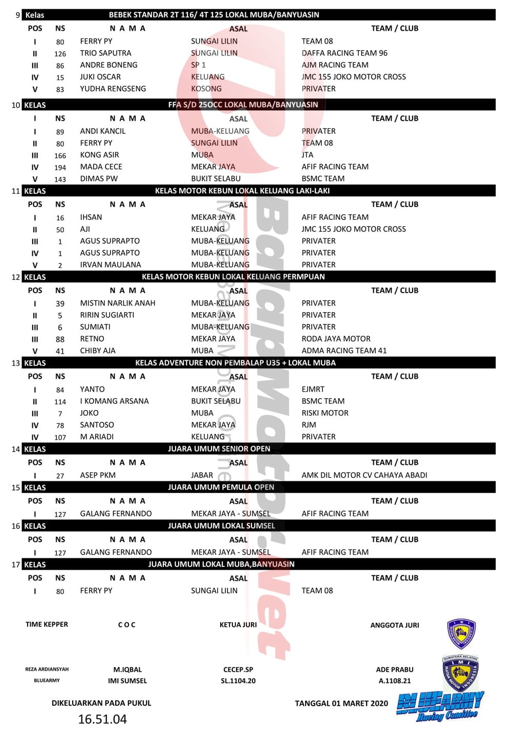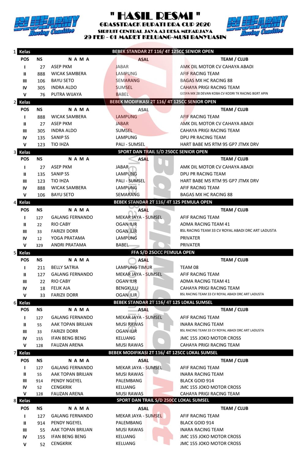 Hasil Resmi Grasstrack Bupati DRA Cup 2020Penulis Balapmotor.net - 02/03/2020 BalapMotor.Net – Berikut ini merupakan hasil resmi Grasstrack Bupati DRA Cup 2020. Kejuaraan balap garuk tanah kali ini berlangsung di Sirkuit central jaya A3 Desa mekarjaya pada 28 Februari hingga 01 Maret 2020. |Budi