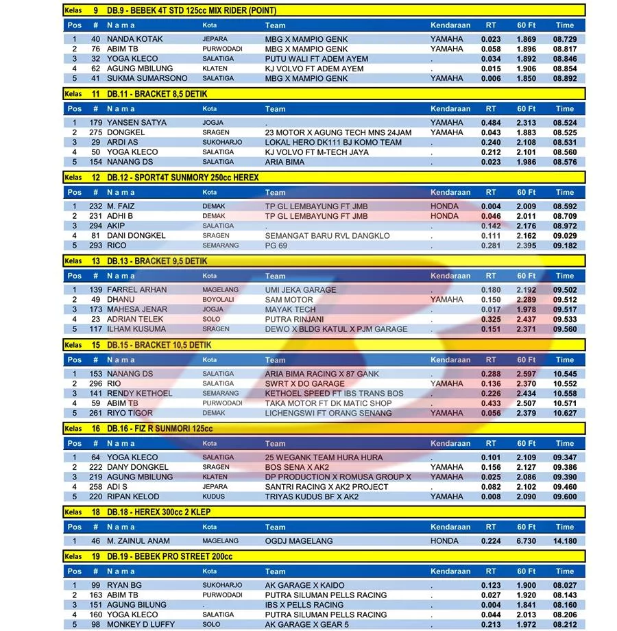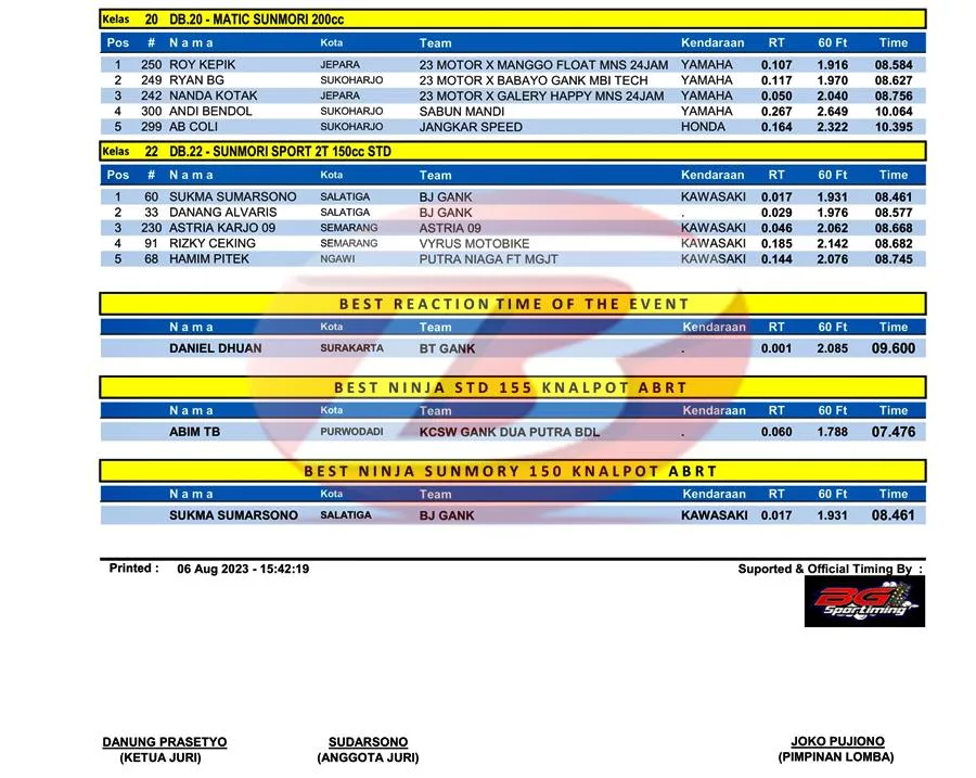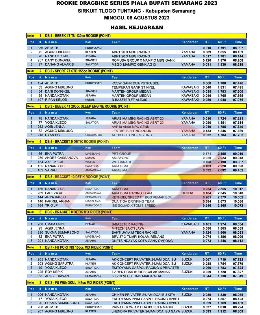BalapMotor.Net – Berikut merupakan hasil kejuaraan balap lurus Rookie Drag Bike Series Piala Bupati Semarang yang berlangsung di sirkuit Tlogo, Tuntang, Kab. Semarang pada Minggu 6 Agustus 2023. (***)