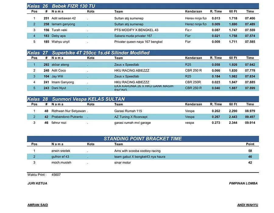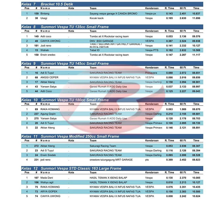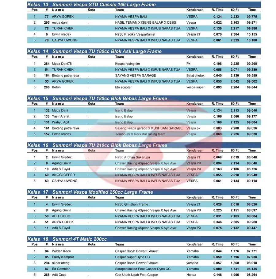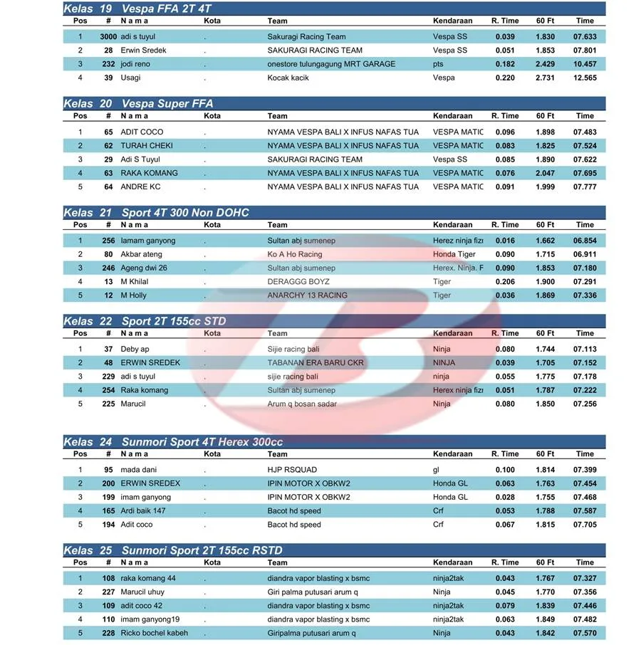 BalapMotor.Net – Berikut merupakan hasil kejuaraan balap lurus Scooterland Sakuragi Independence Day yang berlangsung di sirkuit Atlantis Pantai Ria Kenjeran, Surabaya pada Minggu 10 November 2024. (***)