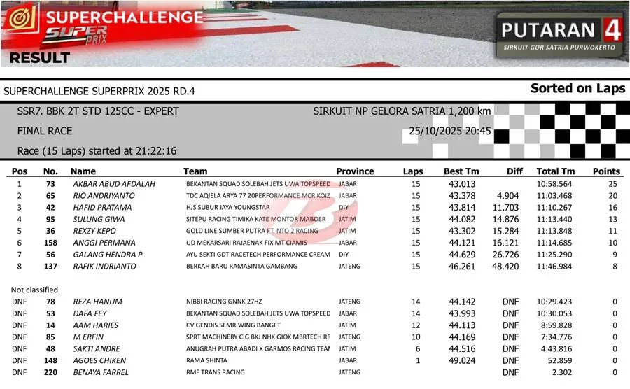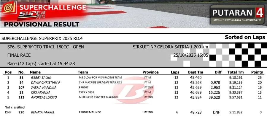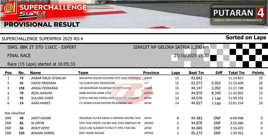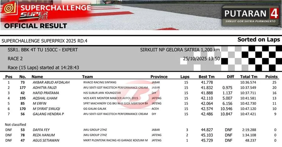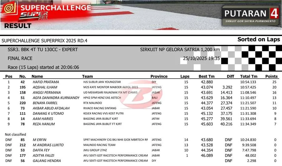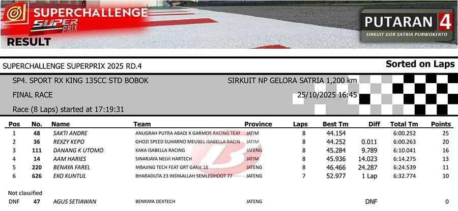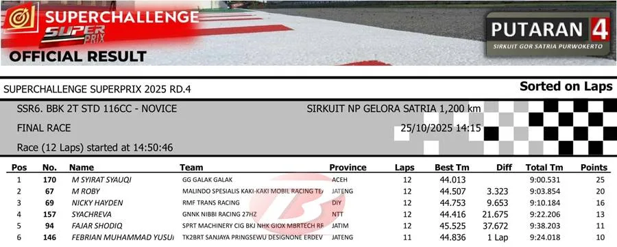 BalapMotor.Net – Berikut merupakan hasil lengkap Kejuaraan Superchallenge Superprix Seri 4 yang berlangsung di sirkuit NP. Gor Satria, Purwokerto pada 24-25 Oktober 2025. (**)