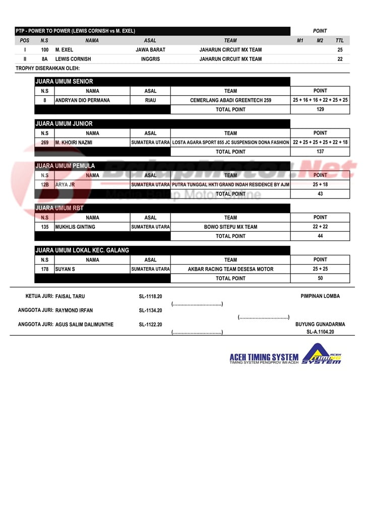 BalapMotor.Net – Berikut merupakan hasil resmi dari gelaran JC Supertrack National Championship 2020 – Seri 1 Trophy Sultan Serdang yang berlangsung di sirkuit Jaharun Centre Motocross & Grasstrack, Deli Serdang, Sumatera Utara. | A2M