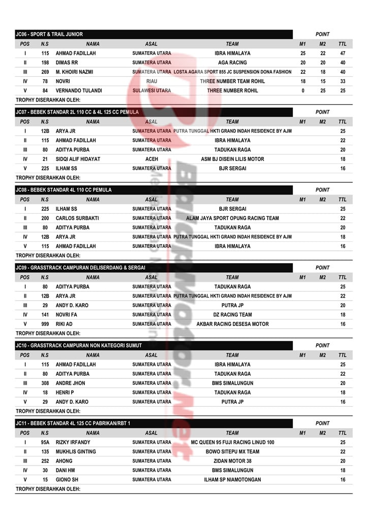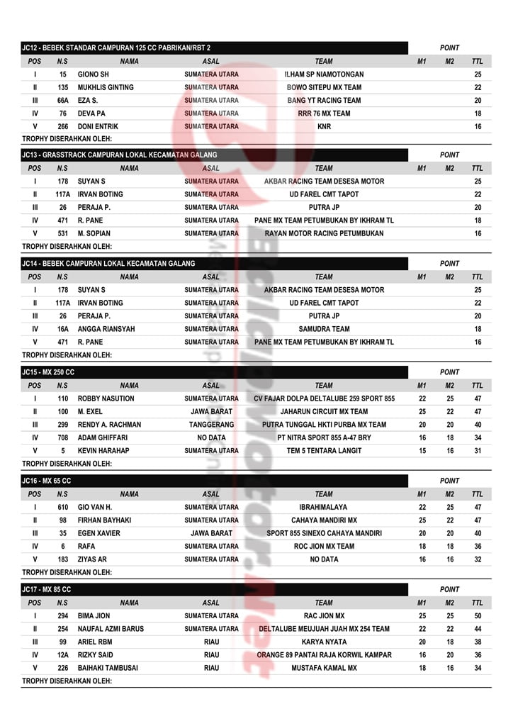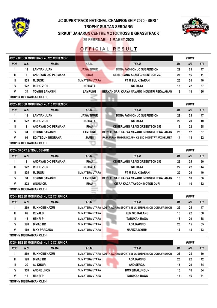 BalapMotor.Net – Berikut merupakan hasil resmi dari gelaran JC Supertrack National Championship 2020 – Seri 1 Trophy Sultan Serdang yang berlangsung di sirkuit Jaharun Centre Motocross & Grasstrack, Deli Serdang, Sumatera Utara. | A2M