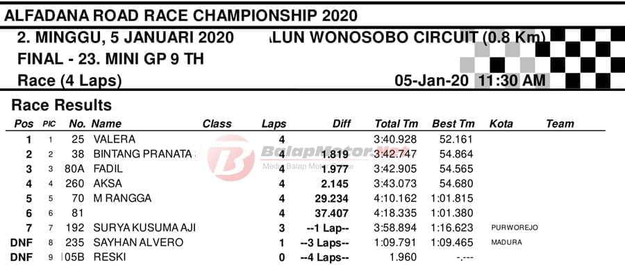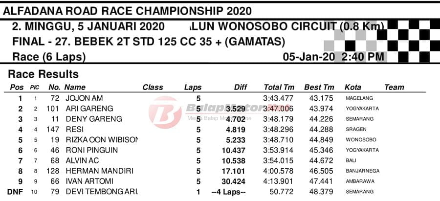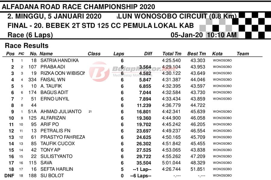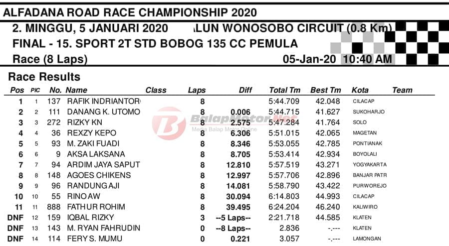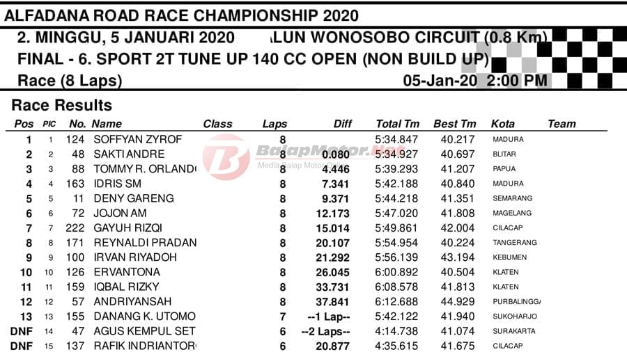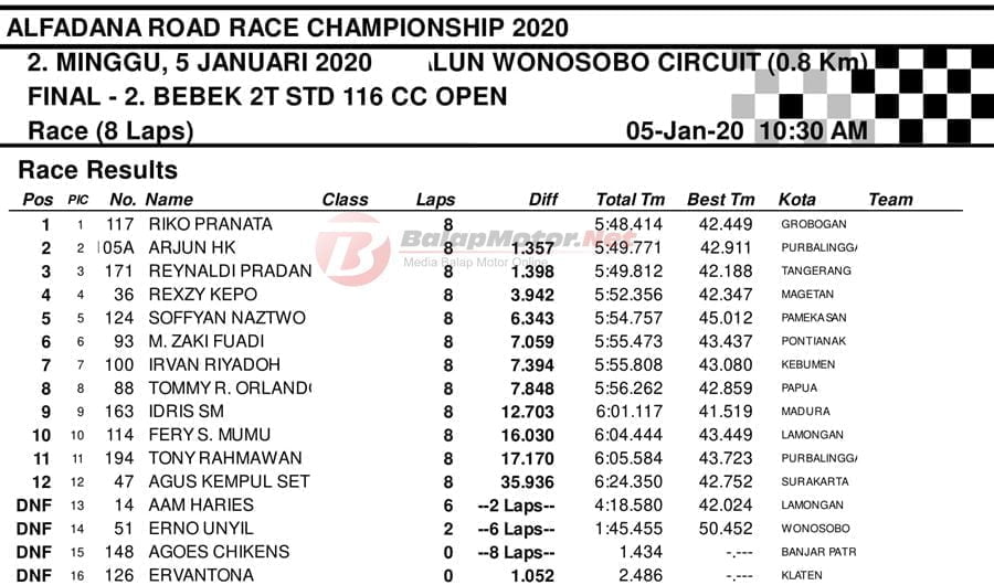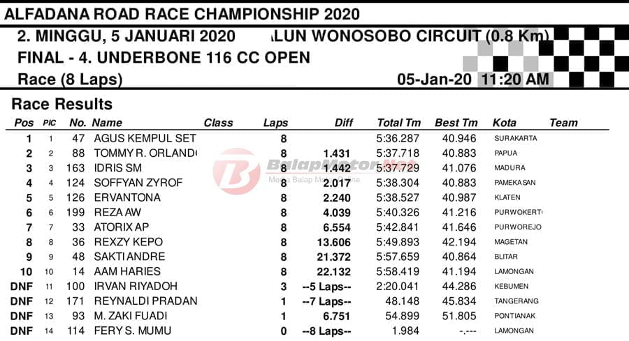 BalapMotor.Net – Berikut kami paparkan hasil setiap kelas kejuaraan balap motor bertajuk Alfadana Road Race Championship 2020 yang akan berlangsung di sirkuit NP. Alun-alun Wonosobo, Jateng pada 4-5 Januari 2020. | Yugo