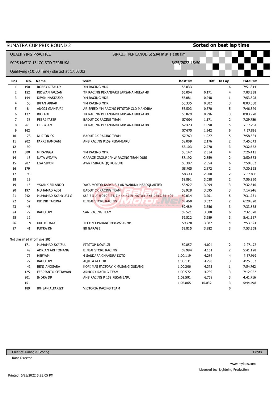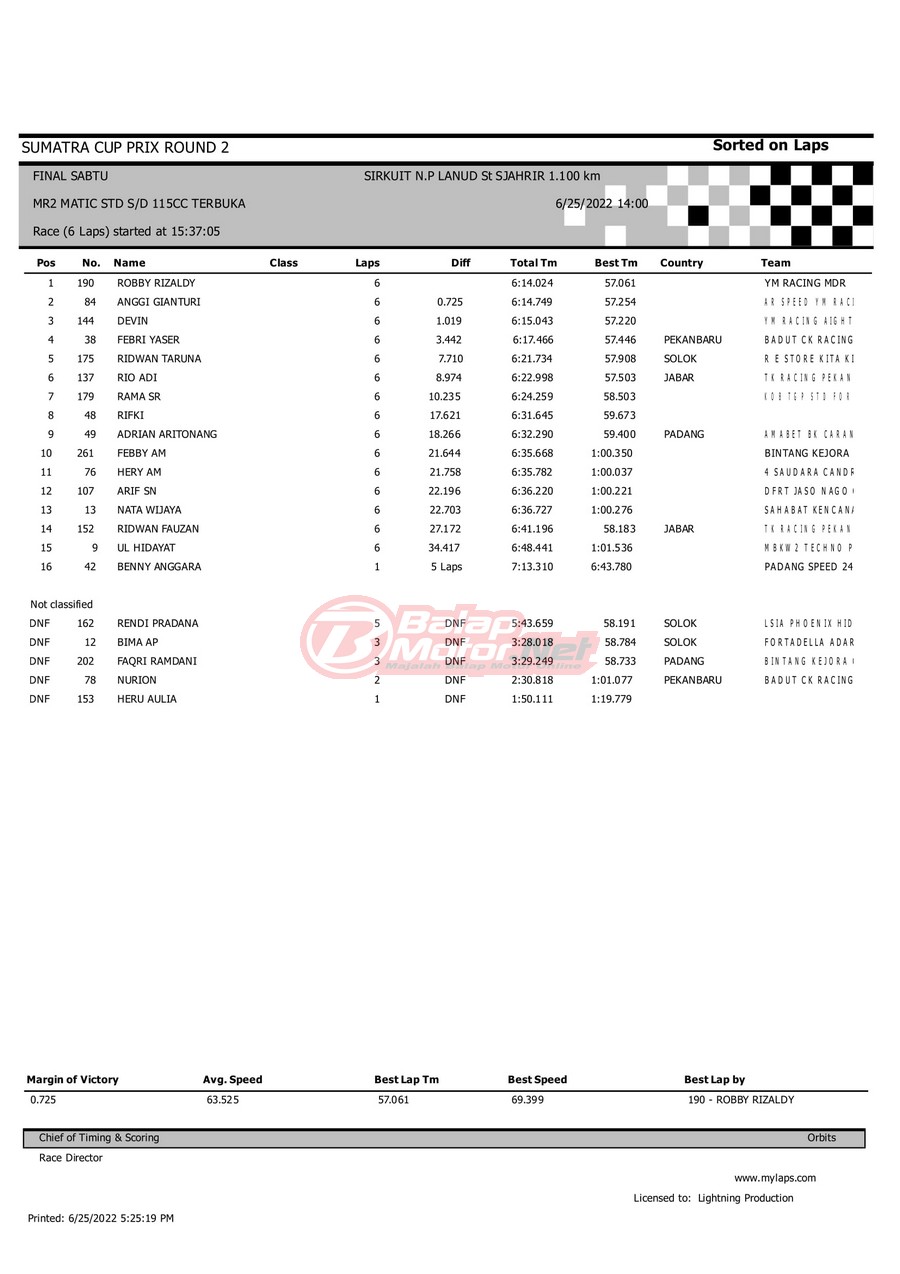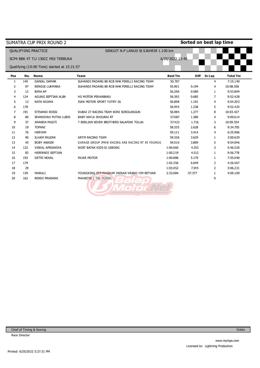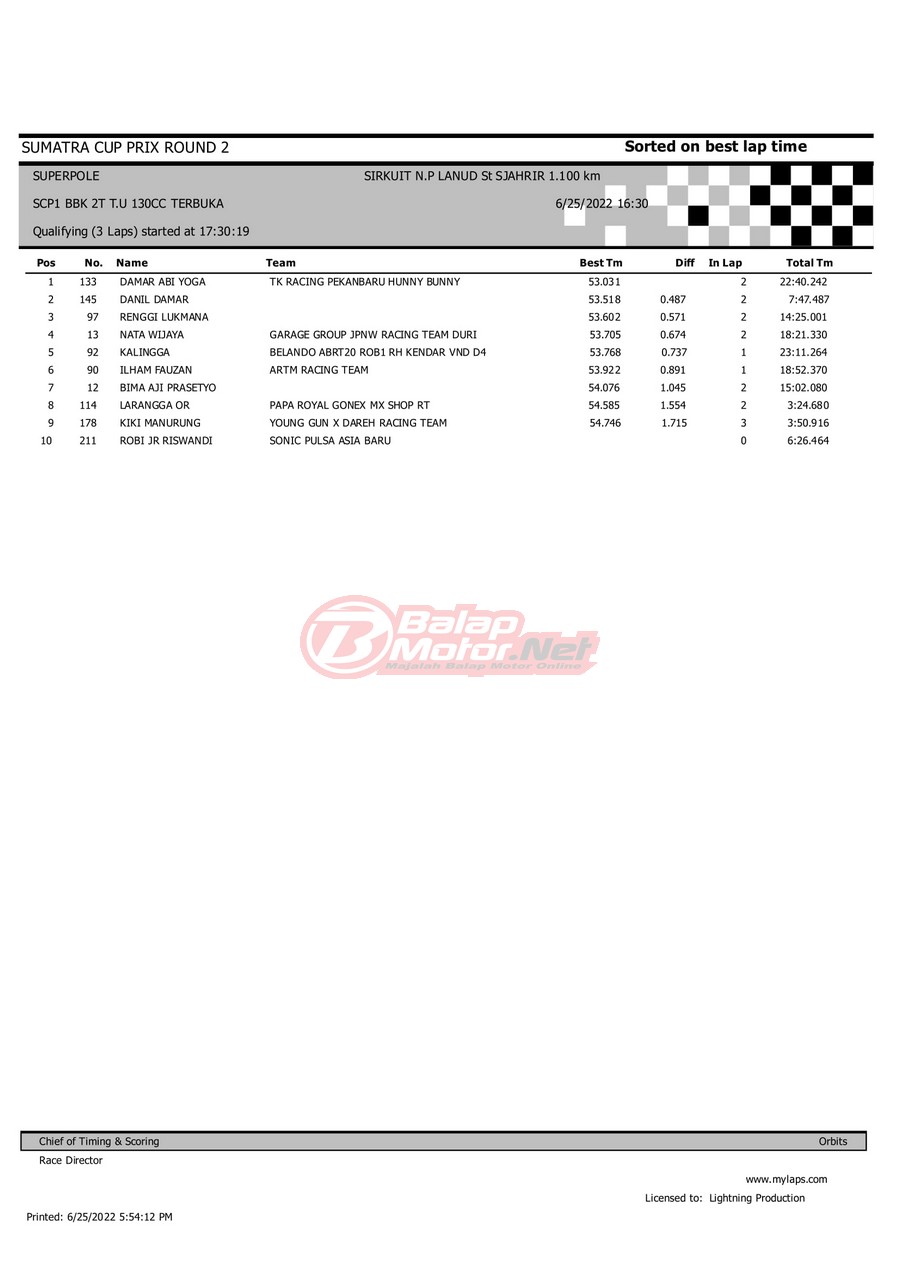 BalapMotor.Net – Berikut merupakan hasil dari gelaran Sumatera Cup Prix (SCP) 2022 ronde kedua yang berlangsung di sirkuit NP Lanud Tabing, Kota Padang-Sumatera Barat untuk sesi QTT dan Final hari Sabtu (25/6). |Laely Popeye