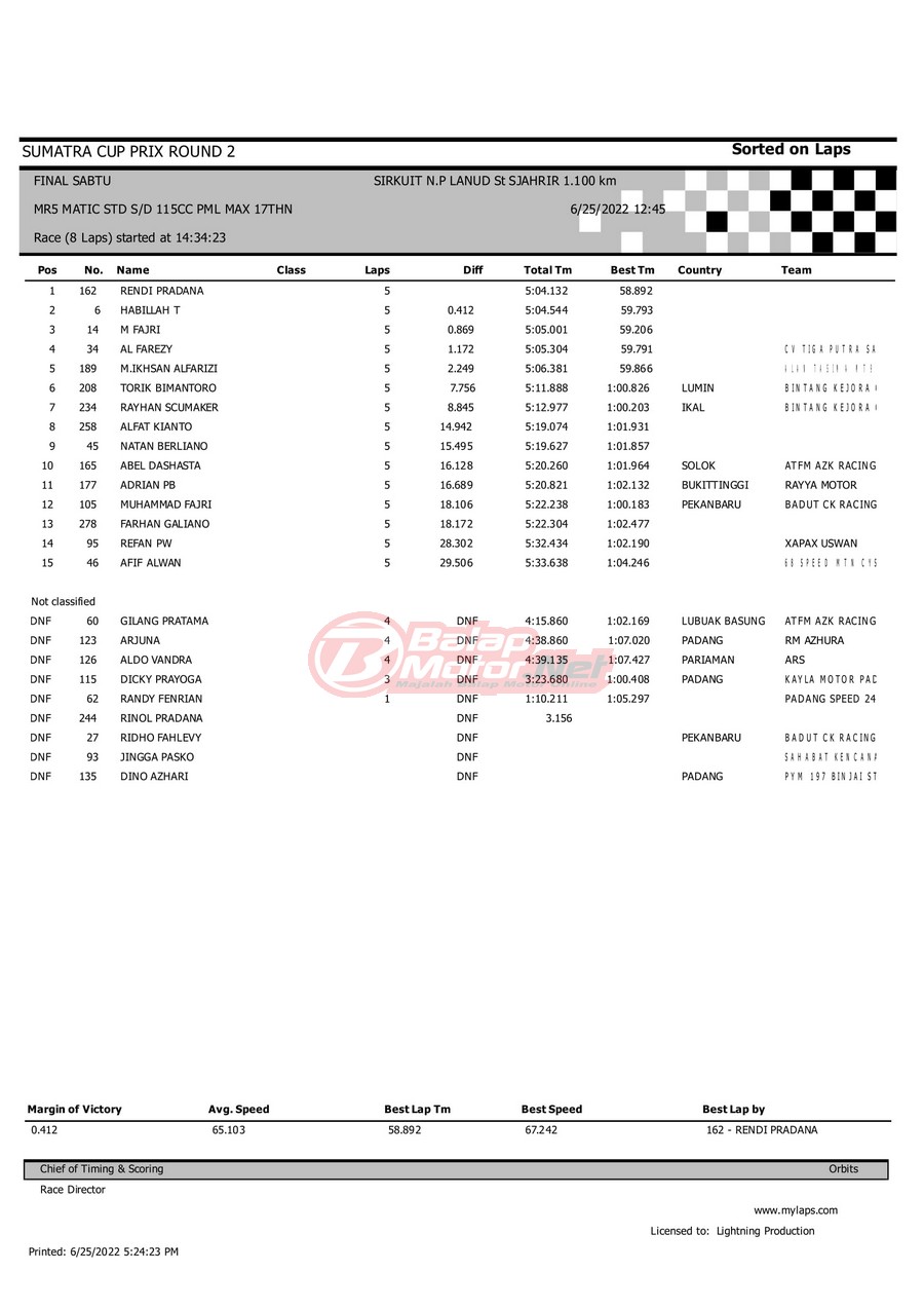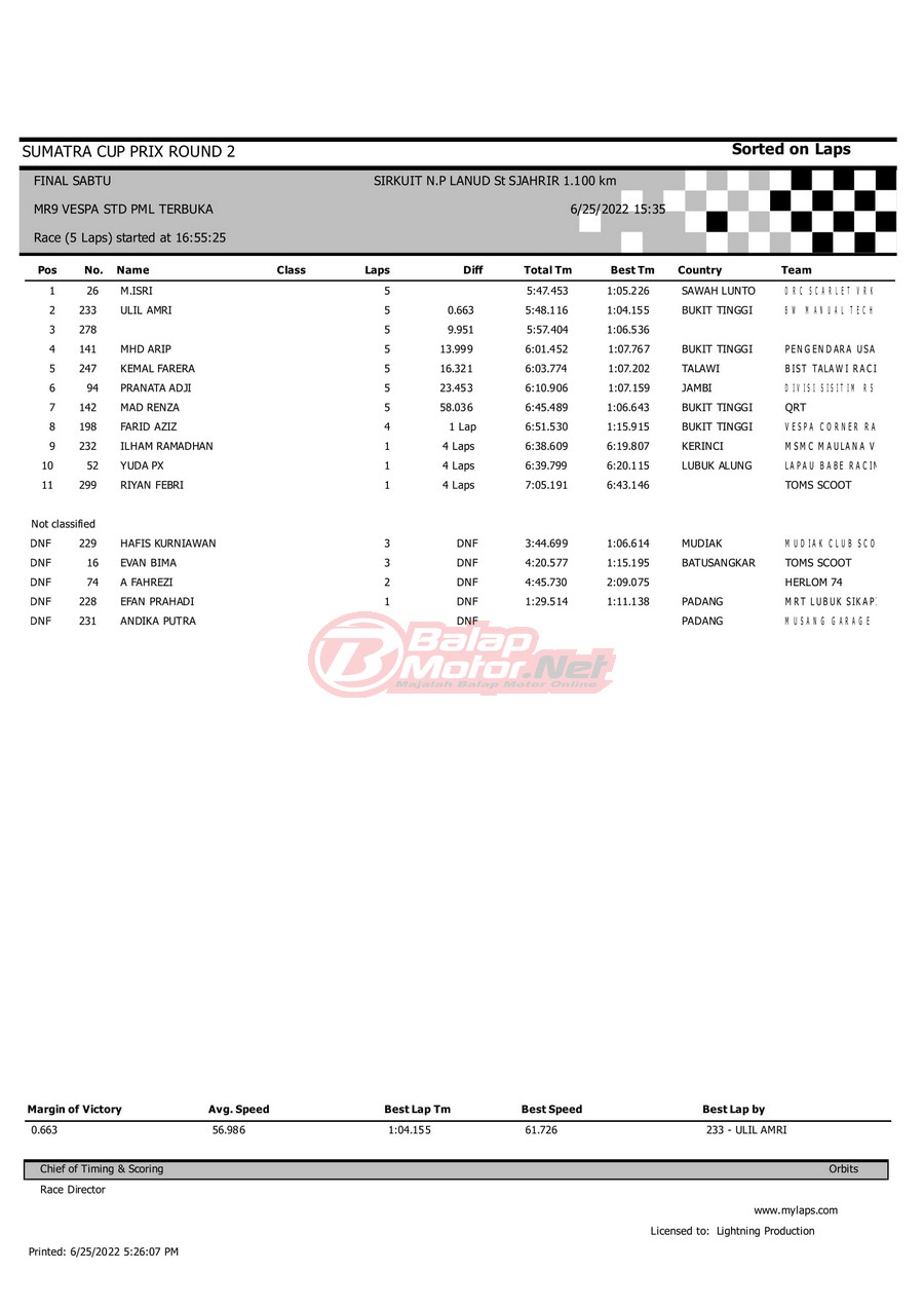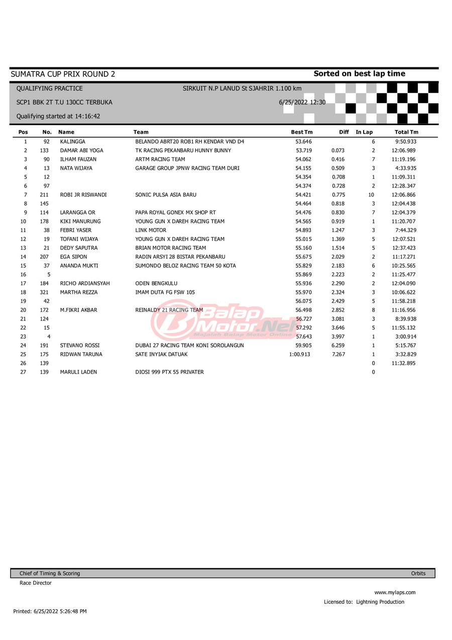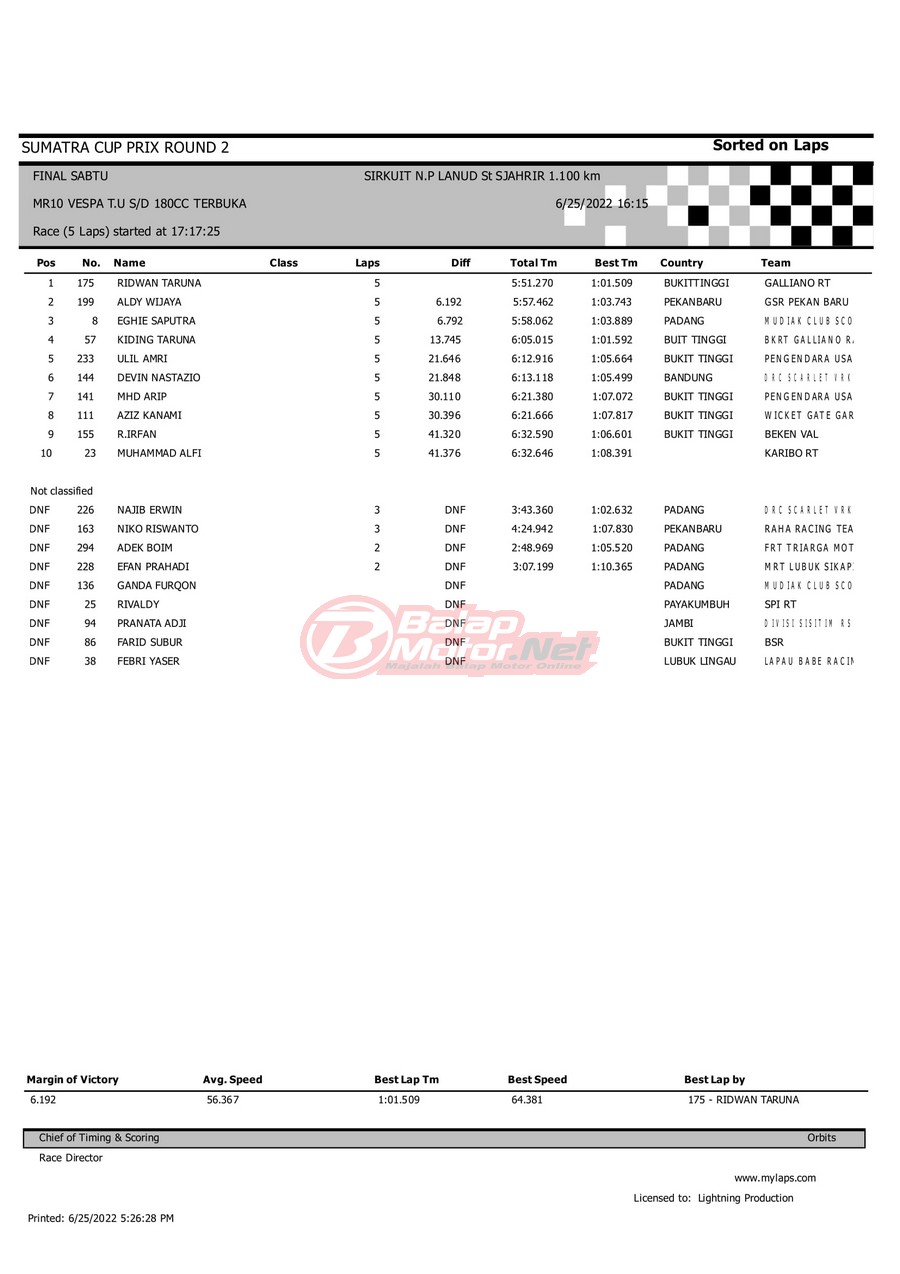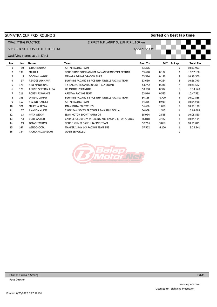 BalapMotor.Net – Berikut merupakan hasil dari gelaran Sumatera Cup Prix (SCP) 2022 ronde kedua yang berlangsung di sirkuit NP Lanud Tabing, Kota Padang-Sumatera Barat untuk sesi QTT dan Final hari Sabtu (25/6). |Laely Popeye