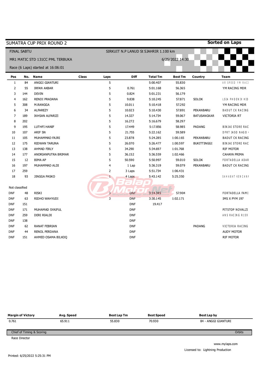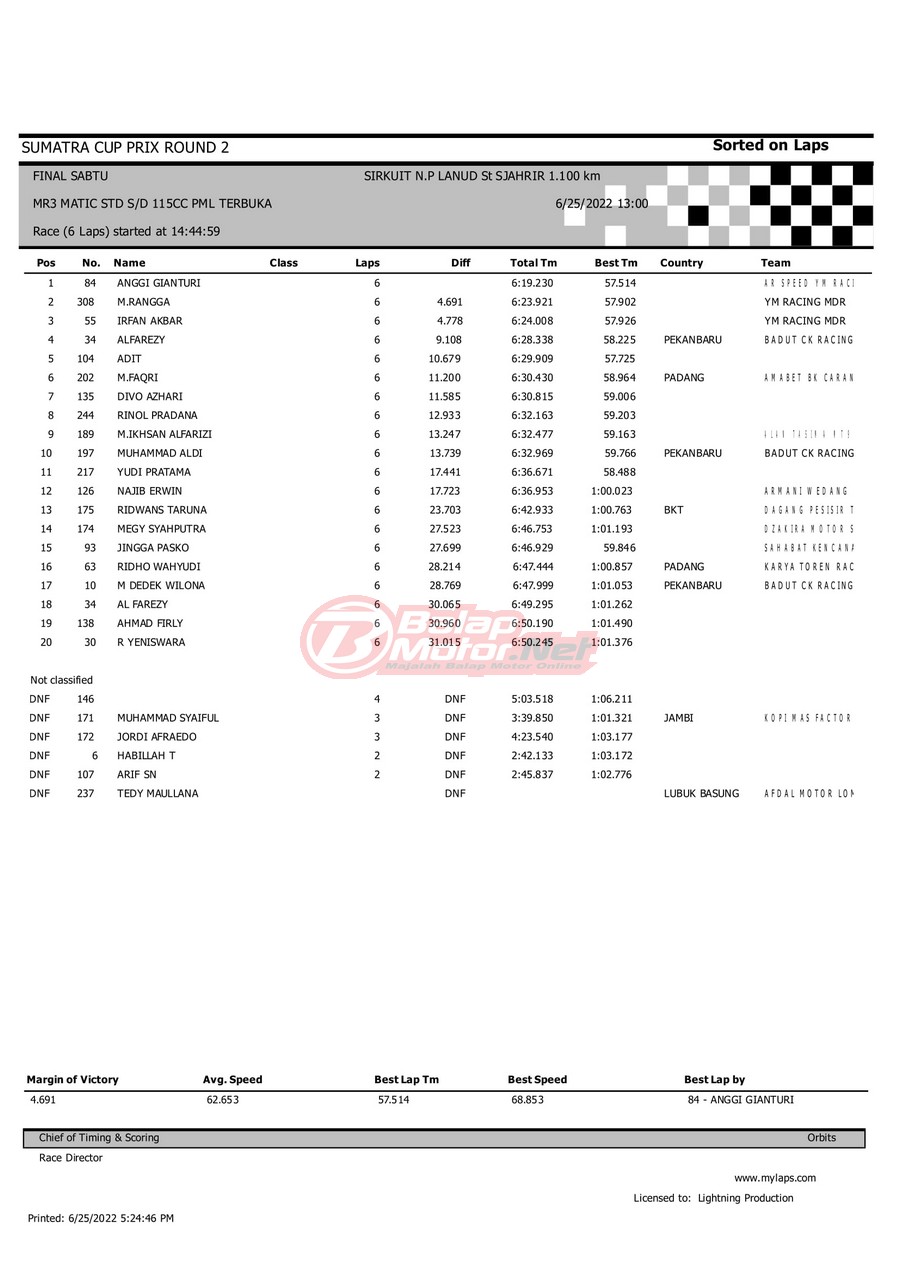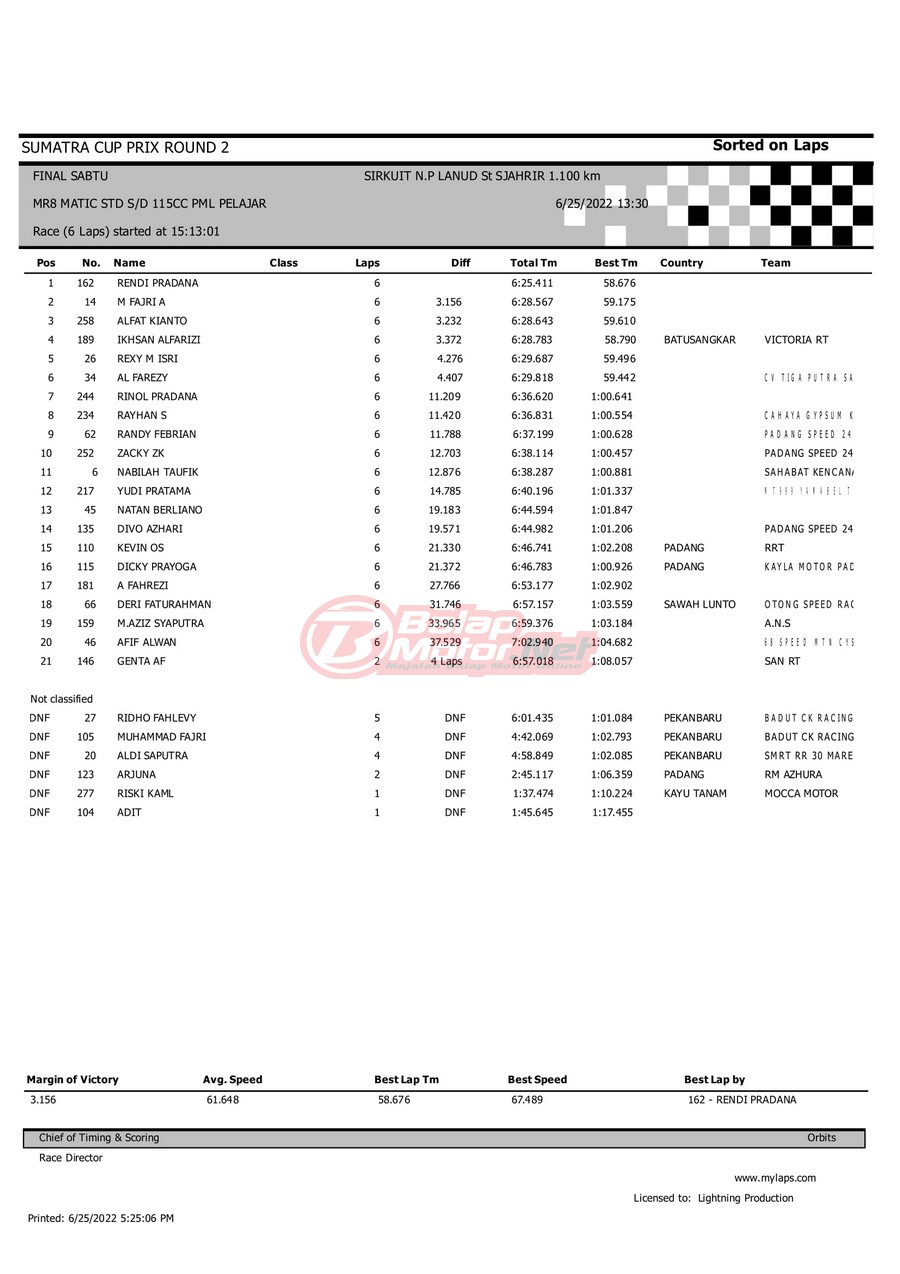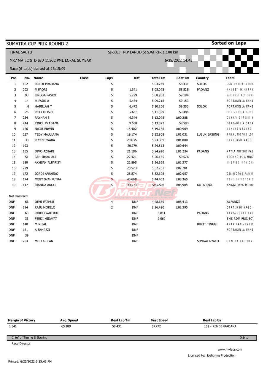 BalapMotor.Net – Berikut merupakan hasil dari gelaran Sumatera Cup Prix (SCP) 2022 ronde kedua yang berlangsung di sirkuit NP Lanud Tabing, Kota Padang-Sumatera Barat untuk sesi QTT dan Final hari Sabtu (25/6). |Laely Popeye