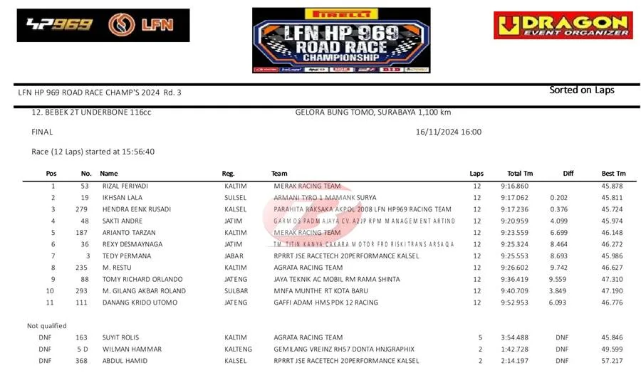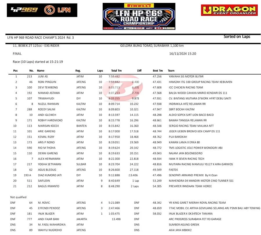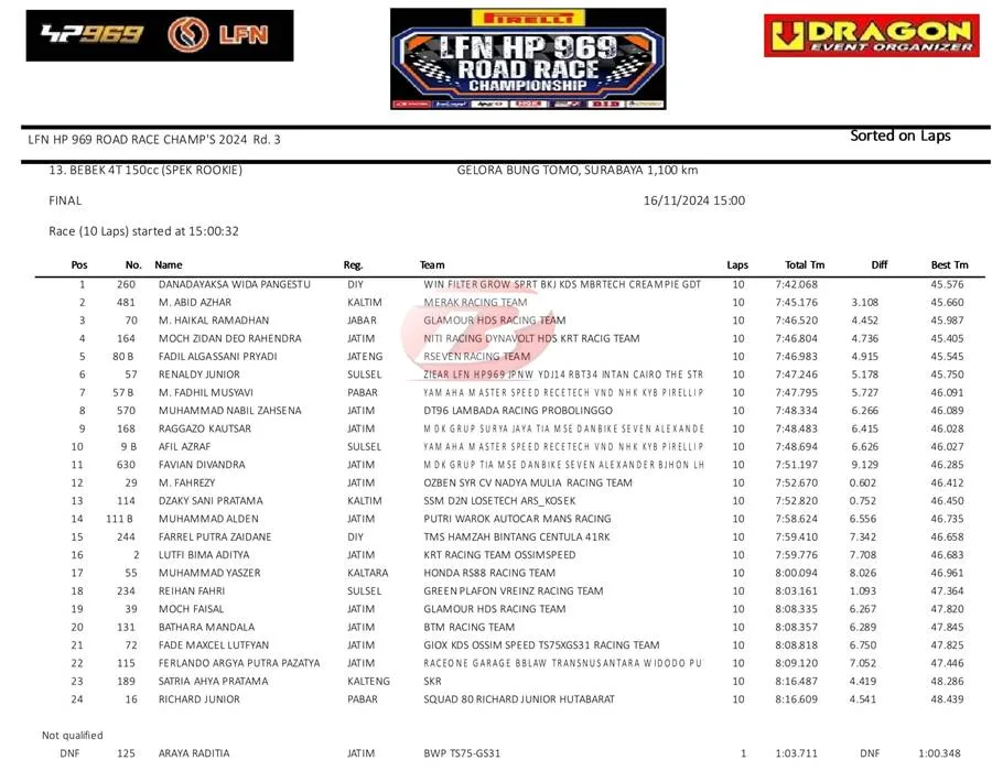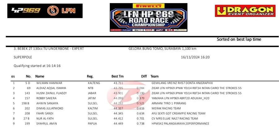 BalapMotor.Net – Berikut merupakan hasil juara kelas supporting dan superpole di final LFN HP969 Road Race Championship 2024 yang berlangsung di sirkuit Gelora Bung Tomo (GBT) Surabaya pada Sabtu 16 November 2024. (***)