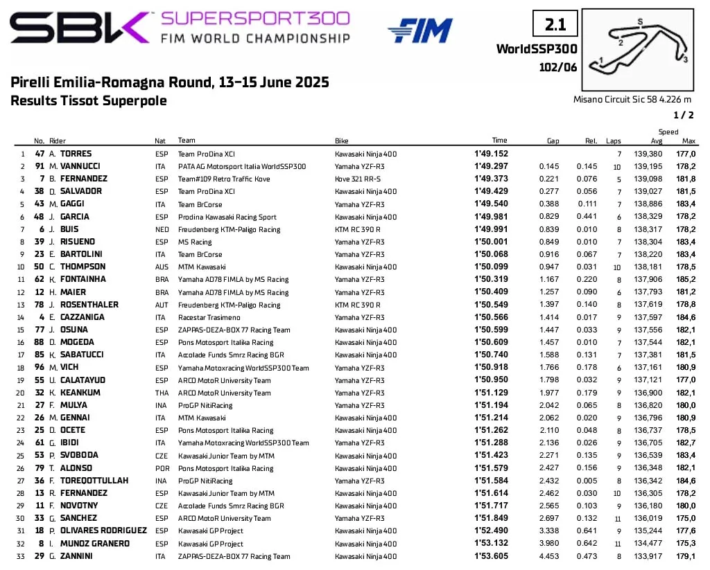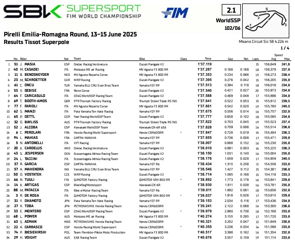 BalapMotor.Net – Berikut merupakan hasil sesi Superpole kejuaraan dunia Supersport yang berlangsung di sirkuit Misano, Italia pada Jumat 13 Juni 2025. (**)