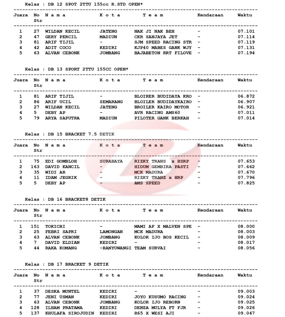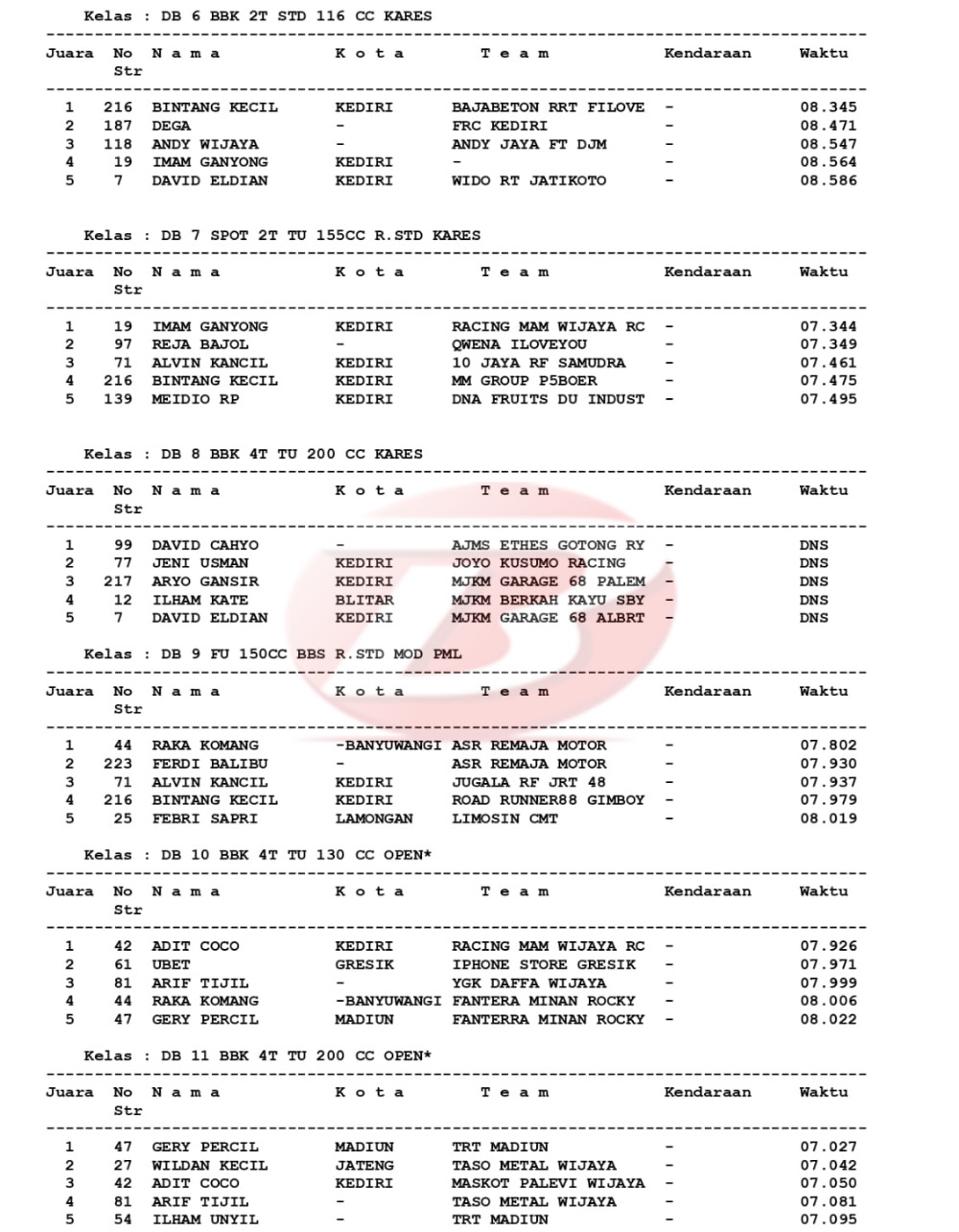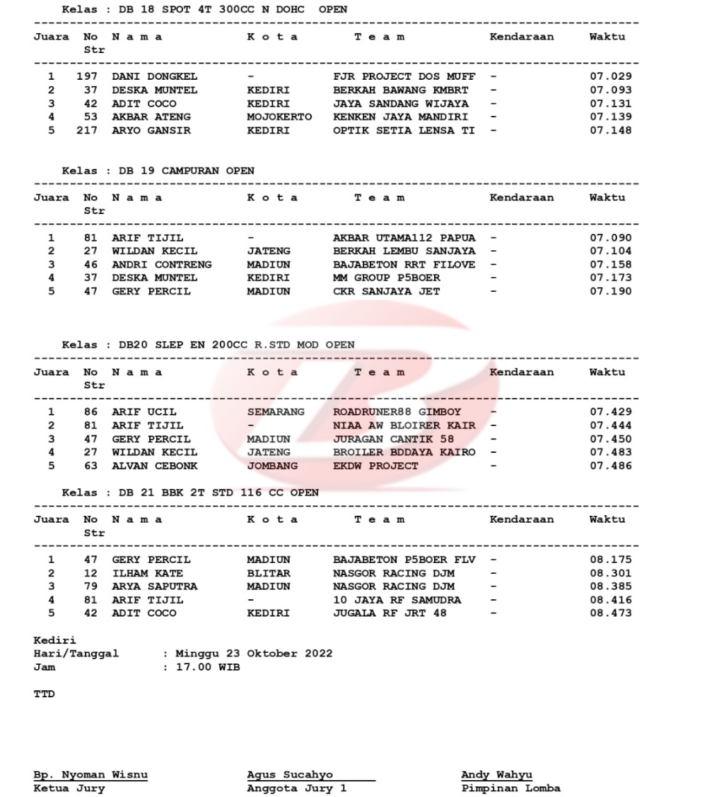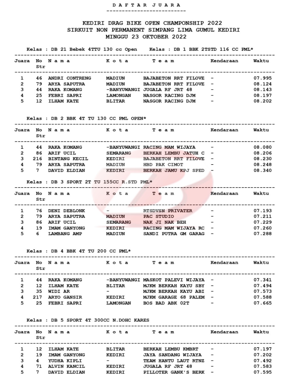 BalapMotor.Net – Berikut merupakan hasil kejuaraan balap lurus 201m bertajuk Suryanation Motorland Racing Work Dragbike Kediri Open Championship 2022 yang berlangsung di sirkuit NP. Simpang Lima Gumul, Kabupaten Kediri, Jawa Timur pada Minggu 23 Oktober 2022.