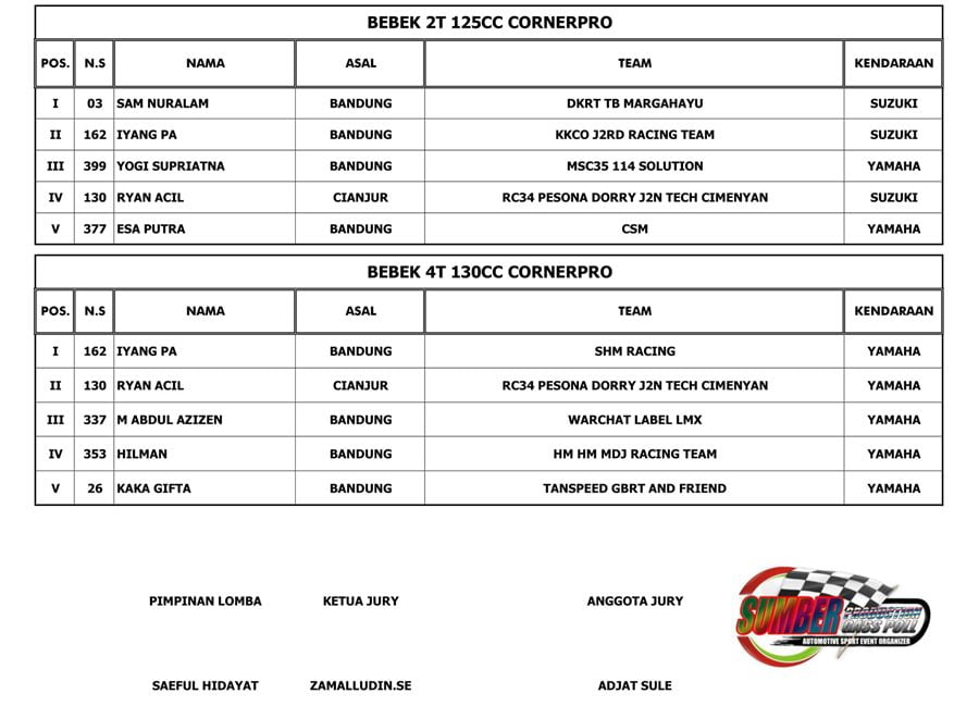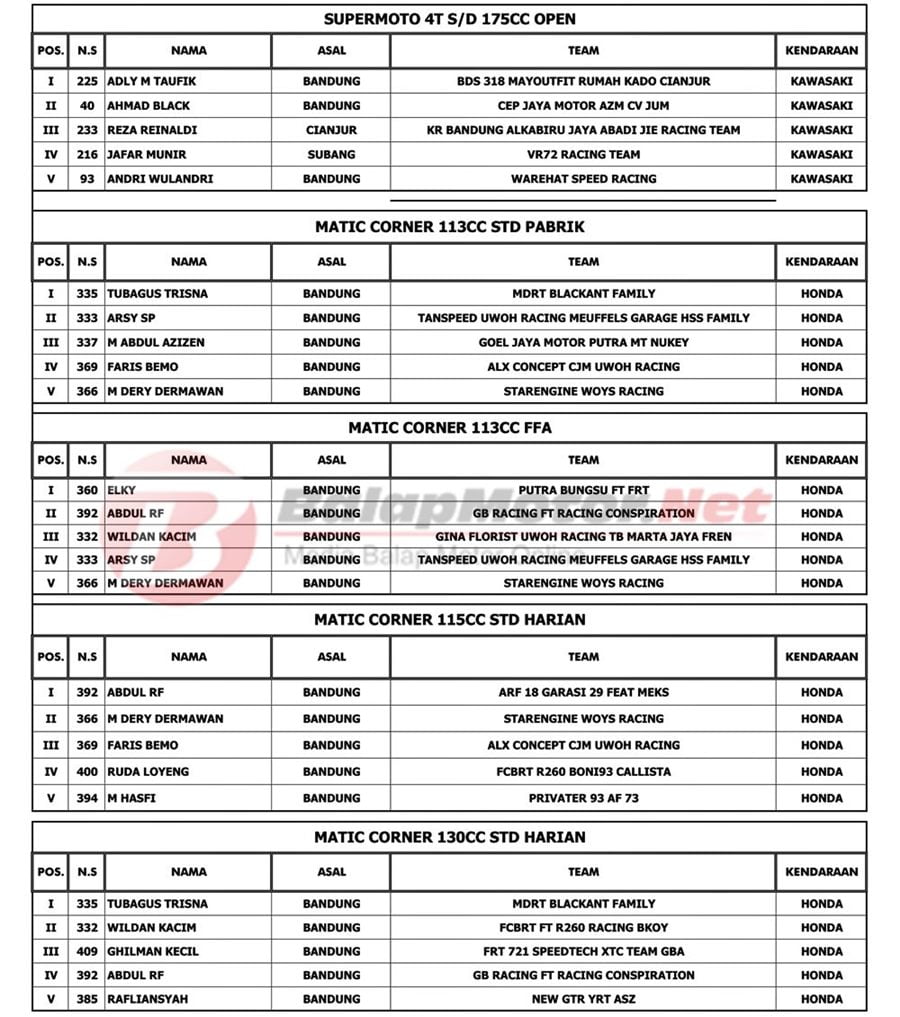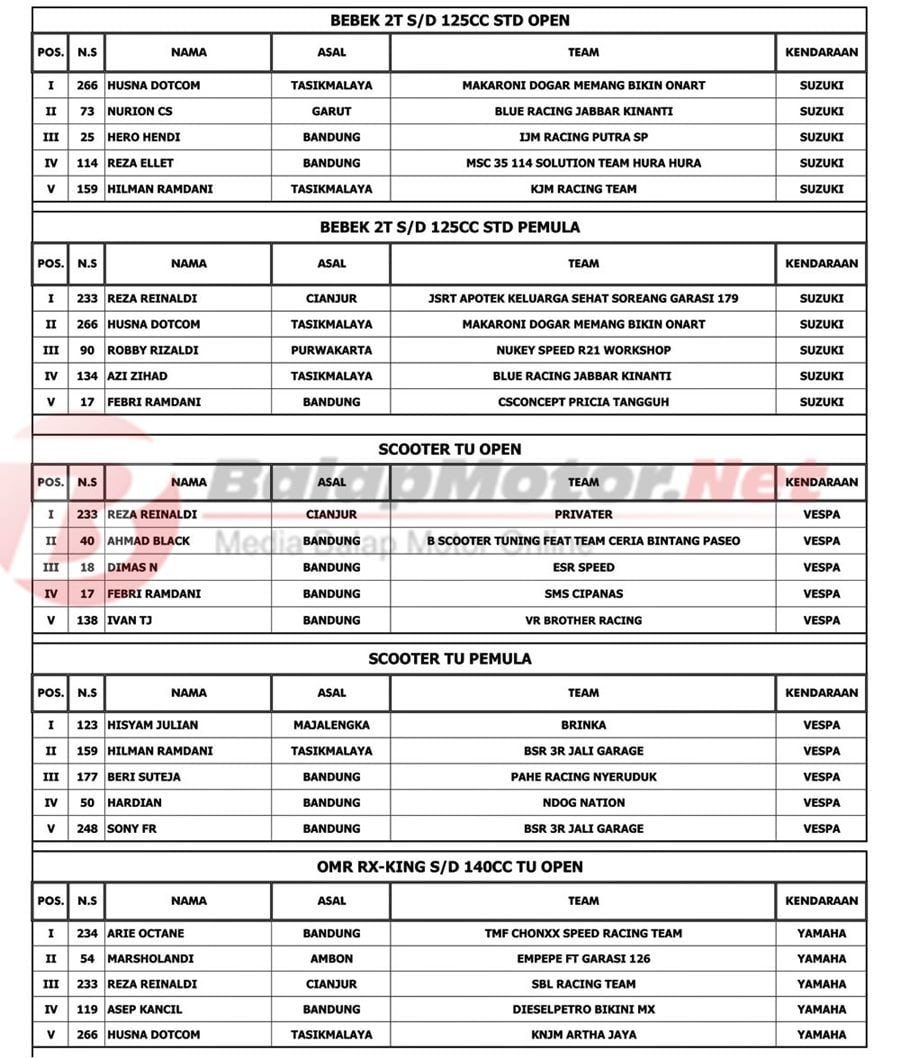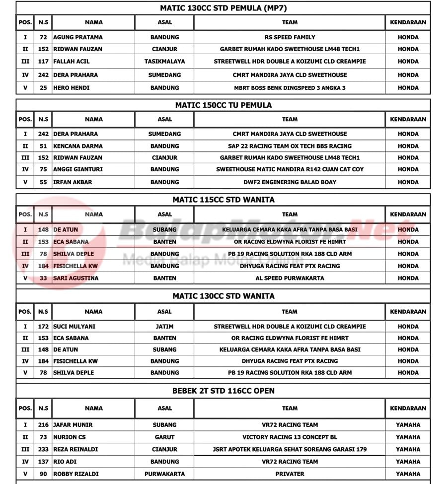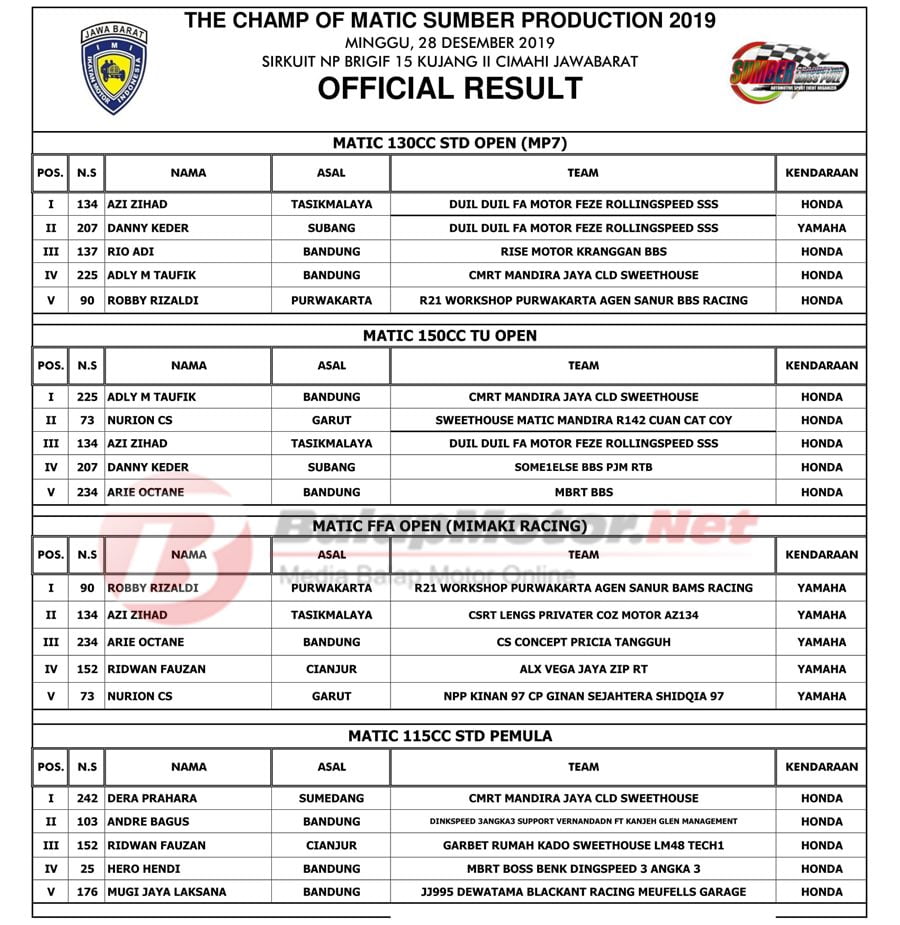 BalapMotor.Net – Berikut kami paparkan hasil kejuaraan The Champ Of Matic Sumber Productions 2019 yang berlangsung di sirkuit Brigif Cimahi, Jawa Barat pada Sabtu 28 Desember 2019. | Tim