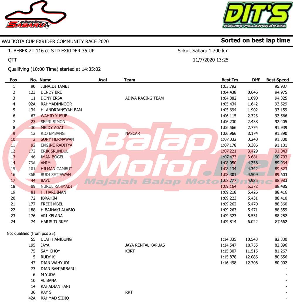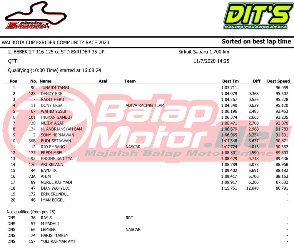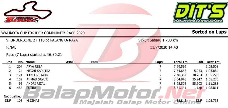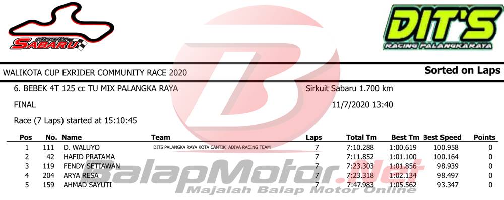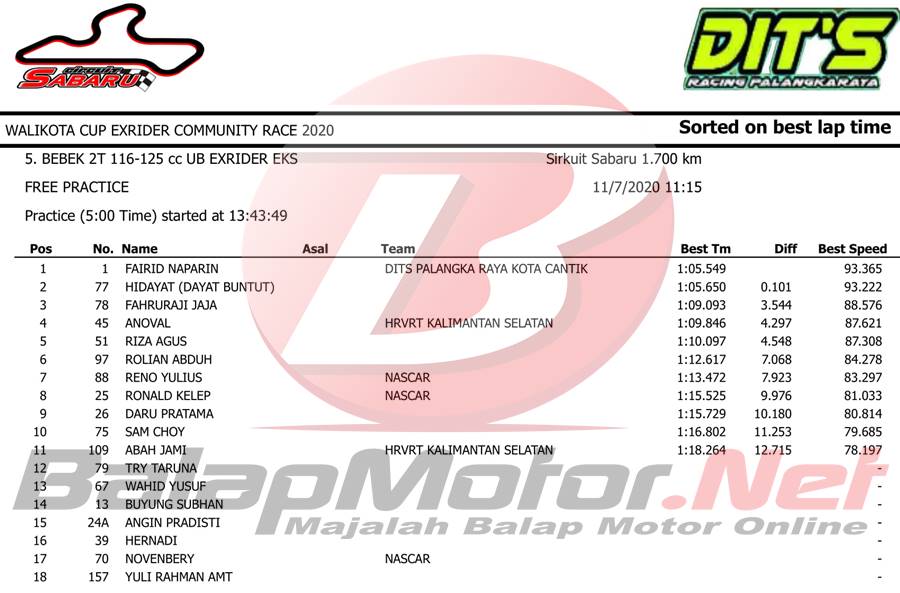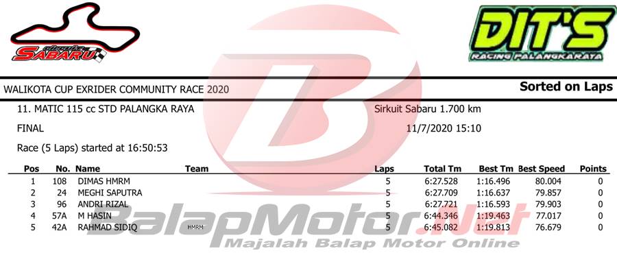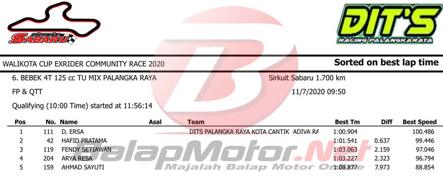 BalapMotor.Net – Berikut merupakan hasil sesi hari Sabtu (7/11) dari gelaran Walikota Cup Exrider Community Race 2020 yang berlangsung di sirkuit permanen Sabaru Kota Palangkaraya, Kalimantan Tengah.