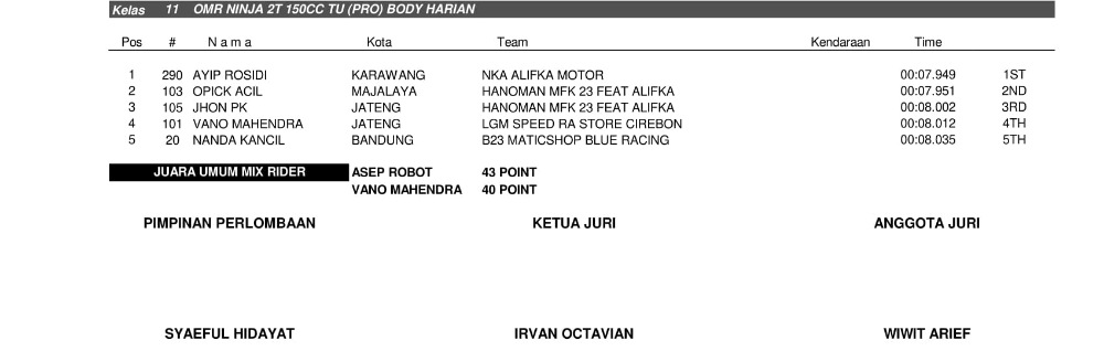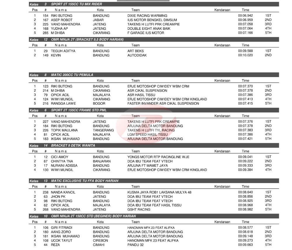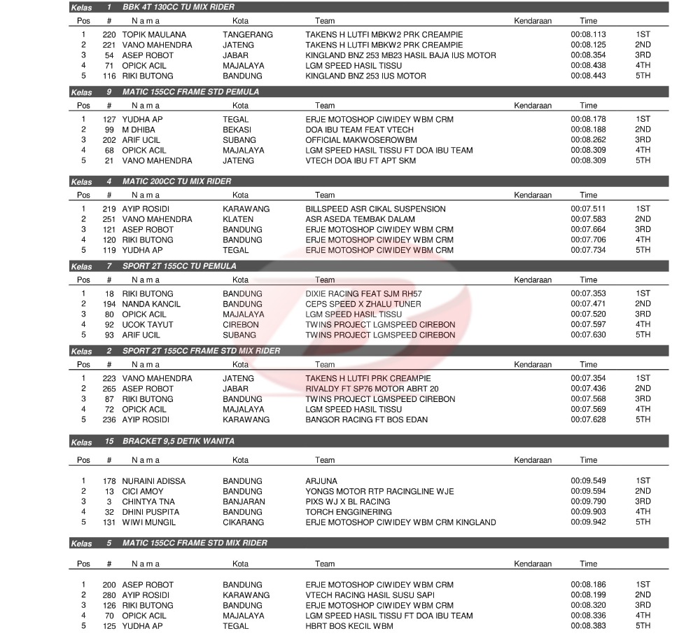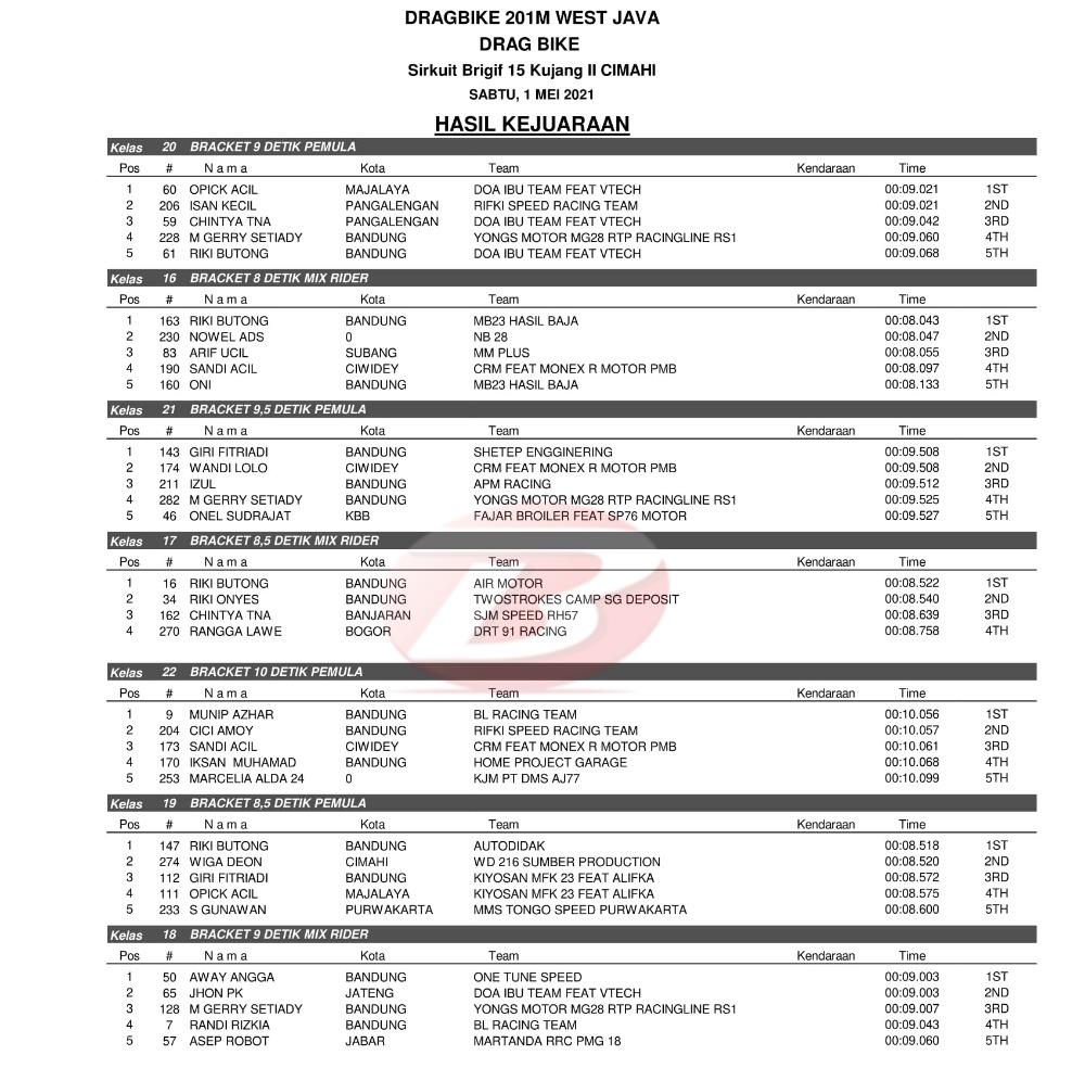 BalapMotor.Net – Berikut kami paparkan hasil kejuaraan balap lurus bertajuk Drag Bike 201M West Java yang berlangsung di sirkuit NP. Brigif 15 Kujang II Cimahi, Jawa Barat pada Sabtu 1 Mei 2021.
