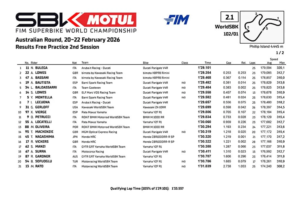 BalapMotor.Net – Berikut merupakan hasil sesi FP dari gelaran WorldSBK ronde pembuka 2026 di sirkuit Phillip Island, Australia hari pertama 20 Februari 2026. Selain kelas utama WorldSBK, ada juga hasil kelas WorldSSP dimana ada Aldi Hendra yang ikut serta. (**)