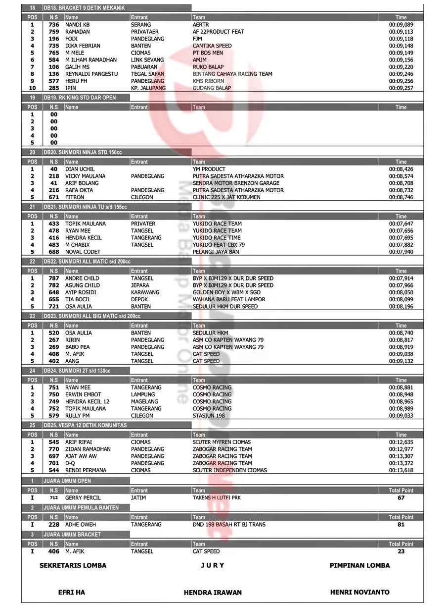 BalapMotor.Net – Berikut merupakan hasil kejuaraan balap lurus bertajuk Yukido Extra Drag Bike Open 2023 yang berlangsung di sirkuit NP. Jl. Syeh Nawawi Al-Bantani KP3B Serang, Banten pada 2-3 September 2023. (***)