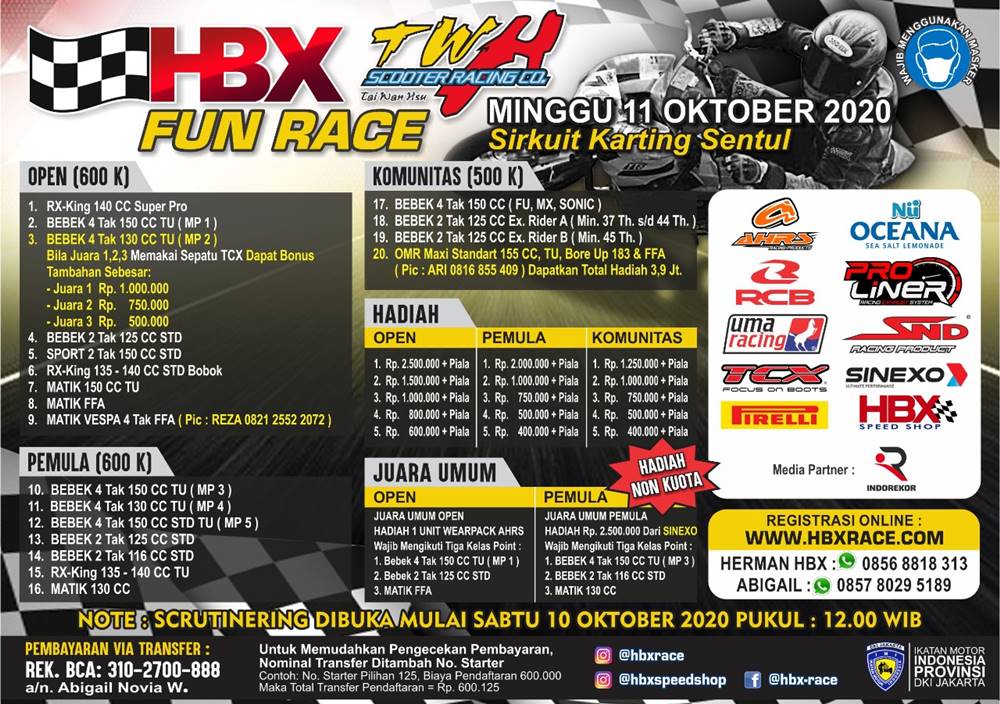 BalapMotor.Net – Sirkuit Sentul Karting, Bogor siap menyajikan event balap lagi pada akhir pekan ini, Minggu 11 Oktober 2020. Kali ini event balap dengan tajuk HBX TWH Fun Race.