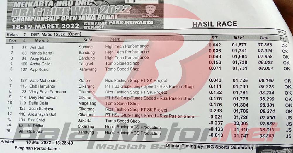 BalapMotor.Net – Pada gelaran Meikarta URO DRC Drag Bike War 2022 di Meikarta (18-19/3), Honda BeAt milik tim High Tech Performance berhasil tampil istimewa pada kelas Matic 155cc Open. Tidak tanggung-tanggung, podium tiga besar jadi milik tim ini.