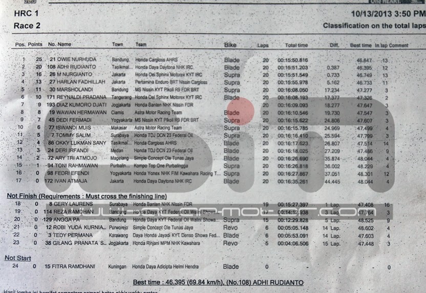 Untuk Race 2 kelas HRC 1 kini giliran Adhi dan Owie menunjukan kelasnya. Owie yang sempat memimpin jauh sejak start  lambat laun didekati oleh M. NUrgianto dan Adhi Rudianto di posisi ke-2 dan ke-3 namun Adhi Bontot mampu menyalip Nurgianto di pertengahan race dan mampu menempel ketat Owie, namun sampai garis finish posisi tidak berubah. Bermain di trek yang cukup tekhnikal ini memang tidak gampang dengan paduan tikungan rolling speed dan chicane serta tikungan putar arah memang tidak gampang dan butuh tekhik yang bagus. Adi Bontot yang baru tahun ini menaiki kuda besi Honda ini mengatakan bahwa dia baru menemukan setingan yang pas untuk menjinakan kuda besi Honda, namun sudah akhir tahun ini bro, Indoprix aja dah selesai tinggal ngehabisin HRC, pokoke Gasspoll. BM