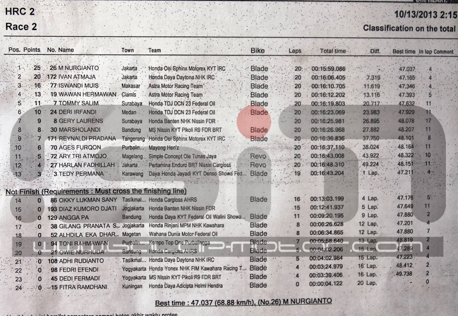 Disaat race 2 HRC 2 mereka berdua duel sengit memperebutkan posisi pertama namun dipertengahan Owie yang memimpin slide dan jatuh dan Adhi tidak bisa menghindar karena posisinya tepat dibelakang Owie dan mereka berdua jatuh. Beruntung Tedy Permana dari Daya Honda Jayadi KYT Denso Showa Federal Oil dia yang berada di posisi ke- 3 langsung memimpin sendirian  hanya dibuntuti M.Nurgianto, namun nasib apes buat Tedy, mesinya ngedrop dan tidak dapat melanjutkan lomba padahal tinggal 3 lap. Yang beruntung berarti M. Nurgianto, pembalap dari tim Honda OEI Sphinx Motorex KYT IRC jadi yang terdepan sampai finish diikuti Ivan Atmaja yang kali ini jadi pengganti Wahyu Widodo rekan setimnya Adhi Bontot.