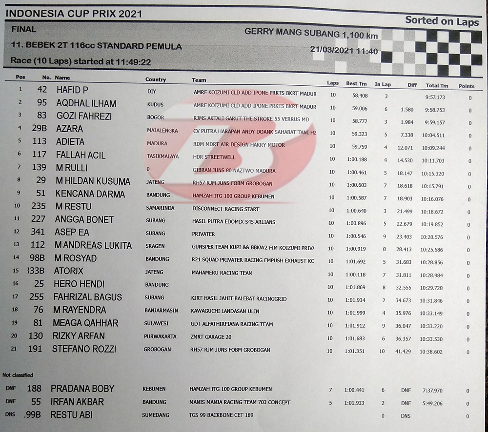 BalapMotor.Net – Pertempuran race final bebek 2T STD 116cc pemula dalam kejuaraan Indonesia Cup Prix (ICP) Round 1 yang berlangsung di sirkuit Gery Mang, Subang, Jabar (21 Maret) berhasil dikuasai oleh tim AMRF Jatim.