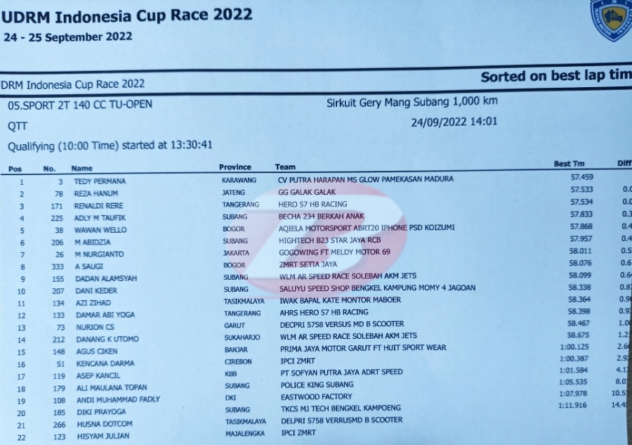 Meskipun di akhir sesi kualifikasi Tedy sempat mengalami trouble pada motornya, namun best time dari pembalap asal Karawang yang memacu RX-KING racikan ABRT20 itu tetap tidak mampu terkejar. Berikut hasil lengkapnya: