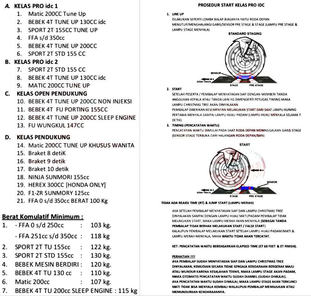 Selain itu, IDC Pro 1 akan menggunakan sistem kualifikasi. Dimana enam kelas poin tersebut akan dijalankan dengan catatan waktu ET. Tidak menggunakan RT. Hal yang sama berlaku untuk final IDC Pro 2 yang juga dijalankan di hari Sabtu .