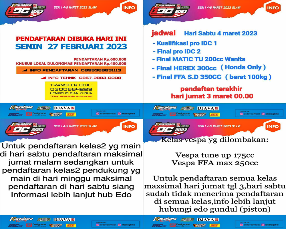 Sebagai salah satu ajang balap lurus paling bergengsi di Indonesia, IDC tahun ini akan menyuguhkan pertarungan yang lebih seru dan menarik. Selain itu pastinya hadiah besar yang sangat memuaskan.